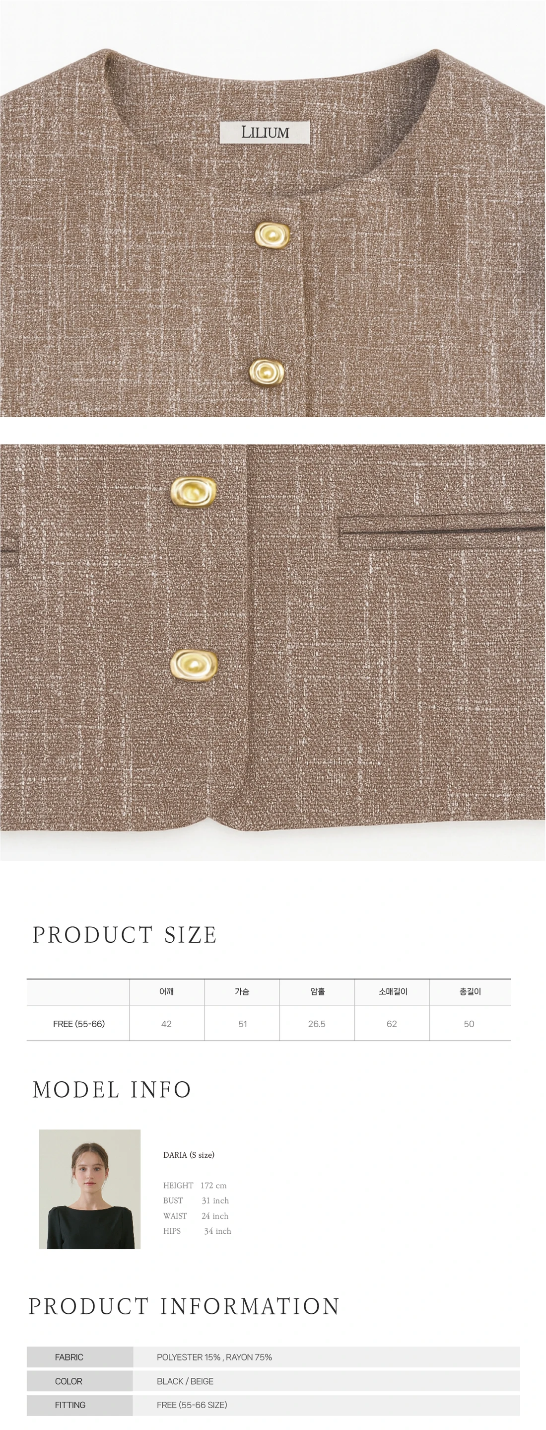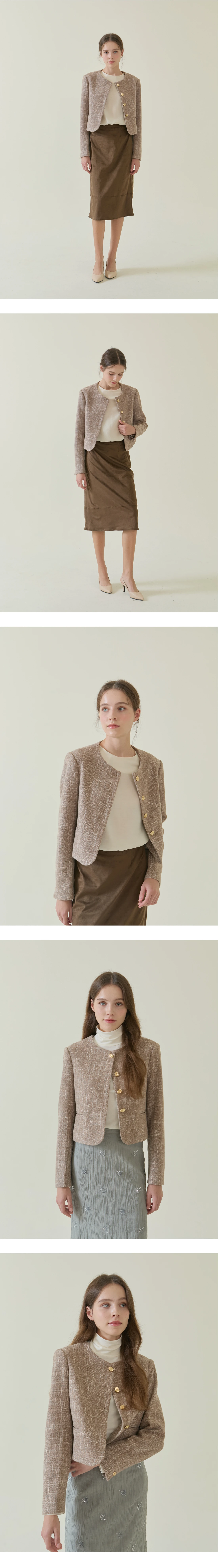 穏やかな午後の温もりをまとったかのように、優しく包み込むAmble Jacketです。ポリエステルとレーヨンの混紡素材で仕立てられ、軽やかでしなやかな質感が自然なシルエットを演出します。 控えめなラウンドネックとクロップ丈が、きちんと感と上品さのバランスを整えます。マットゴールドカラーのユニークなボタンは光に応じてさりげなく反射し、洗練されたアクセントに。 Amble Round Crop Jacketは、季節の変わり目にも柔らかく寄り添う、Liliumのクラシックムードを象徴する一着です。
