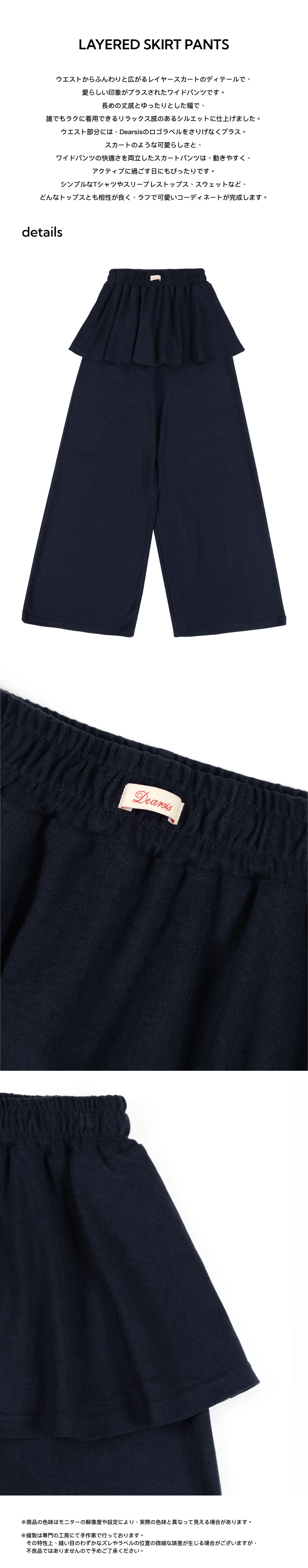 ウエストからふんわりと広がるレイヤースカートのディテールが、愛らしい印象をプラスされたワイドパンツです。長めの丈感とゆったりとした幅で、誰でもラクに着用できるリラックス感のあるシルエットに仕上げました。ウエスト部分には、dearsisのロゴラベルをさりげなくプラス。 スカートのような可愛らしさと、ワイドパンツの快適さを両立したスカートパンツは、動きやすく、アクティブに過ごす日にもぴったりです。 シンプルなTシャツやスリーブレストップス、スウェットなど、どんなトップスとも相性が良く、ラフで可愛いコーディネートが完成します。