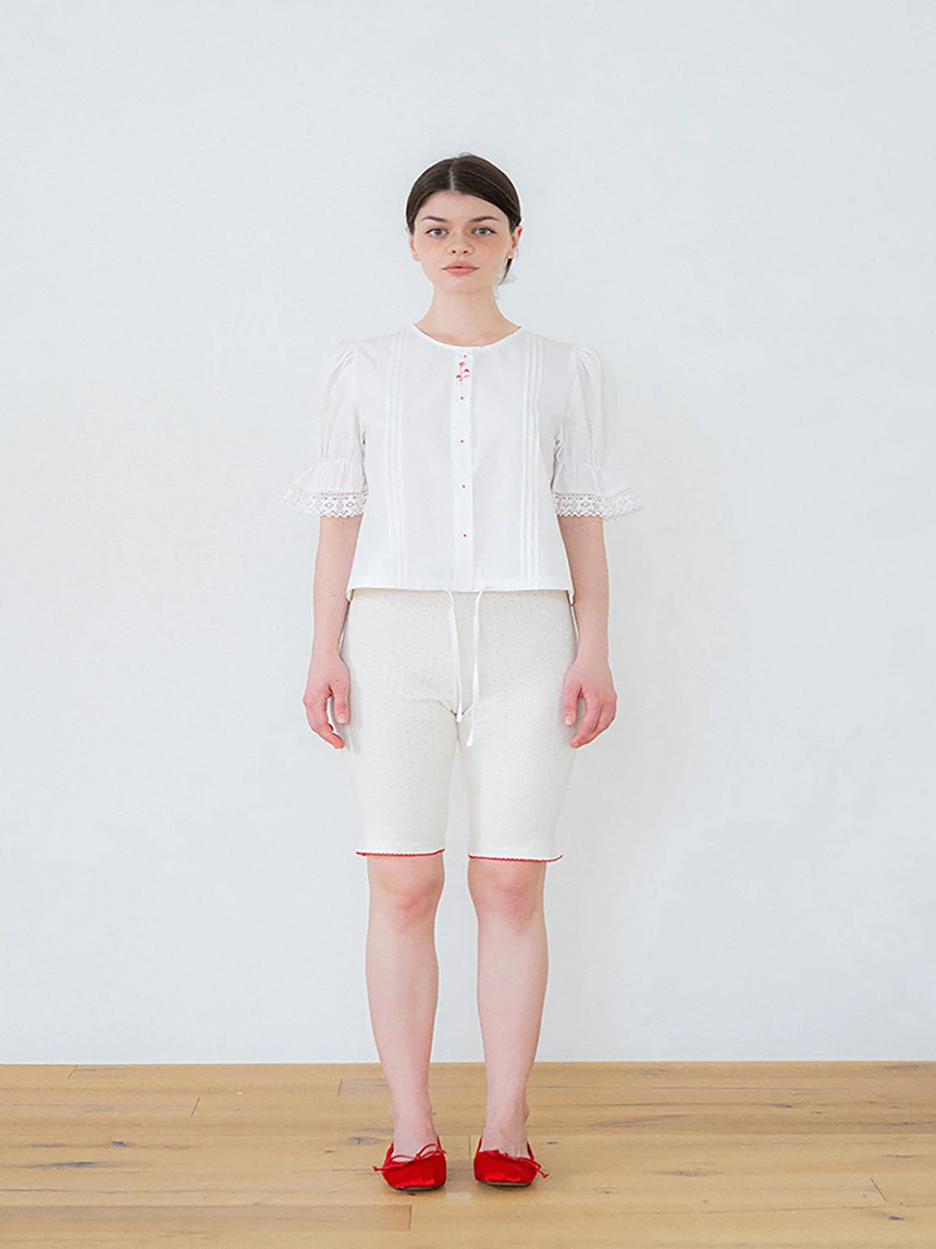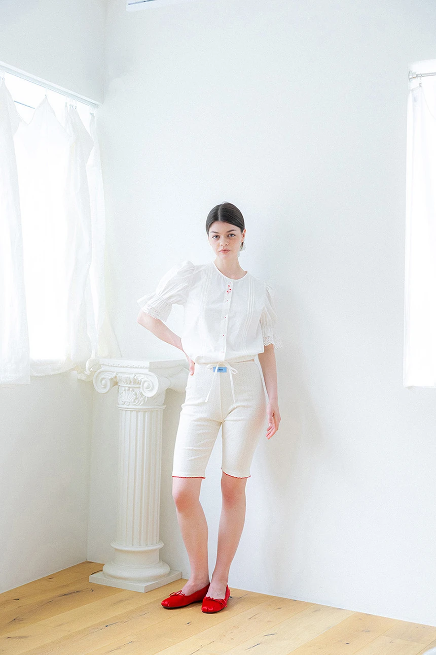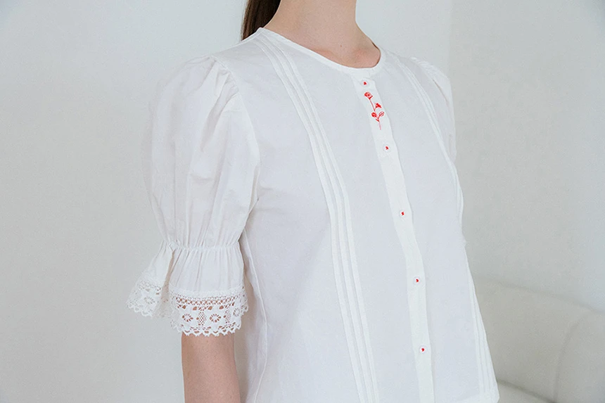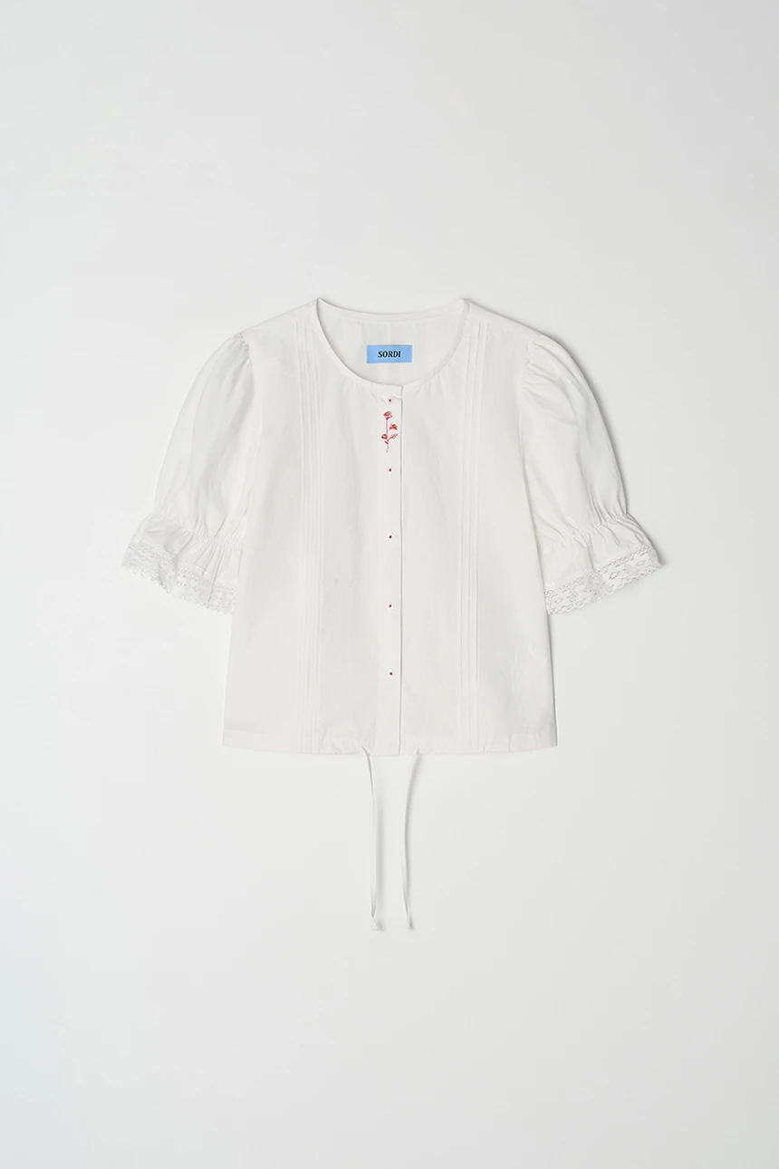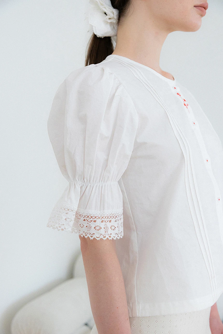 控えめなディテールが愛らしいヴィンテージムードのブラウス。ストレートラインフィットのボリュームあるパフスリーブとレーストリミングがラブリーなポイントに。ピンタックディテールとヴィンテージ調のフラワー刺繍でユニークな印象を与え、軽やかで柔らかいコットン素材で快適な着心地です。裾の紐で調節可能、ロマンチックかつフェミニンなデイリールックにぴったりの一着。