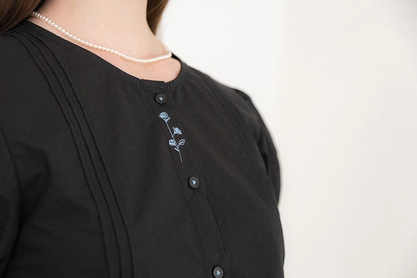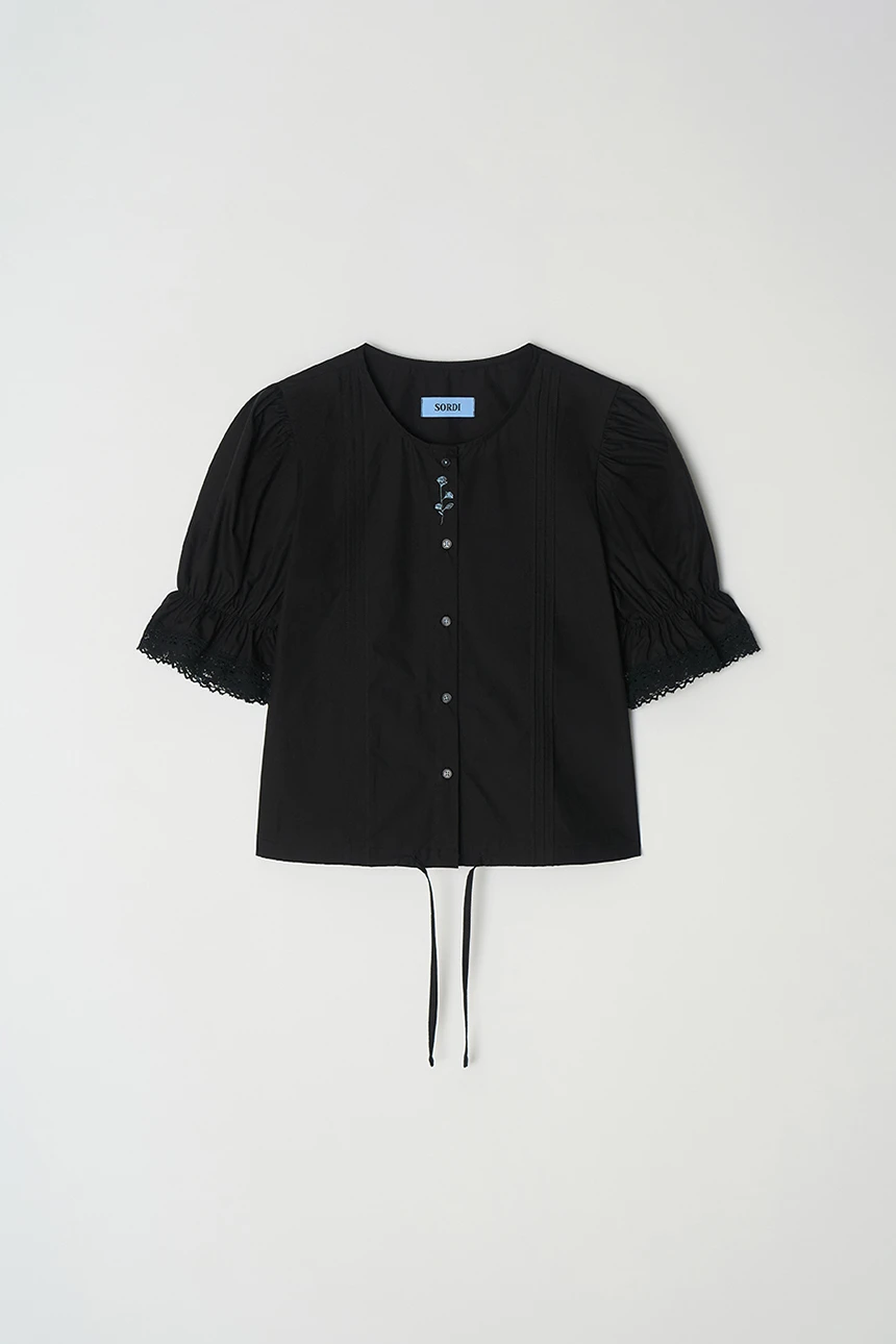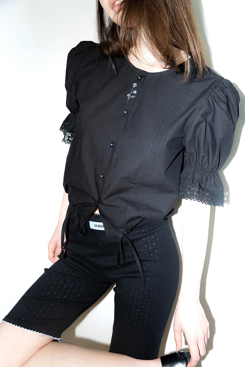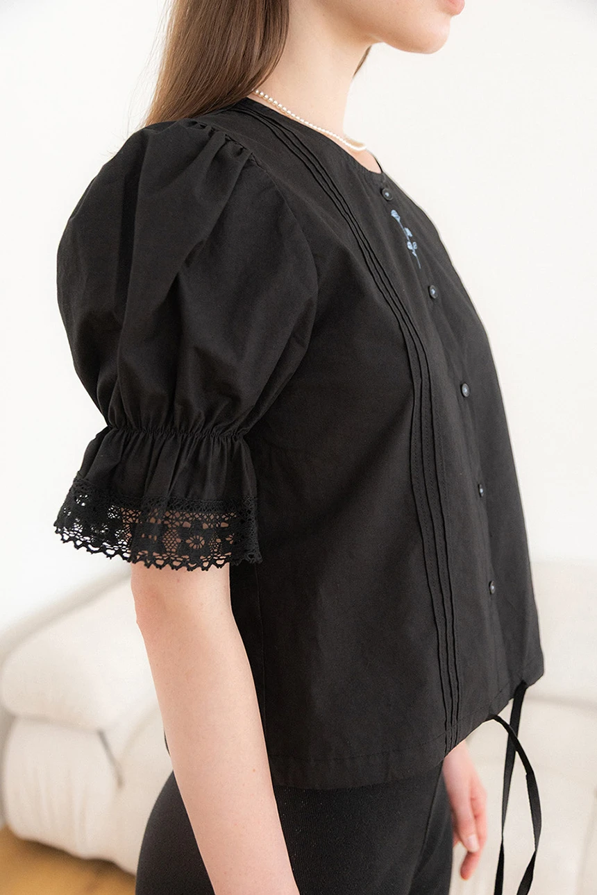 細やかなディテールが愛らしい、ヴィンテージムードのブラウス。ストレートラインのシルエットにボリューム感のあるパフスリーブとレーストリミングがラブリーポイントになっています。ピンタックディテールとヴィンテージ風のフラワー刺繍が加わり、ユニークな雰囲気を演出。軽く柔らかなコットン素材で着心地も抜群です。裾の紐で調節が可能で、ロマンティックかつフェミニンなデイリールックにぴったりの一着です。