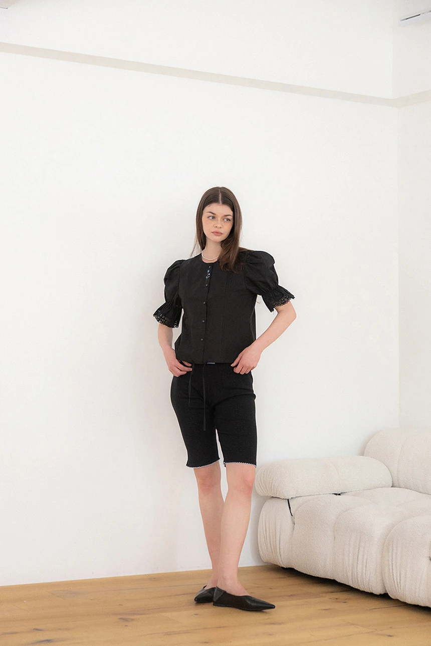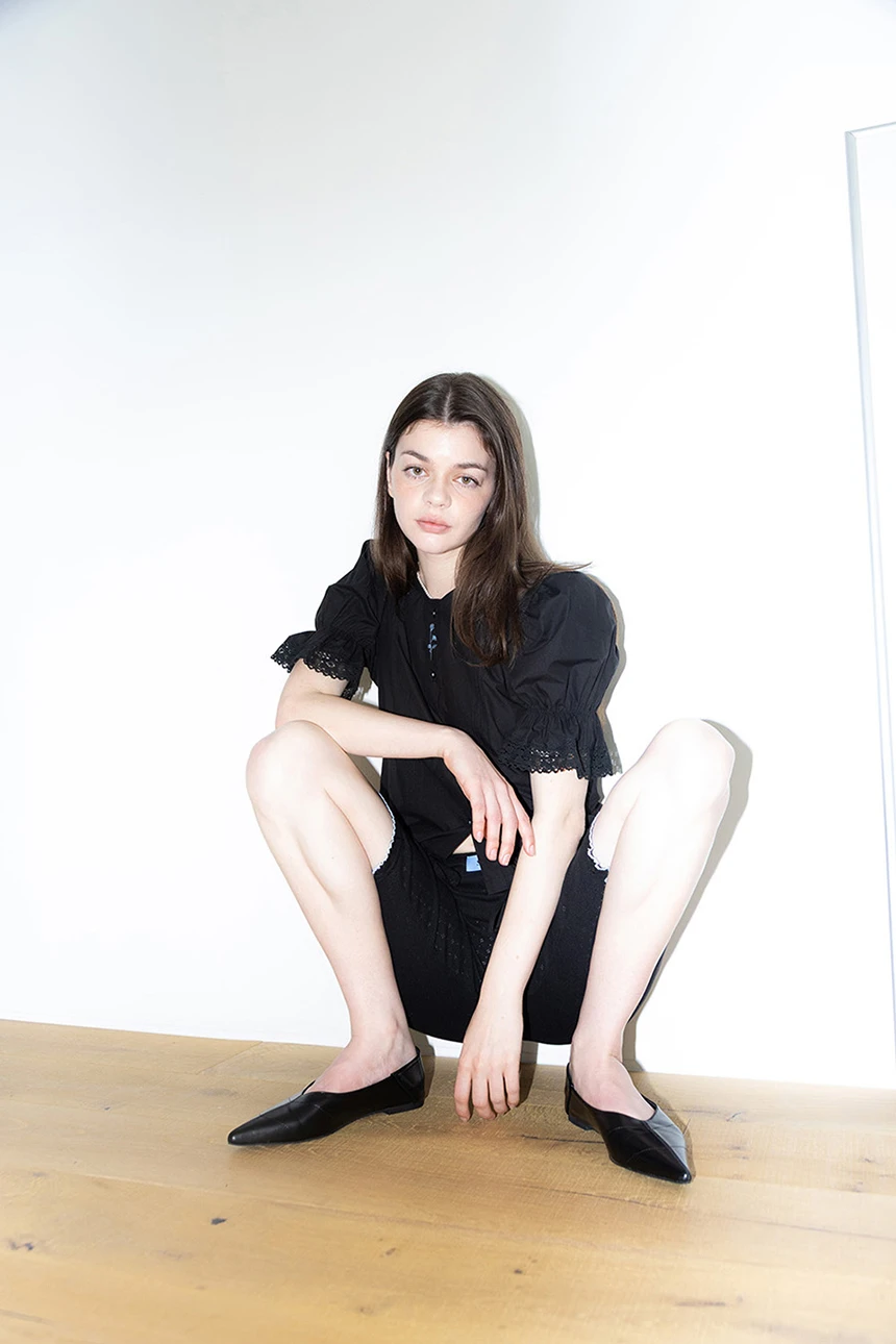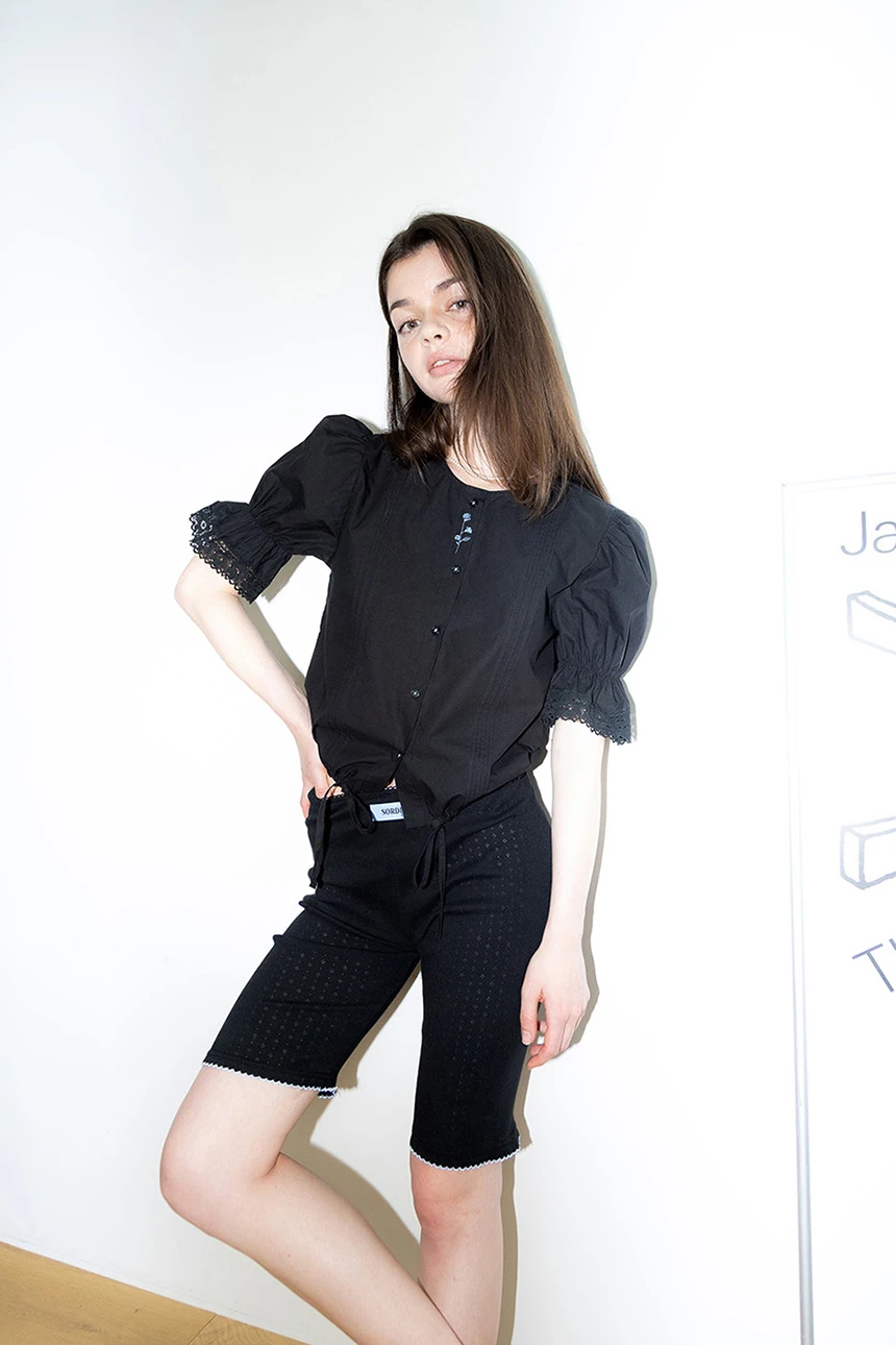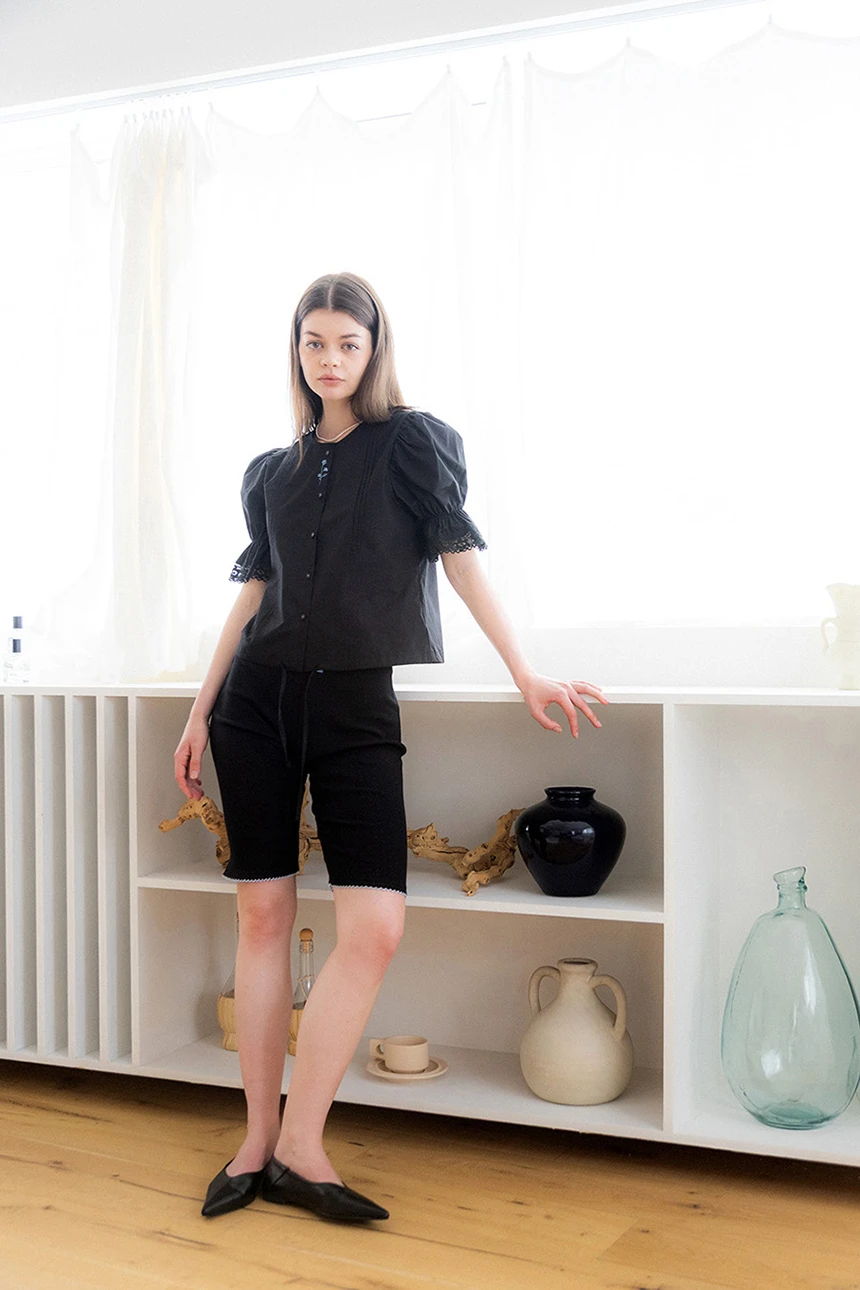 細やかなディテールが愛らしい、ヴィンテージムードのブラウス。ストレートラインのシルエットにボリューム感のあるパフスリーブとレーストリミングがラブリーポイントになっています。ピンタックディテールとヴィンテージ風のフラワー刺繍が加わり、ユニークな雰囲気を演出。軽く柔らかなコットン素材で着心地も抜群です。裾の紐で調節が可能で、ロマンティックかつフェミニンなデイリールックにぴったりの一着です。