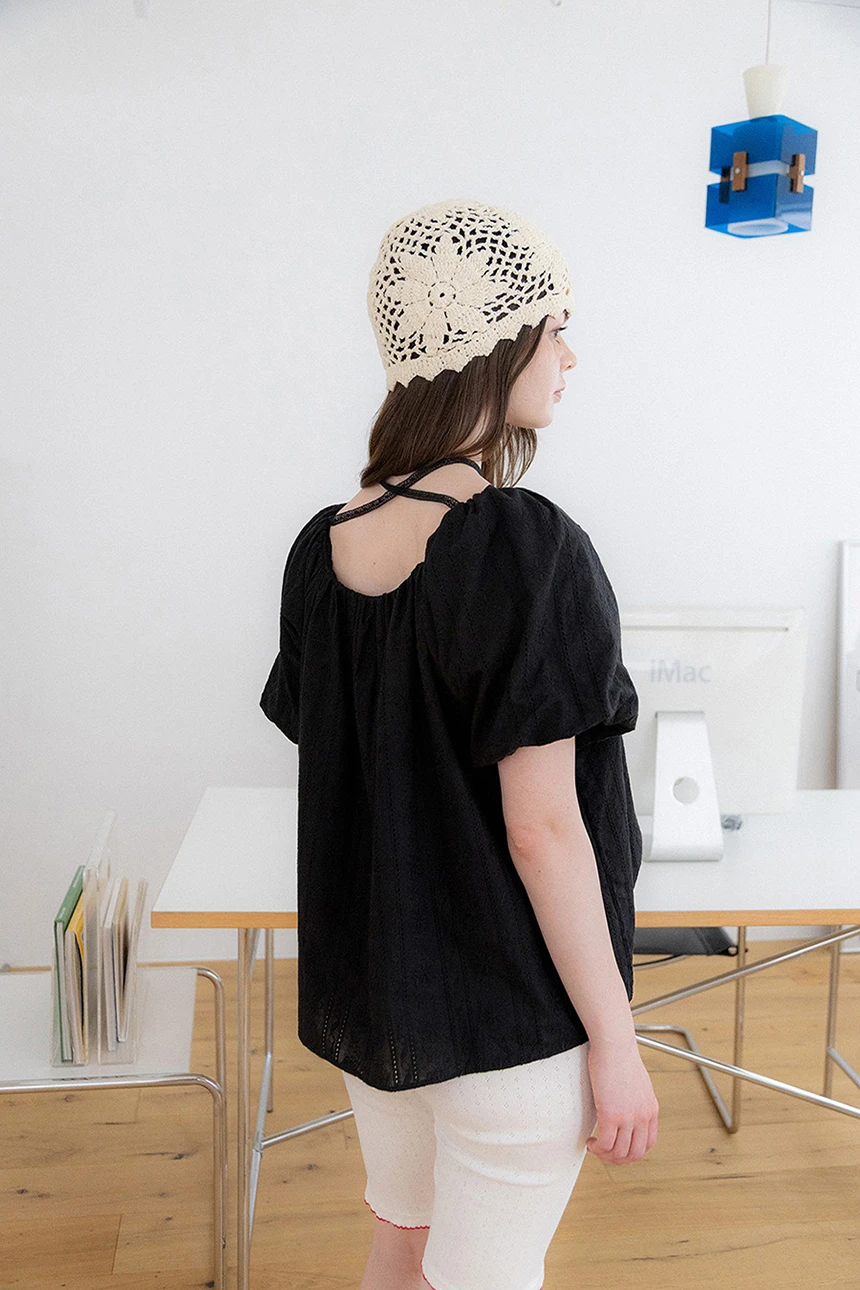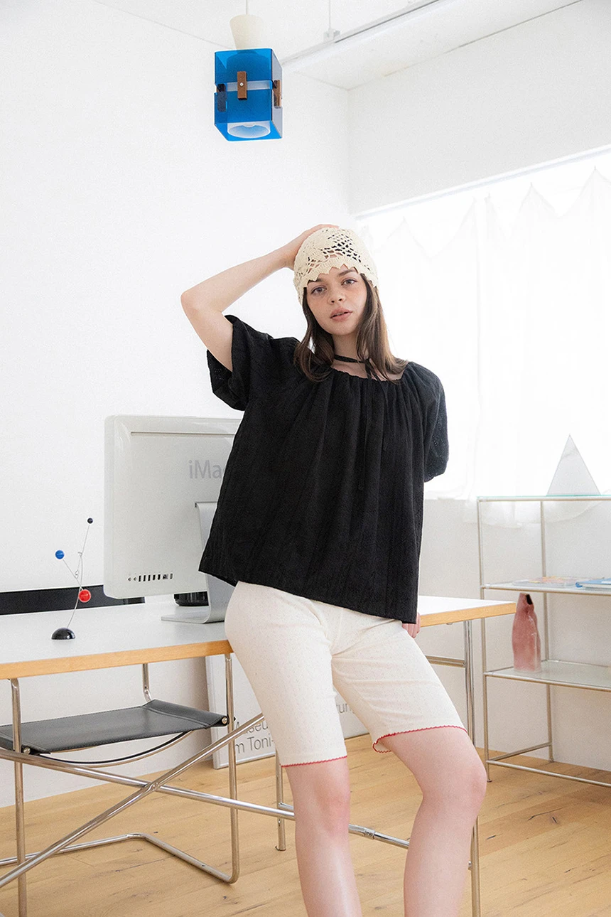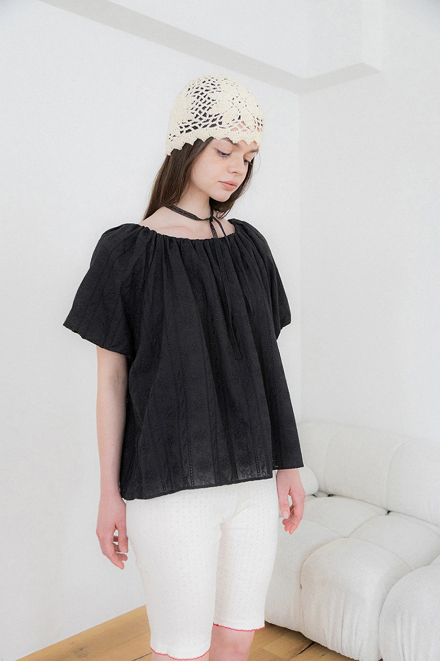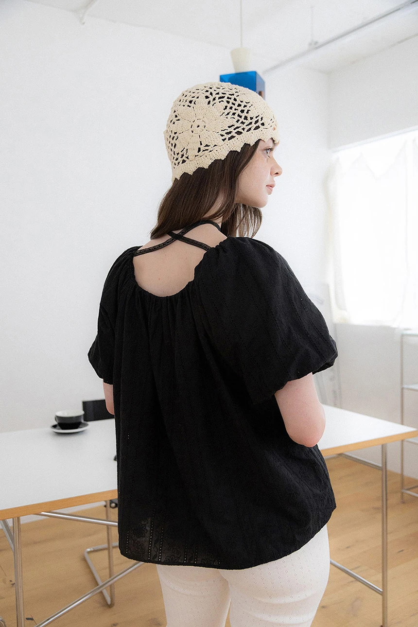 ネックラインに施されたシャーリングディテールとレースがポイントのパフブラウス。控えめなパンチング刺繍のテクスチャーがあるコットン素材で、着用時に自然に落ちるシルエットが軽やかでナチュラルな印象です。広めの袖とゆとりのある身幅で体型カバーにも優れています。ネックラインはゴム仕様でオフショルダーとしても着用可能。レースのリボン使いでさまざまなムードを演出できます。透け防止の裏地付きで着心地も快適。単独での着用はもちろん、軽やかでシックにコーディネートできるため、デイリーからバカンススタイルまで幅広く活躍する一着です。