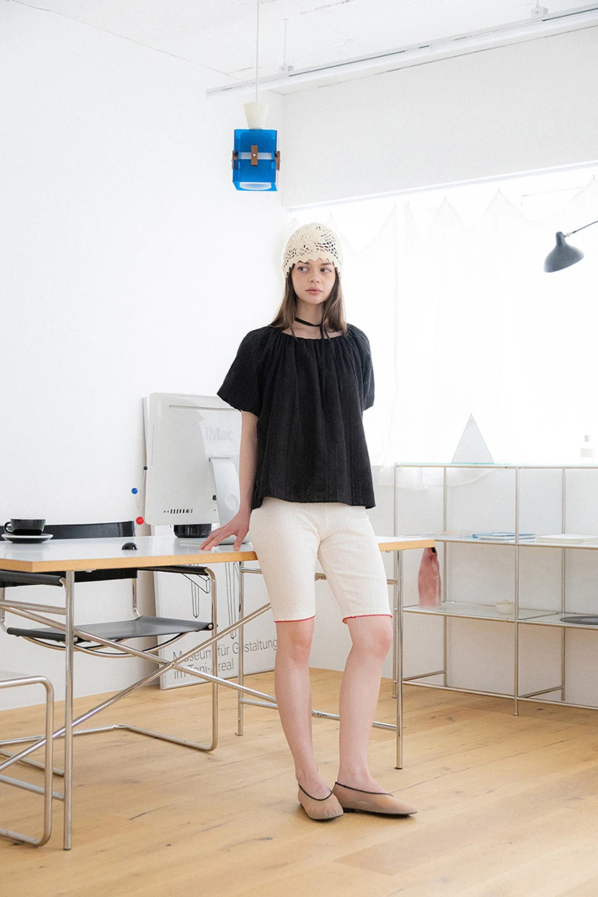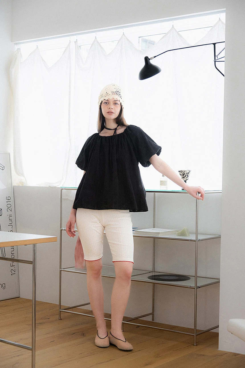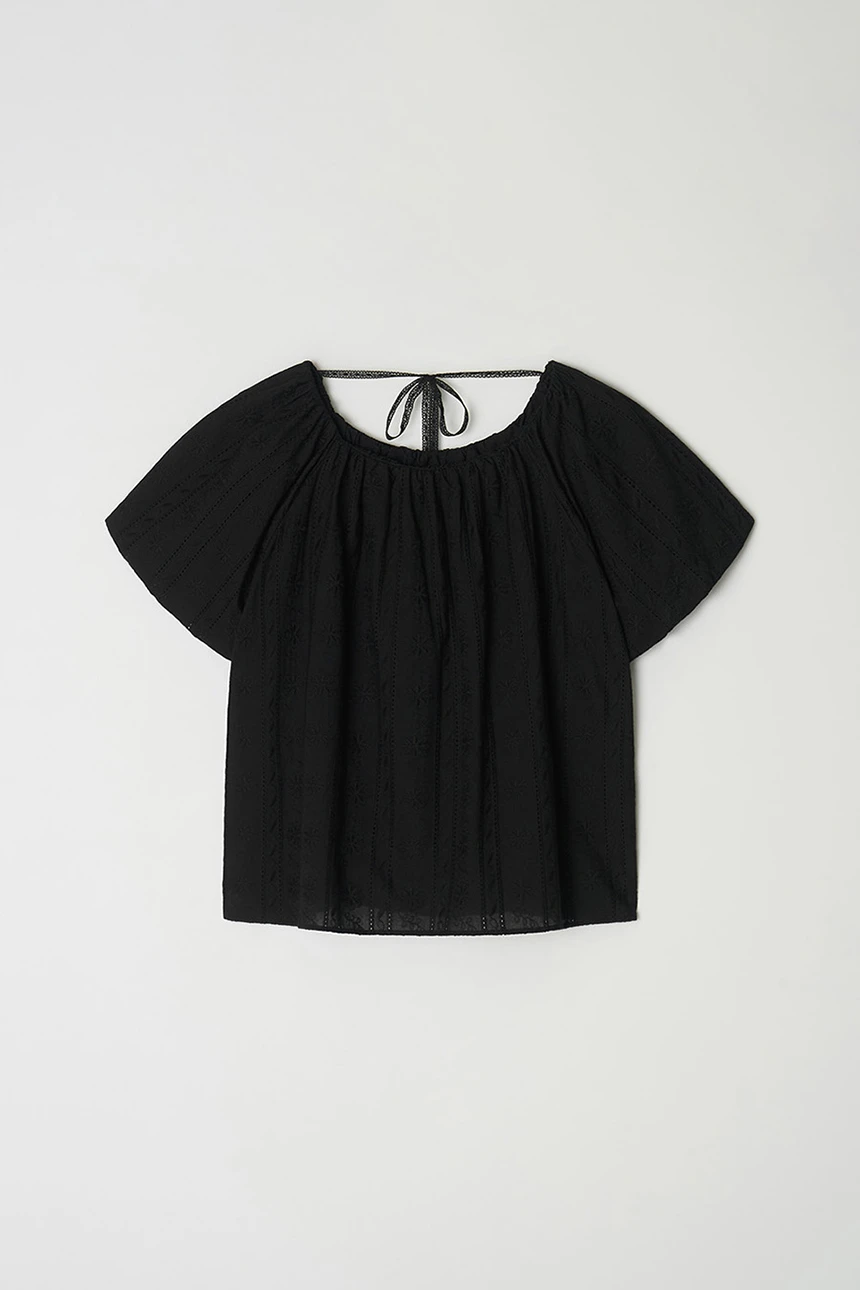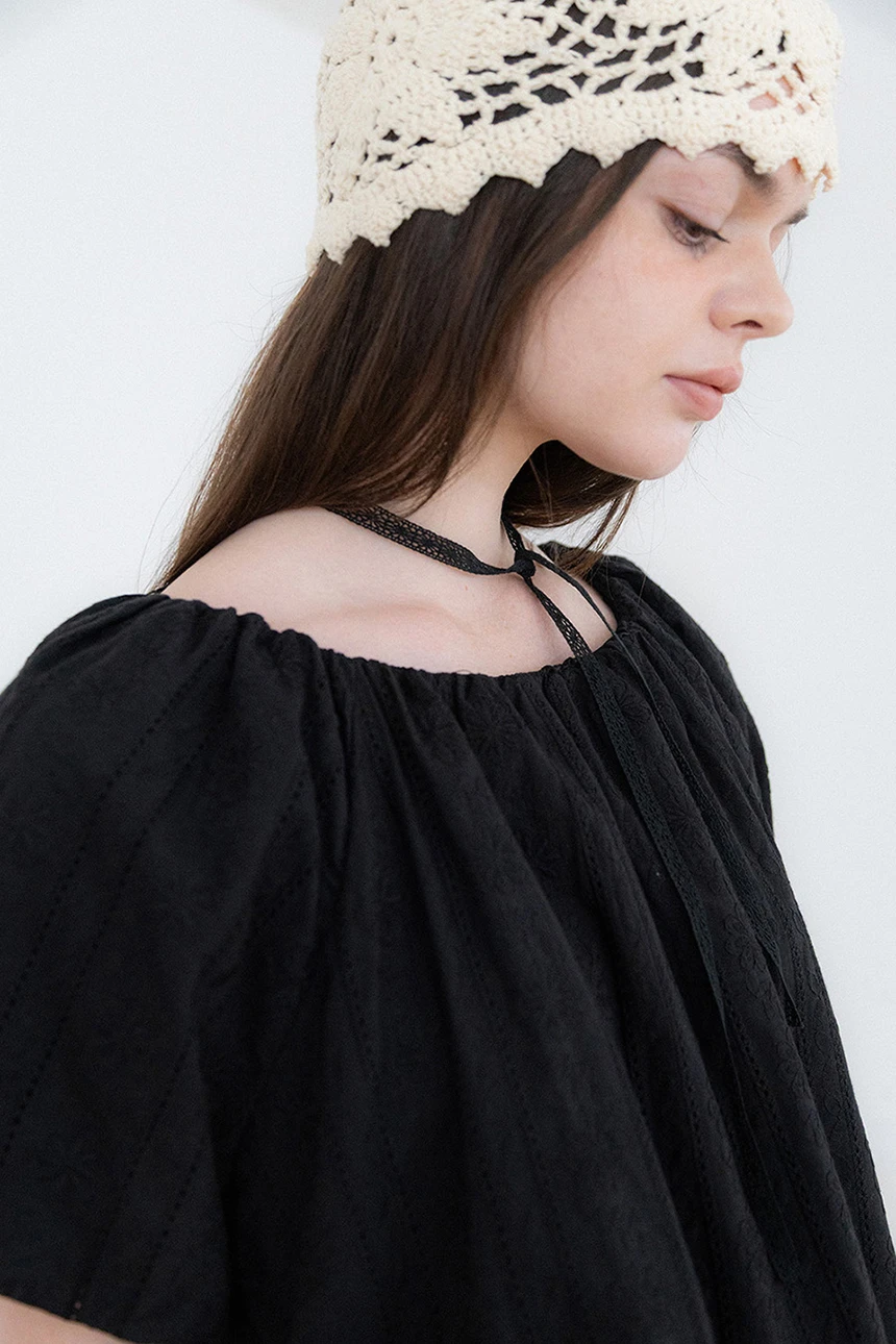 ネックラインに施されたシャーリングディテールとレースがポイントのパフブラウス。控えめなパンチング刺繍のテクスチャーがあるコットン素材で、着用時に自然に落ちるシルエットが軽やかでナチュラルな印象です。広めの袖とゆとりのある身幅で体型カバーにも優れています。ネックラインはゴム仕様でオフショルダーとしても着用可能。レースのリボン使いでさまざまなムードを演出できます。透け防止の裏地付きで着心地も快適。単独での着用はもちろん、軽やかでシックにコーディネートできるため、デイリーからバカンススタイルまで幅広く活躍する一着です。