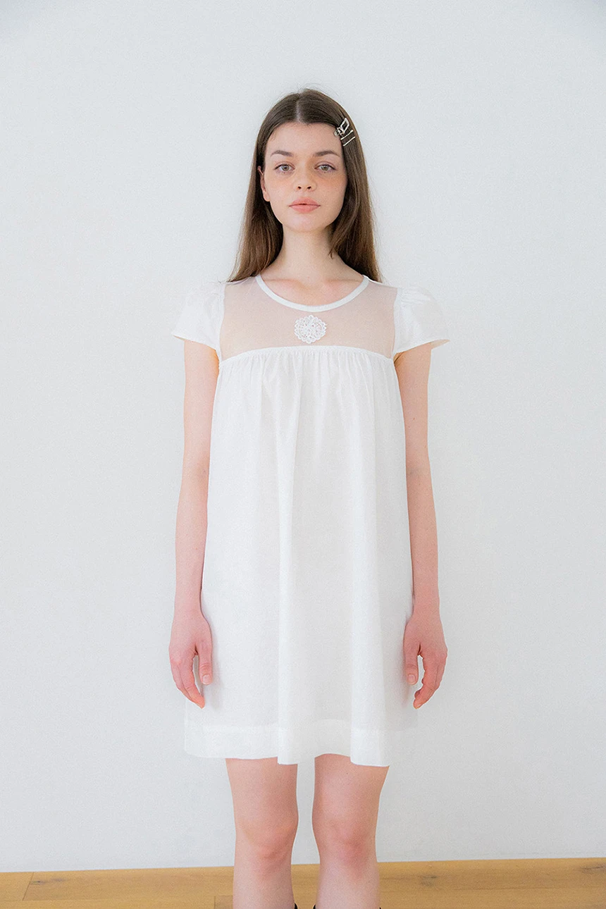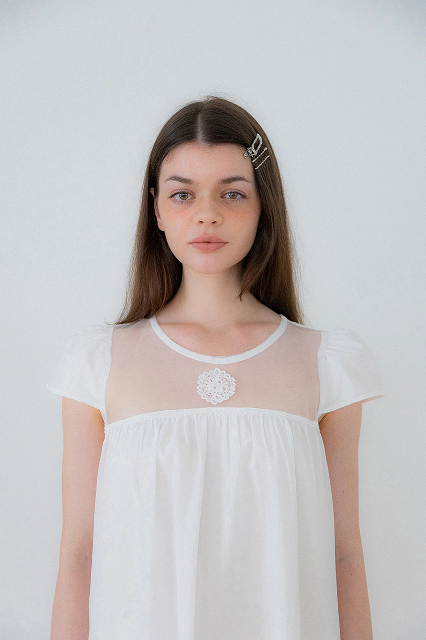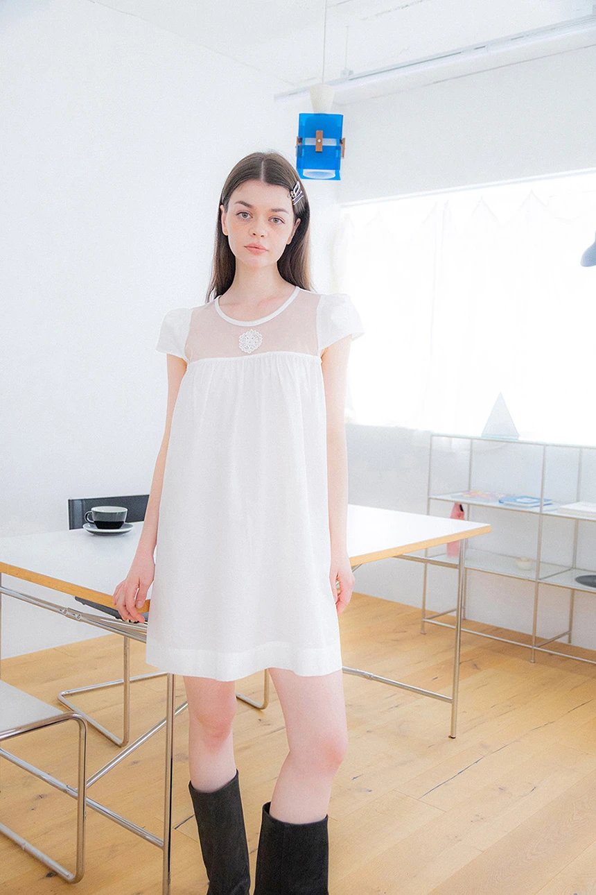 フェミニンで愛らしいムードあふれるベビードールフィットのワンピース。控えめな透け感が魅力のメッシュ素材とモチーフレースのディテールがポイントとなり、ロマンティックで少女らしい雰囲気を演出します。膝上丈の可愛らしい着丈とパフスリーブで、1枚で着用しても十分に存在感のあるラブリーなアイテムです。 COLOR : white FABRIC: Cotton 100% / P 100% (Mesh) CARE:ドライクリーニング/蛍光増白剤・漂白剤の使用不可/日陰で平干し乾燥/乾燥機使用禁止 Made in Korea