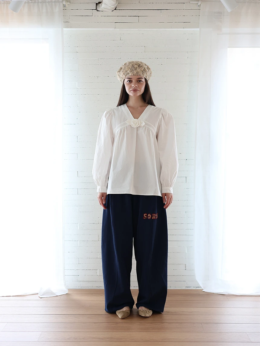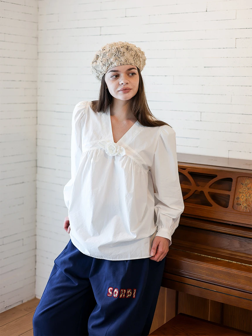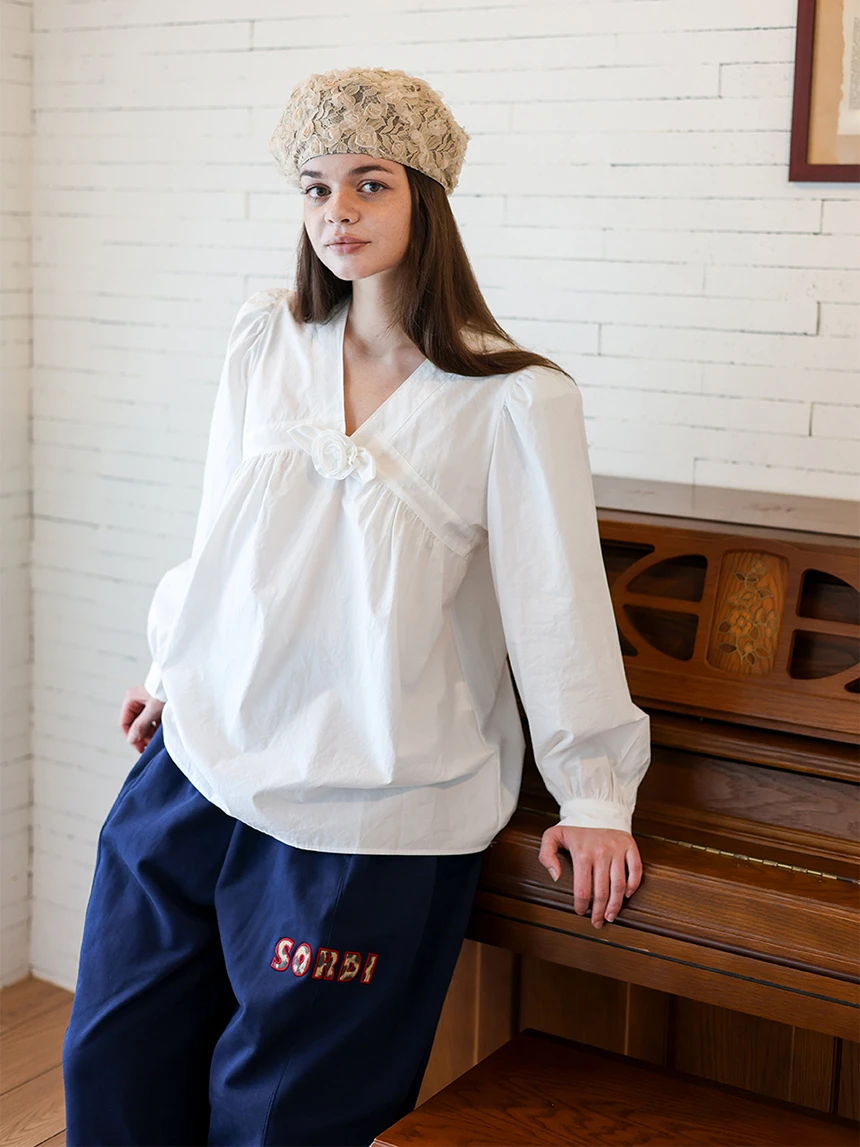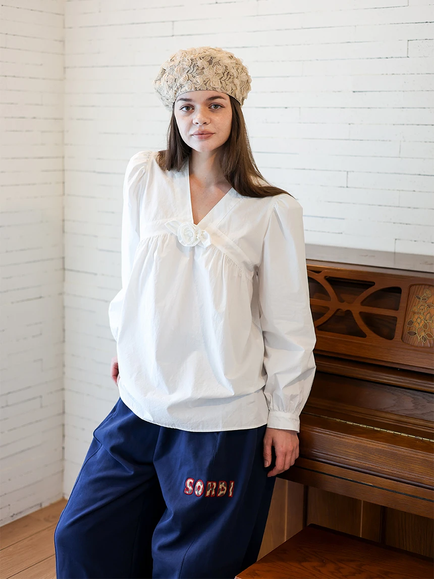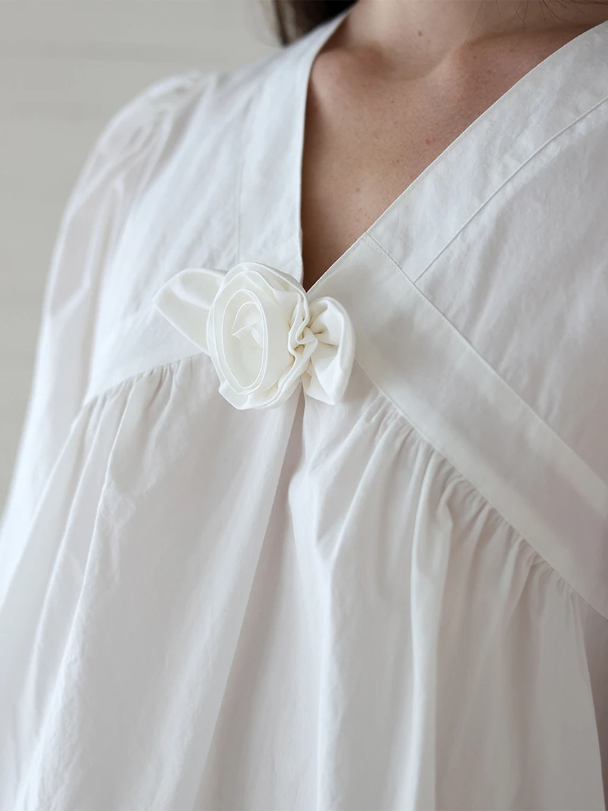 すっきりとしながらもロマンティックなムードを持つブラウス。フロントラインには取り外し可能なローズブローチがあしらわれ、クラシックな雰囲気をプラス。ルーズに落ちるパフスリーブがフェミニンなシルエットを演出します。快適でありながら上品なスタイルにも活用できるアイテムです。 COLOR : white FABRIC: Cotton 100% CARE:ドライクリーニング/単独手洗い/蛍光増白剤・漂白剤の使用不可/日陰で平干し乾燥/乾燥機使用禁止 Made in Korea