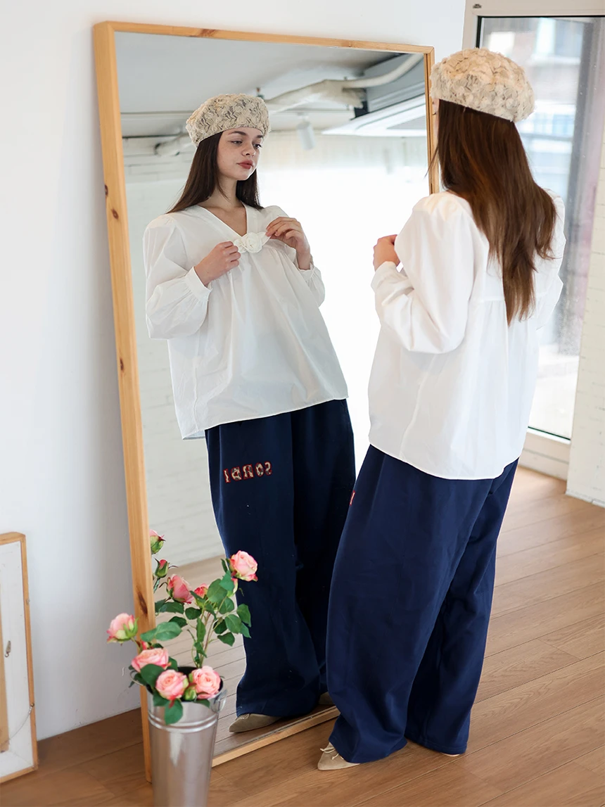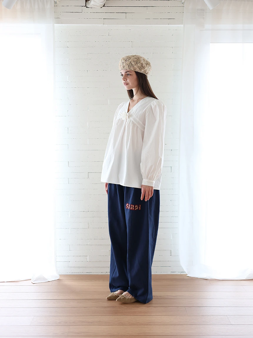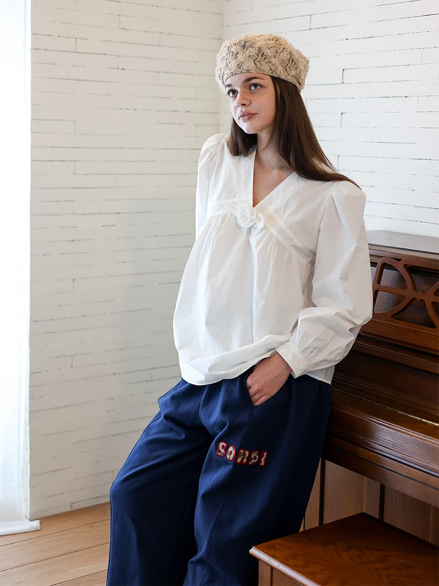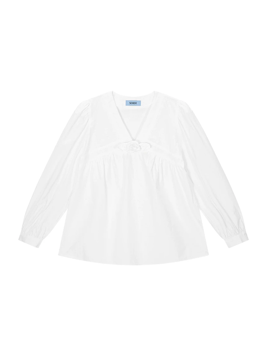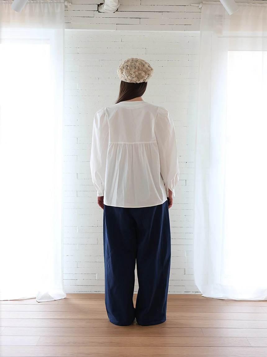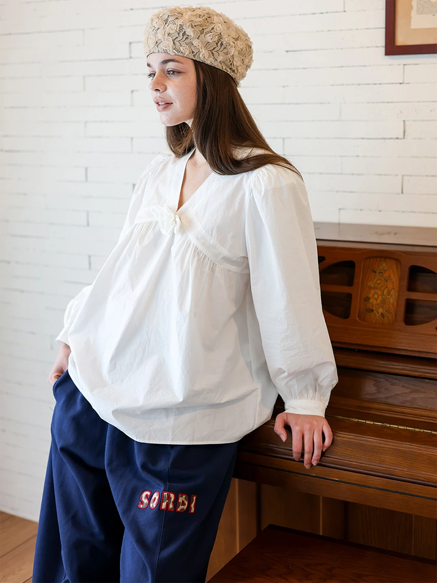 すっきりとしながらもロマンティックなムードを持つブラウス。フロントラインには取り外し可能なローズブローチがあしらわれ、クラシックな雰囲気をプラス。ルーズに落ちるパフスリーブがフェミニンなシルエットを演出します。快適でありながら上品なスタイルにも活用できるアイテムです。 COLOR : white FABRIC: Cotton 100% CARE:ドライクリーニング/単独手洗い/蛍光増白剤・漂白剤の使用不可/日陰で平干し乾燥/乾燥機使用禁止 Made in Korea