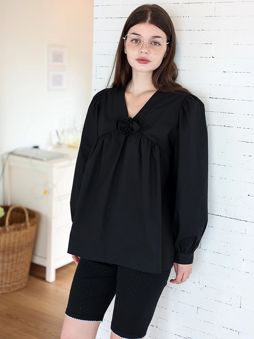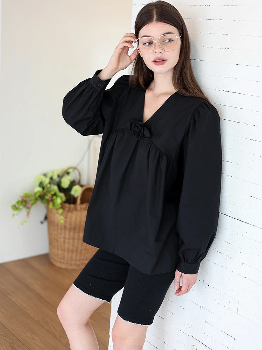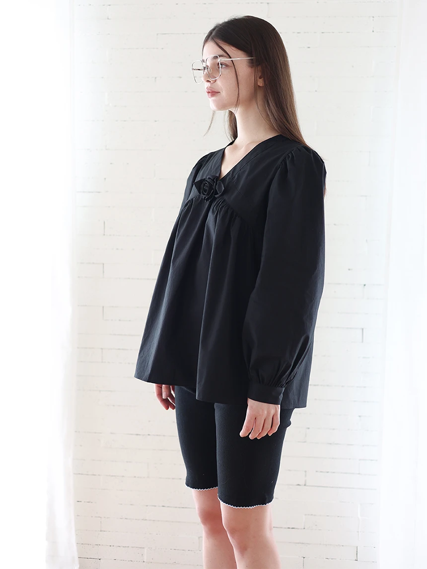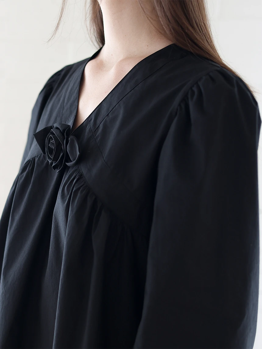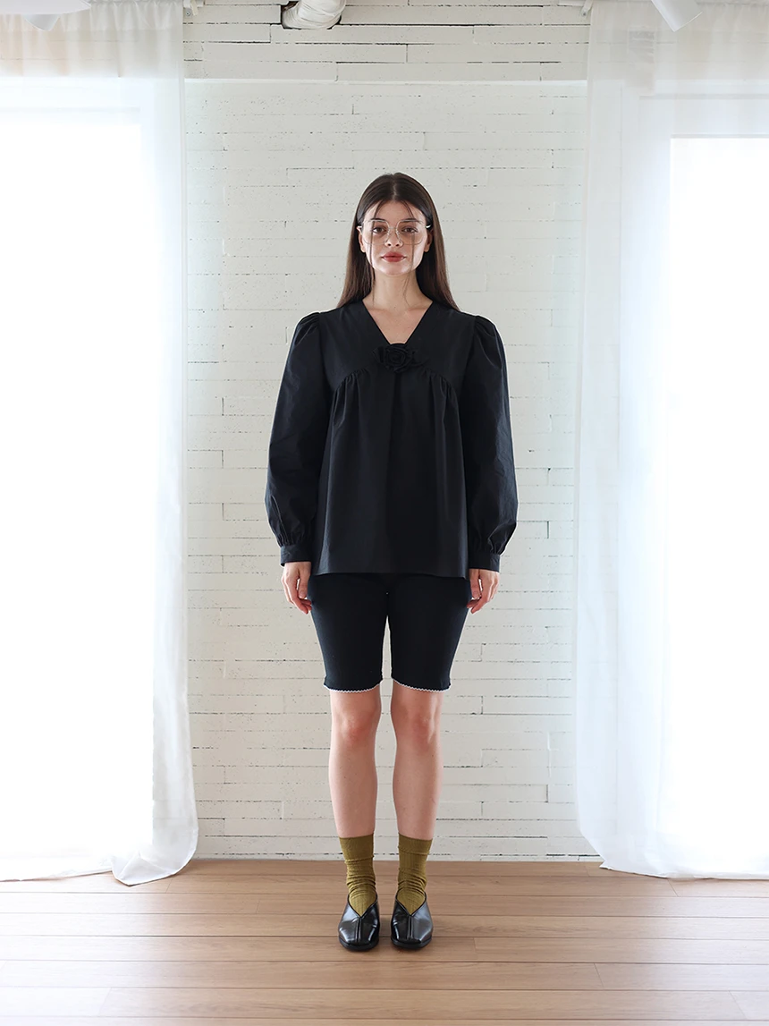 すっきりとしながらもロマンティックなムードを持つブラウス。フロントラインには取り外し可能なローズブローチがあしらわれ、クラシックな雰囲気をプラス。ルーズに落ちるパフスリーブがフェミニンなシルエットを演出します。快適でありながら上品なスタイルにも活用できるアイテムです。 COLOR : black FABRIC: Cotton 100% CARE:ドライクリーニング/単独手洗い/蛍光増白剤・漂白剤の使用不可/日陰で平干し乾燥/乾燥機使用禁止 Made in Korea