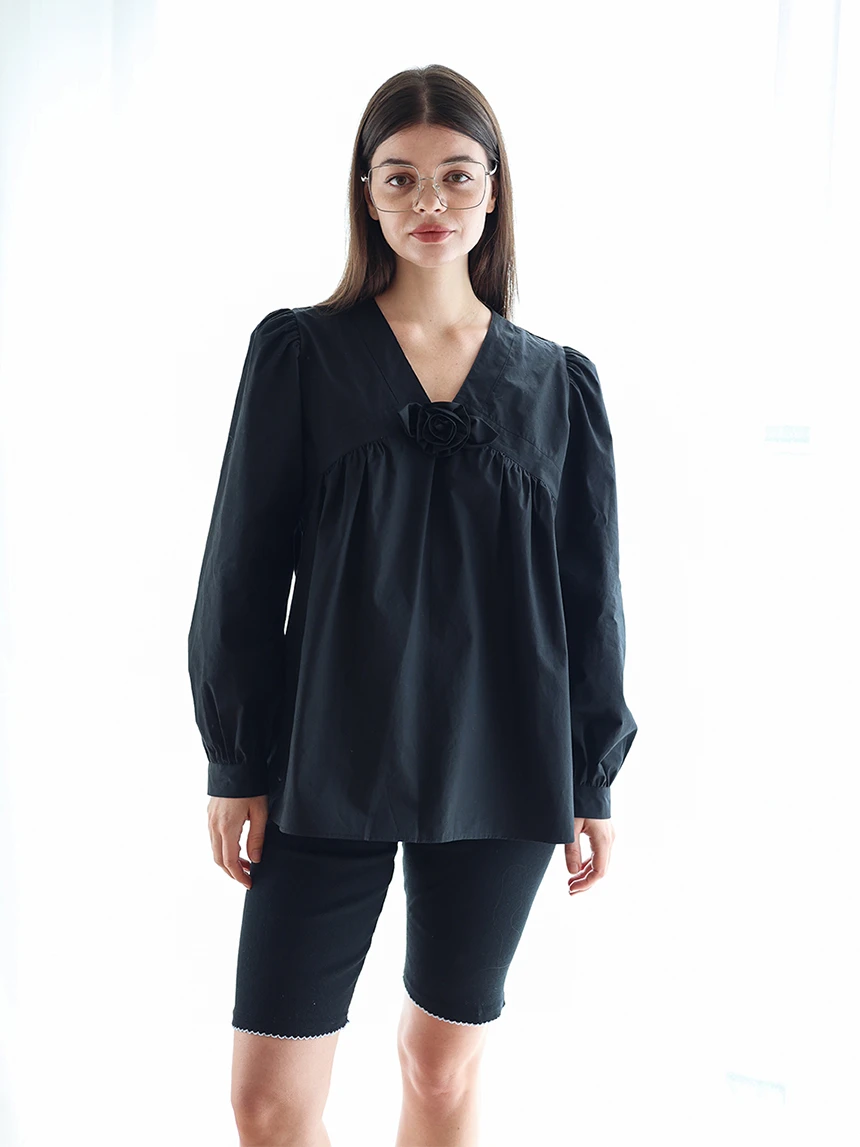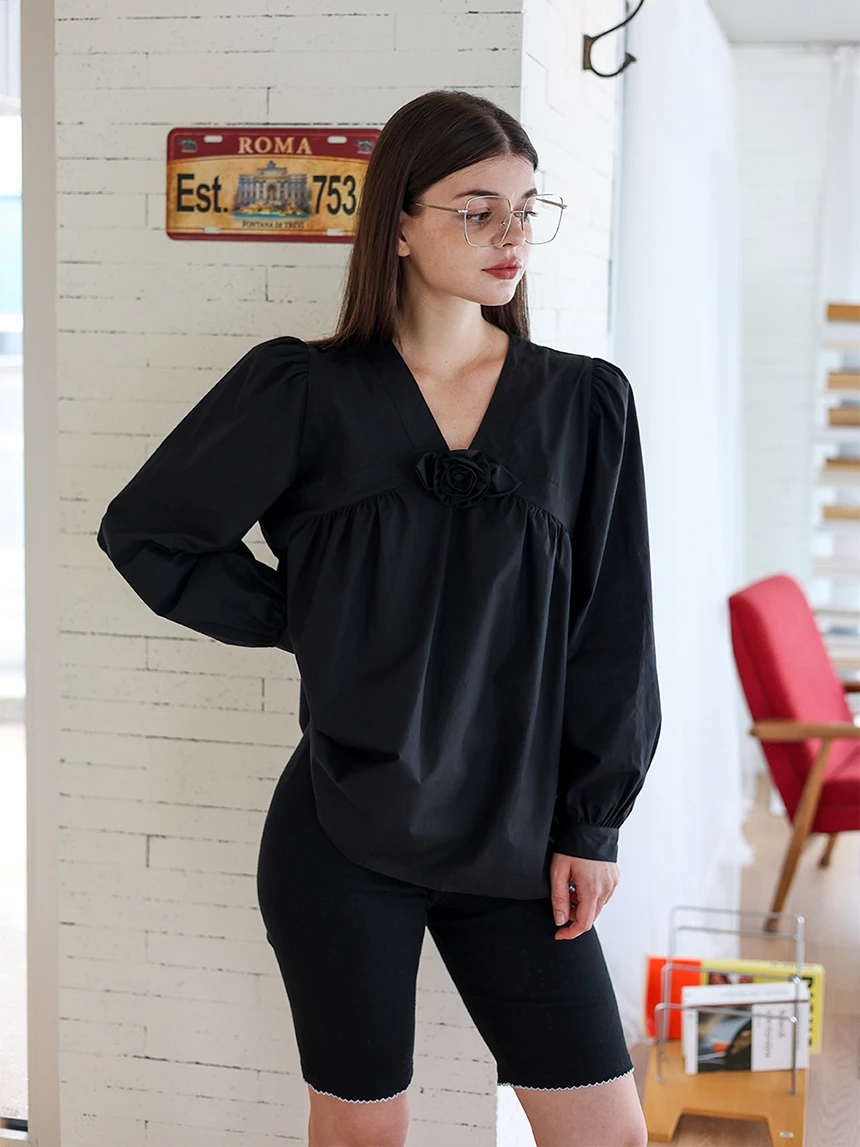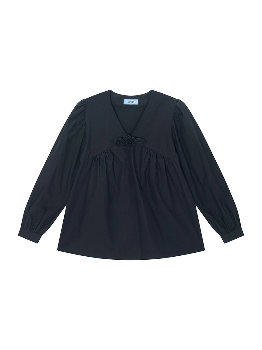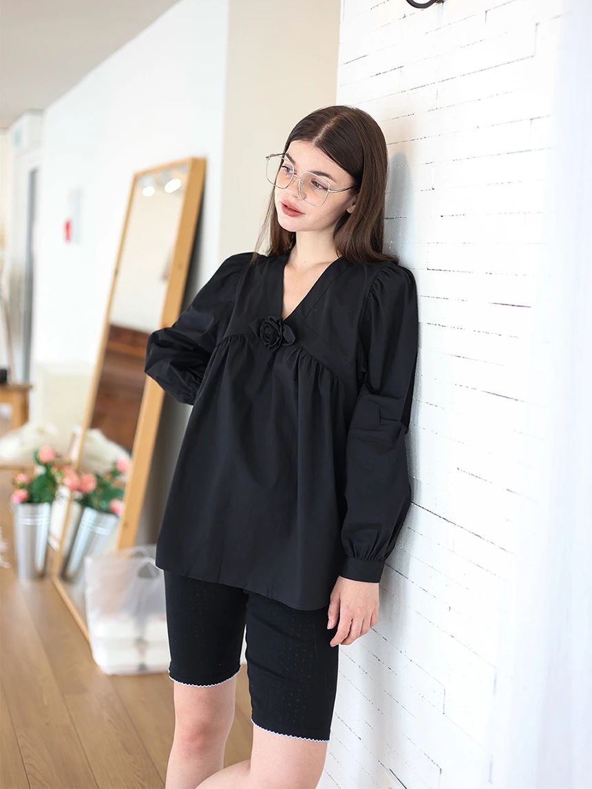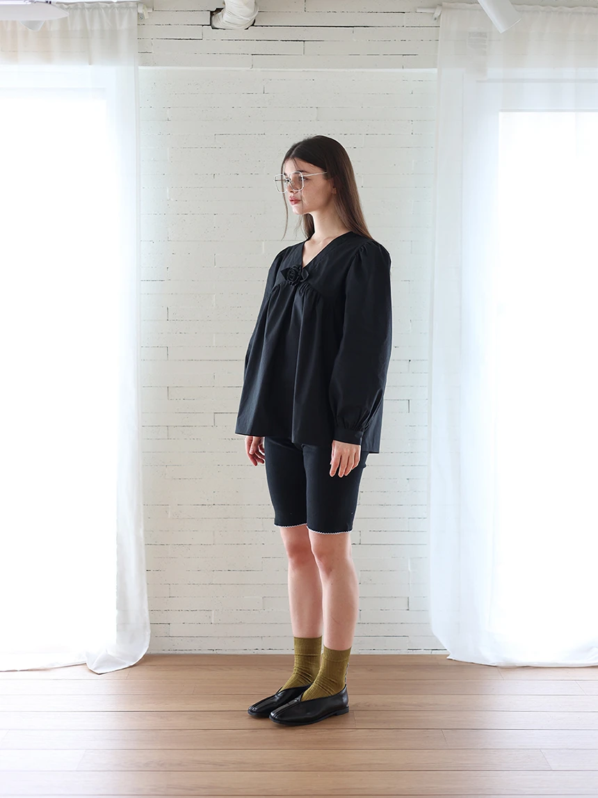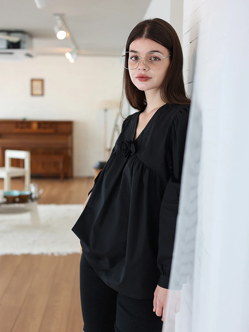 すっきりとしながらもロマンティックなムードを持つブラウス。フロントラインには取り外し可能なローズブローチがあしらわれ、クラシックな雰囲気をプラス。ルーズに落ちるパフスリーブがフェミニンなシルエットを演出します。快適でありながら上品なスタイルにも活用できるアイテムです。 COLOR : black FABRIC: Cotton 100% CARE:ドライクリーニング/単独手洗い/蛍光増白剤・漂白剤の使用不可/日陰で平干し乾燥/乾燥機使用禁止 Made in Korea