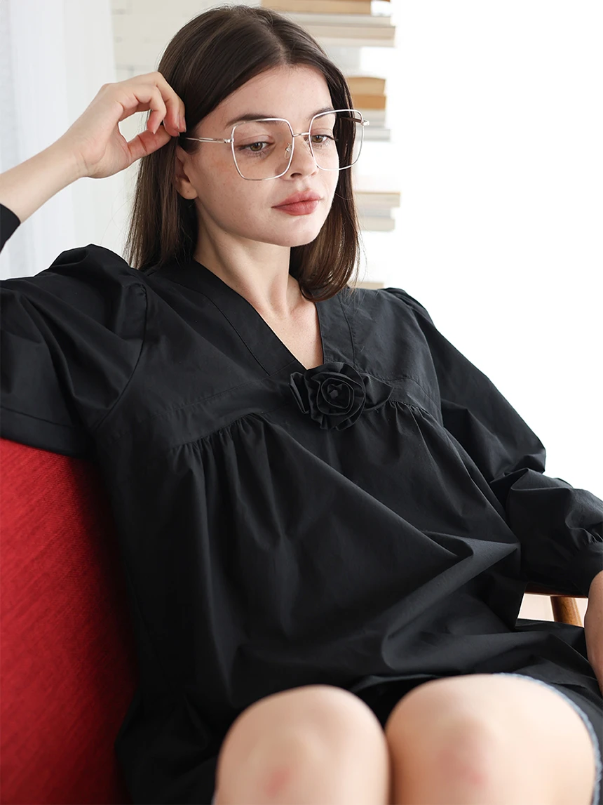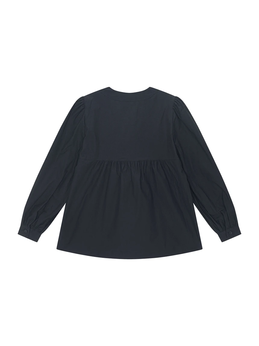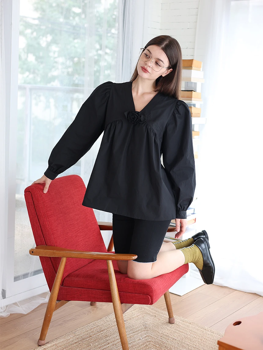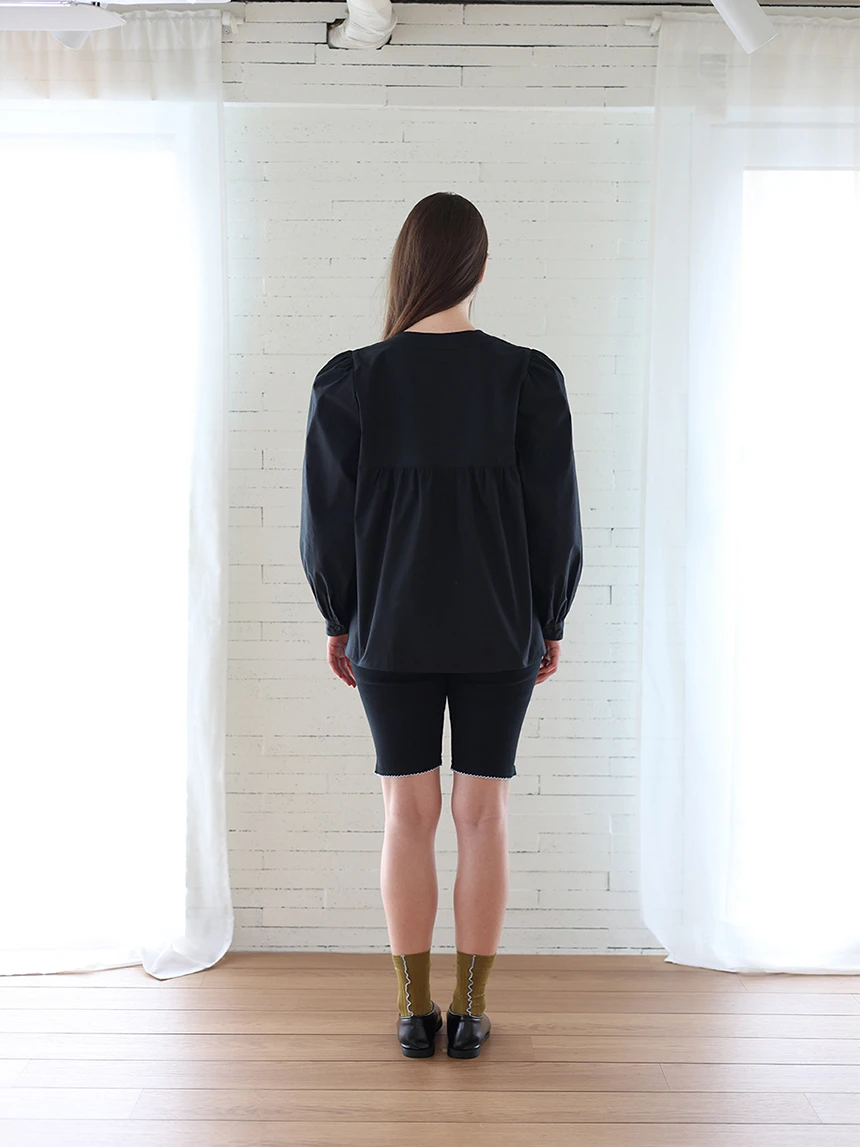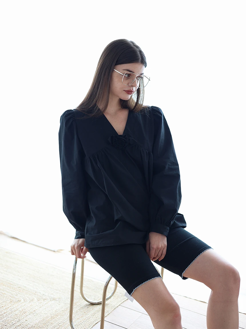 すっきりとしながらもロマンティックなムードを持つブラウス。フロントラインには取り外し可能なローズブローチがあしらわれ、クラシックな雰囲気をプラス。ルーズに落ちるパフスリーブがフェミニンなシルエットを演出します。快適でありながら上品なスタイルにも活用できるアイテムです。 COLOR : black FABRIC: Cotton 100% CARE:ドライクリーニング/単独手洗い/蛍光増白剤・漂白剤の使用不可/日陰で平干し乾燥/乾燥機使用禁止 Made in Korea