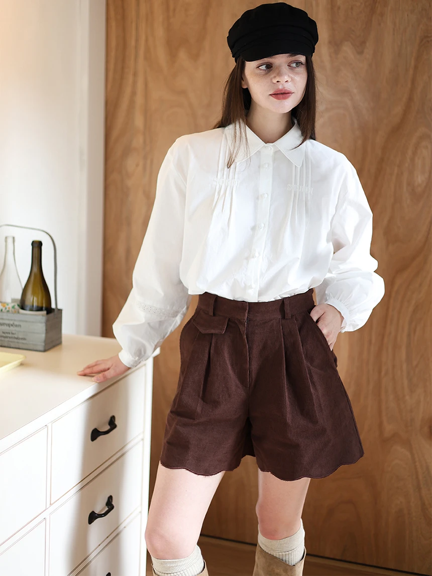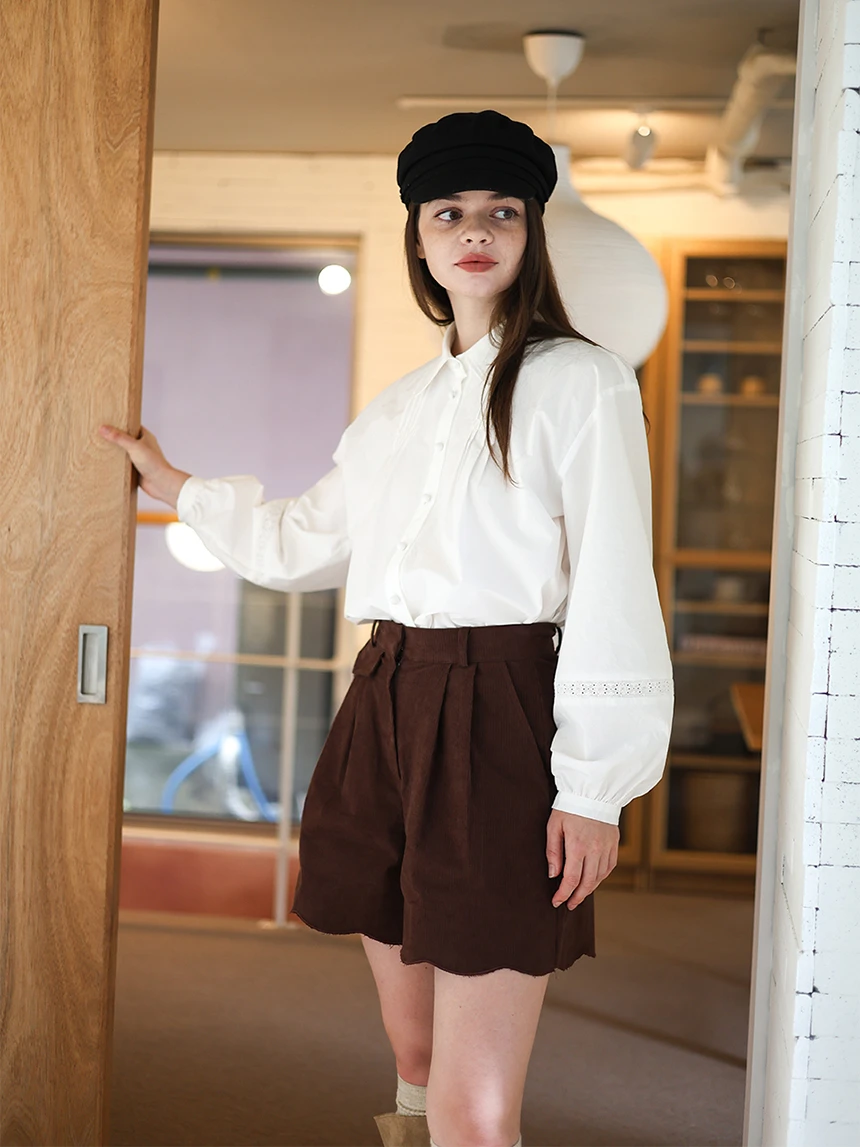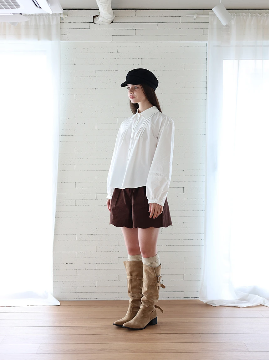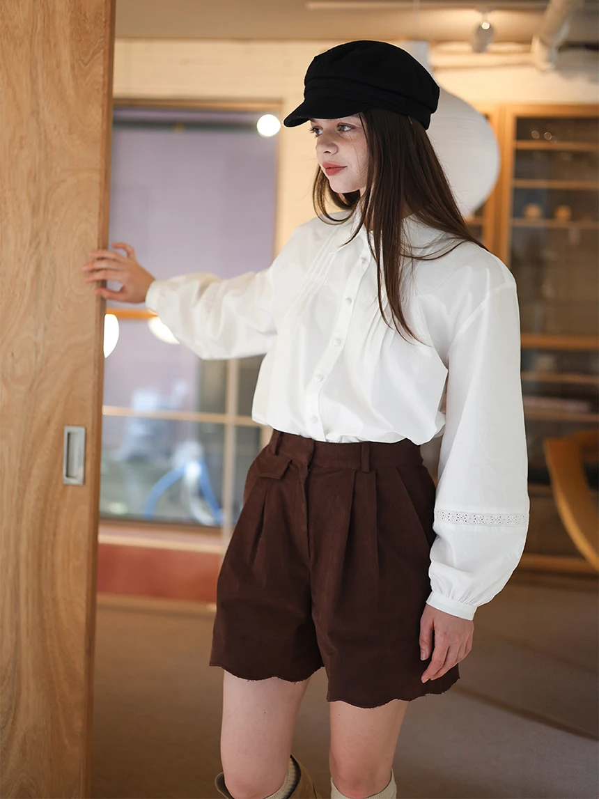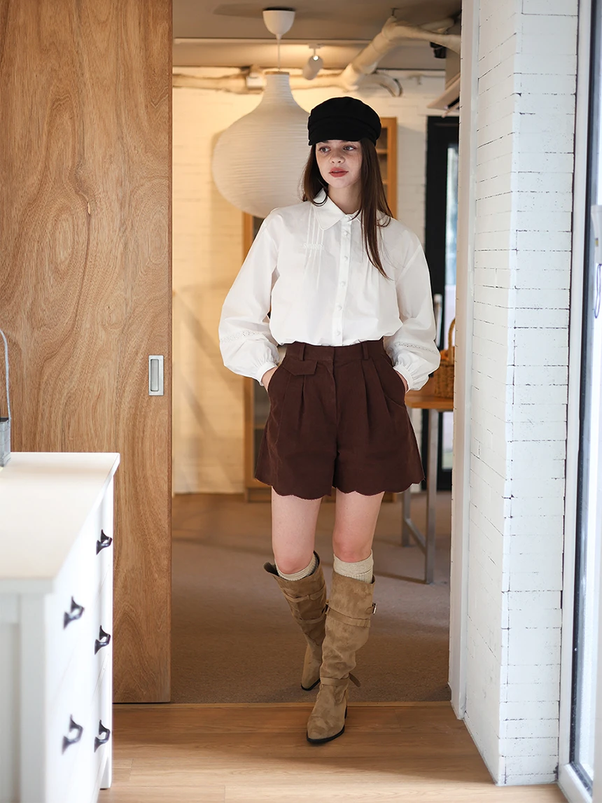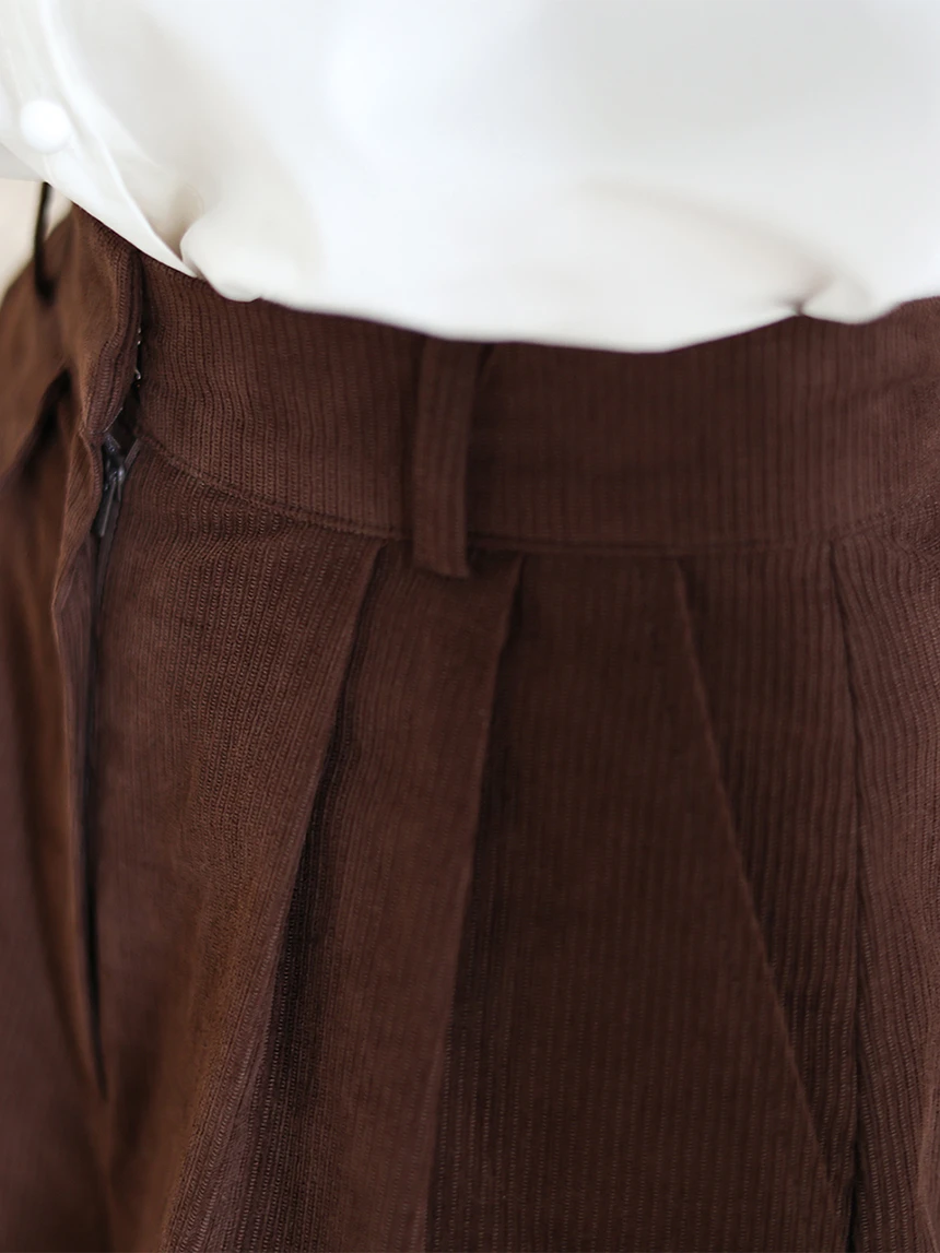 すっきりとしながらもラブリーなムードのコーデュロイパンツ。ウエストラインに施されたピンタックディテールが洗練されたシルエットを演出。ゆったりとしたAラインフィットで脚長効果を生み、裾の控えめなウェーブカットがアクセントとなり、ラブリーさをプラスしたアイテムです。 COLOR : brown FABRIC: Cotton 98% / Polyurethan 2% CARE:ドライクリーニング/単独手洗い/蛍光増白剤・漂白剤の使用不可/日陰で平干し乾燥/乾燥機使用禁止 Made in Korea