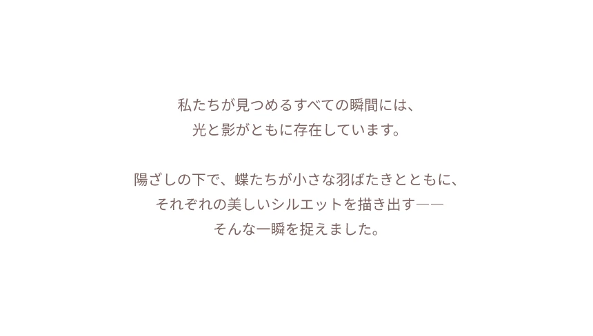 私たちが見つめるすべての瞬間には、 光と影がともに存在しています。 陽ざしの下で、蝶たちが小さな羽ばたきとともに、 それぞれの美しいシルエットを描き出す―― そんな一瞬を捉えました。