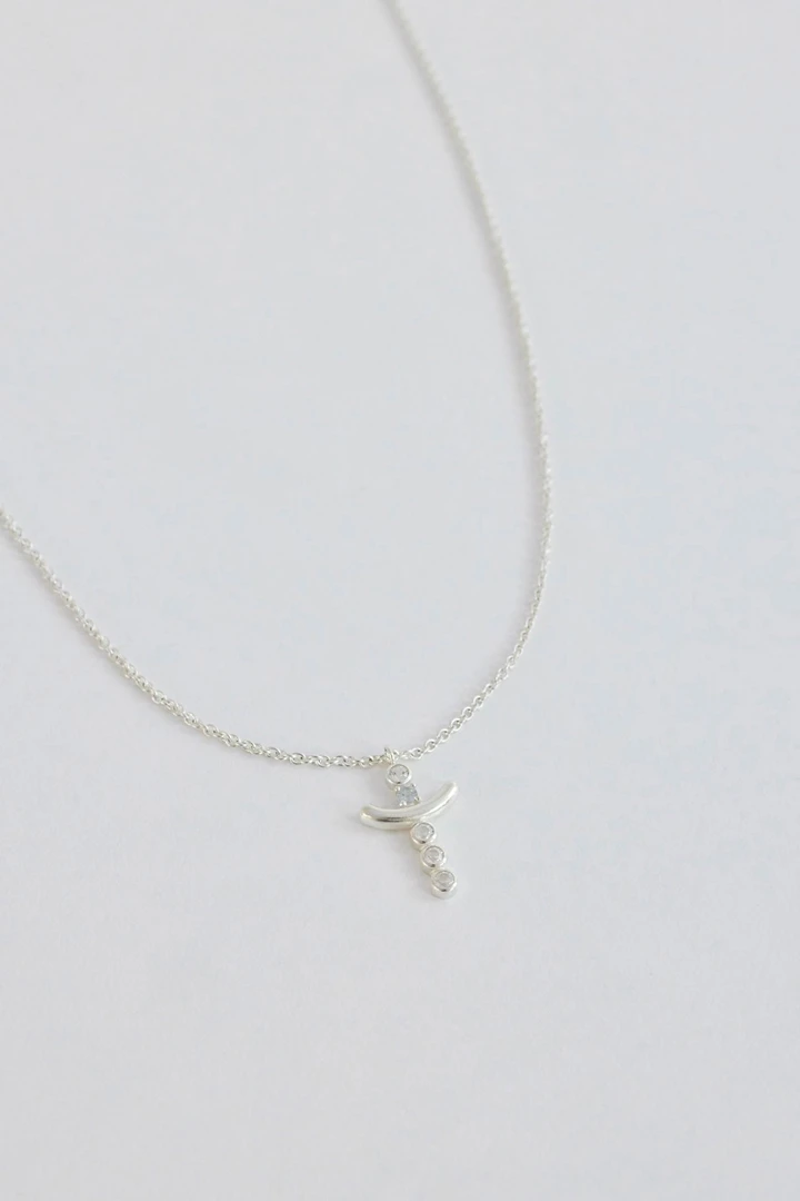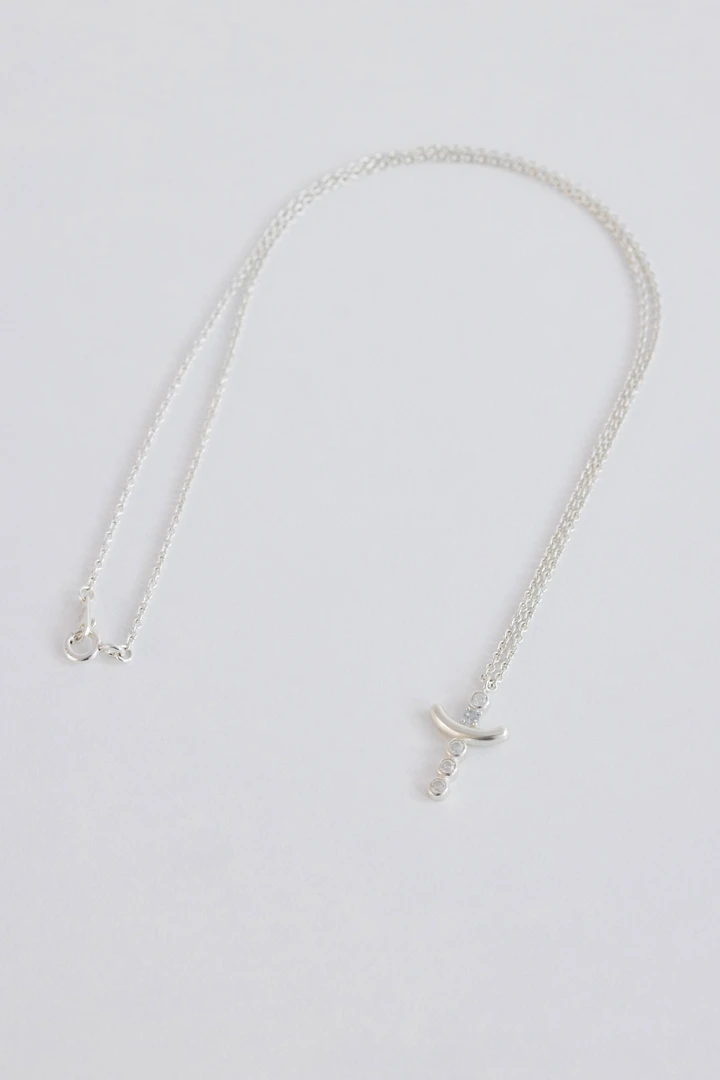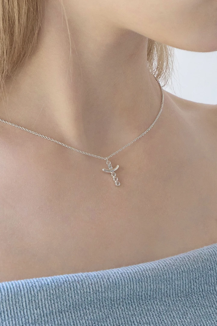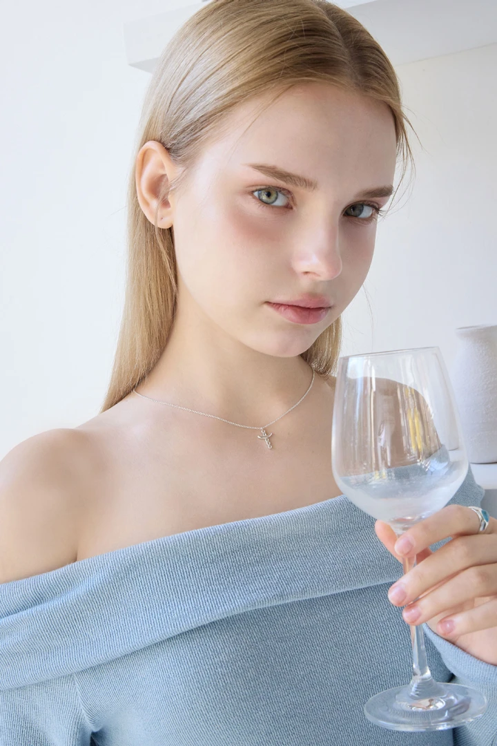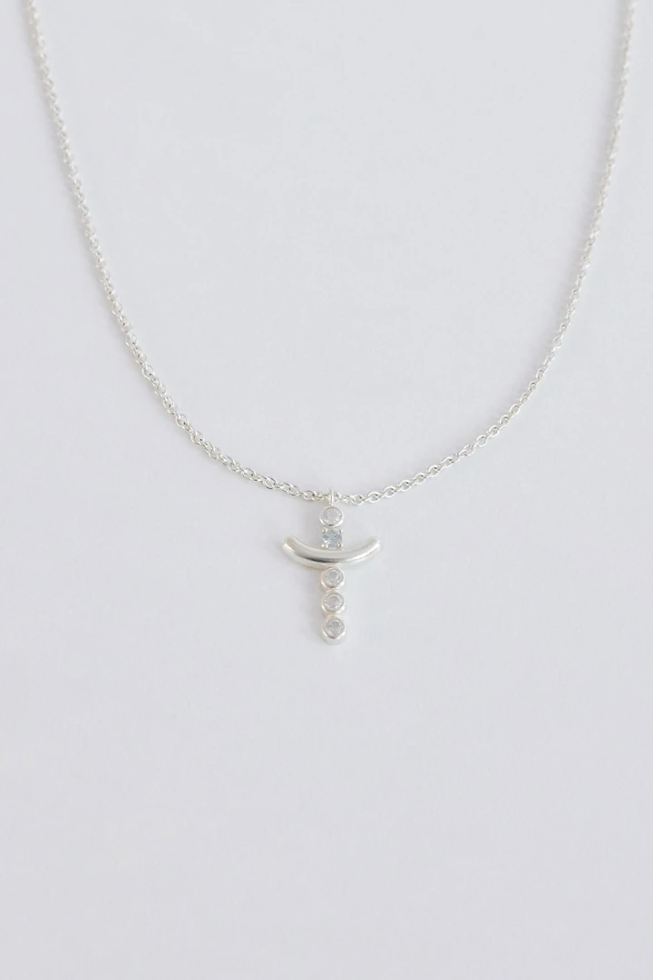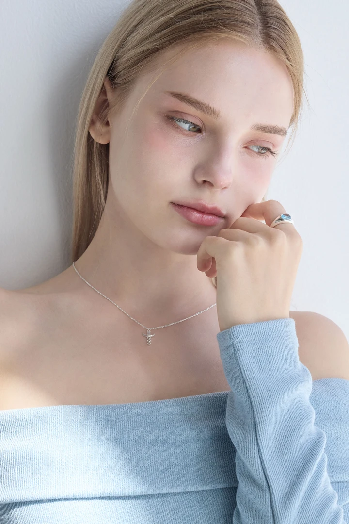 クラシックなクロスモチーフのペンダントに、縦軸にはホワイトトパーズ4石を爪留めで繊細にセッティング。その間にスカイブルートパーズを1石、ベゼルセッティングで包み込み、さりげないアクセントを添えています。伝統的なクロスシルエットに爽やかなカラーストーンをプラスし、洗練された中にも感性が光るデザインに仕上げました。 SIZE : W 10.4 x L 18.1 ( 丸カン含む ) / 40cm + 2cm METERIALS : Silver 925 / White Topaz 2mm x 4 , Sky Blue Topaz 2mm x 1