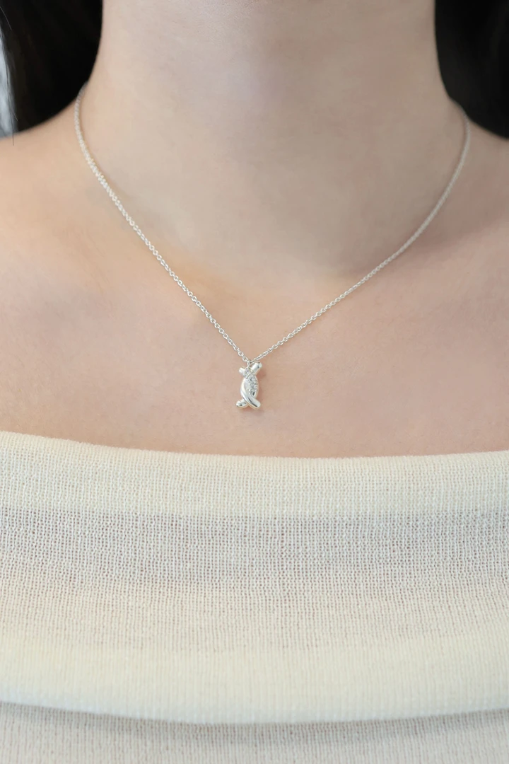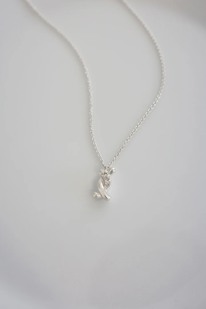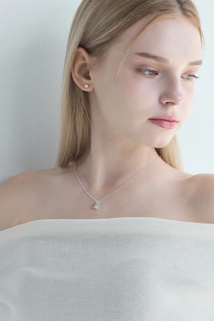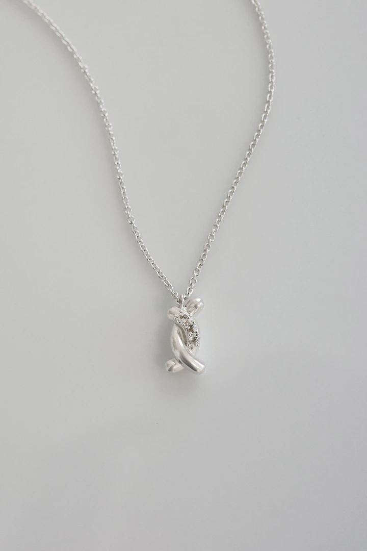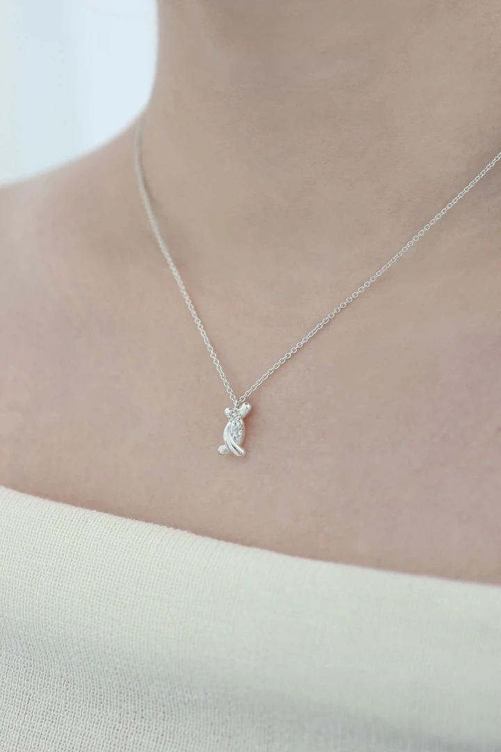 男女が互いに抱き合う姿を表現したネックレス。寄り添うことで生まれる曲線的なシルエットが、身に着けたときにデコルテラインと自然に調和し、中央にはきらめくストーンをセッティングすることで、さりげない存在感を添えました。 SIZE : W:6.7 x L:13.6 / 40cm + 2cm METERIALS : Silver 925 / White Topaz 2mm x 3
