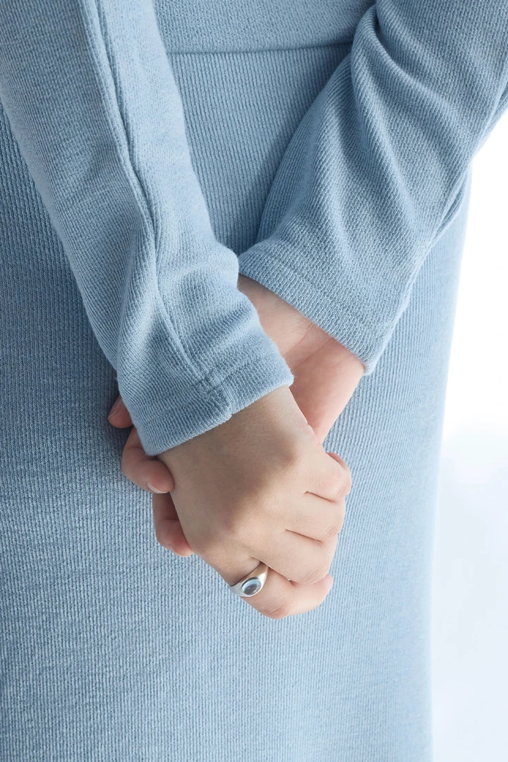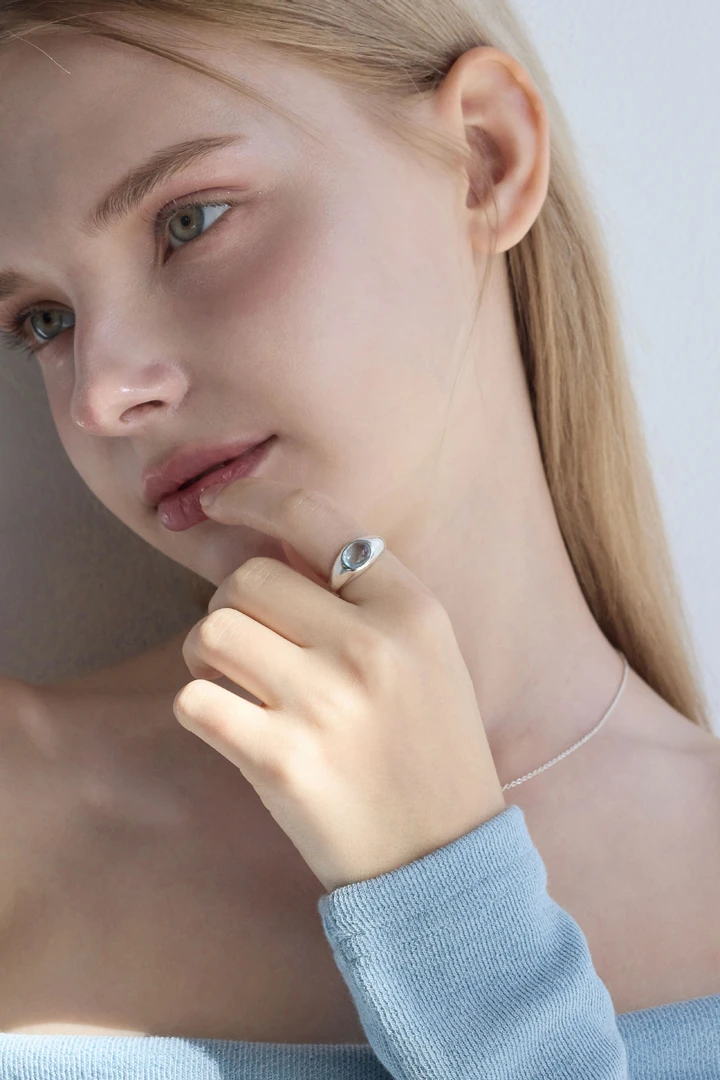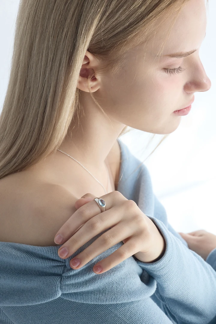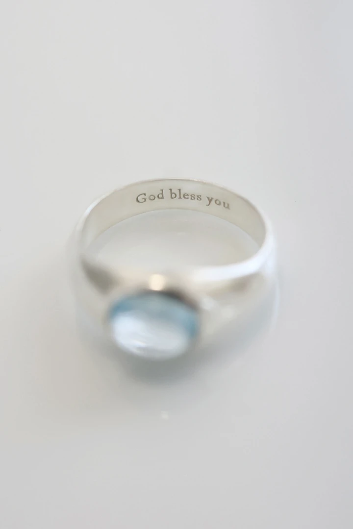 大切な方へ、祝福と癒しの想いを込めて贈りたい特別なリング。 澄み渡る晴天の空を思わせるスカイブルーの天然石をセッティングし、見つめるたびに心をそっと包み込むような、清らかでやさしい輝きを放ちます。 リングの内側には「God bless you」の刻印を施し、身に着ける人へ小さな祈りを捧げるような、温もりのある意味深いデザインに仕上げました。 SIZE : 7号 , 9号 , 11号 , 13号, 15号 METERIALS : Silver 925 / Sky Blue Topaz 8x6 ※実際の天然石は、着用写真よりもさらに透明感のある色合いとなっております。