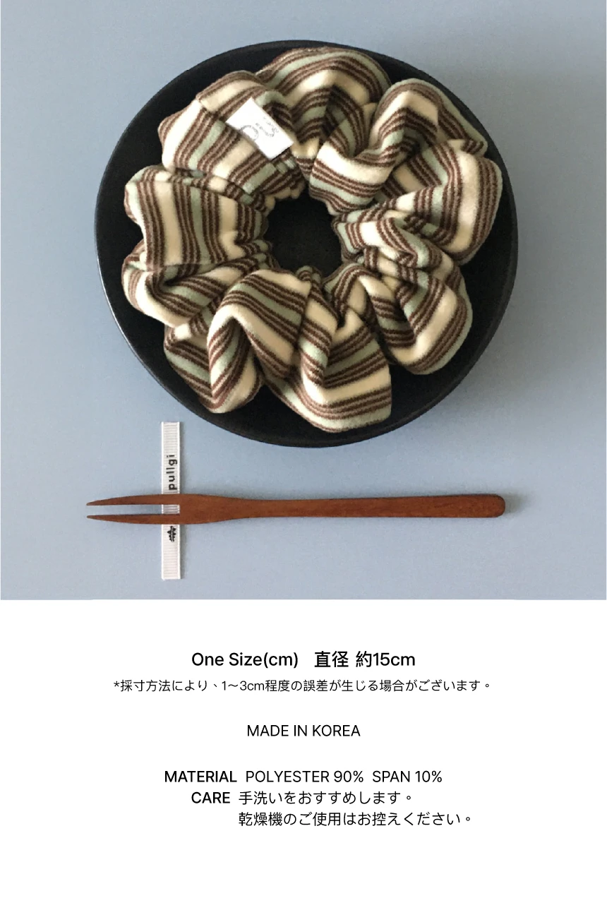 ❋ LIMITED EDITION ❋ Pulgi初の東京ポップアップを記念した、リミテッドエディションのシュシュです。 FLAT DONUT、FLAT BAGELよりもひとまわり小さいミディアムサイズで、よりウェアラブルに仕上げました。 ブロックストライプ柄が際立つデザインで、スタイリングのさりげないポイントになります。 起毛感のあるやわらかな素材で、軽くやさしい肌触り。 手首や肌に触れるたび、思わず触れたくなるような心地よさが魅力です。 「MATCHA HOJI」はミュートなミント&ディープブラウンカラーの組み合わせが魅力的なブロックストライプ柄です。 PULLGI IN-HOUSE CRAFTED MACHINE WASH COLD WASH SEPARATELY DRY CLEAN MATERIAL : POLYESTER 90, SPAN 10 SIZE : 15CM MODEL HEIGHT 159cm