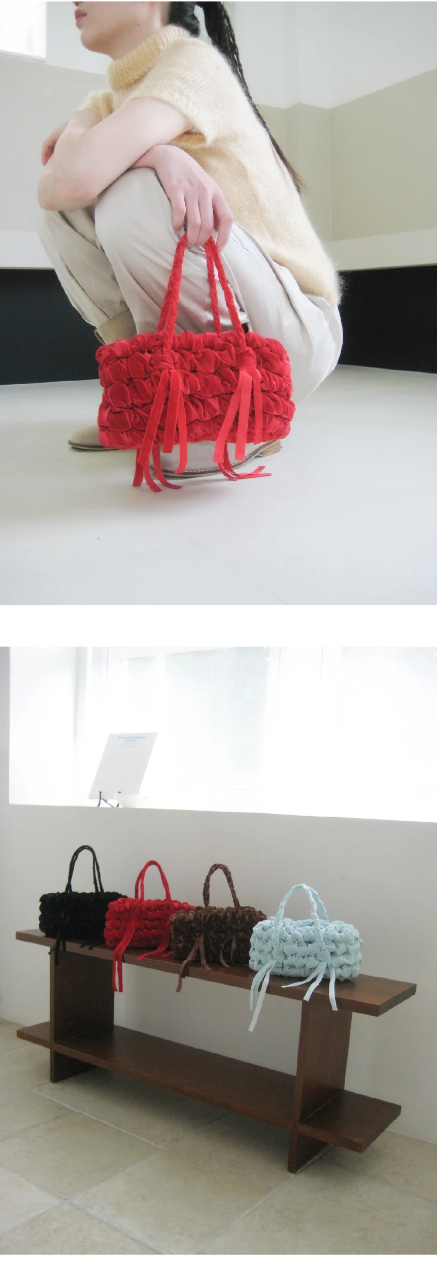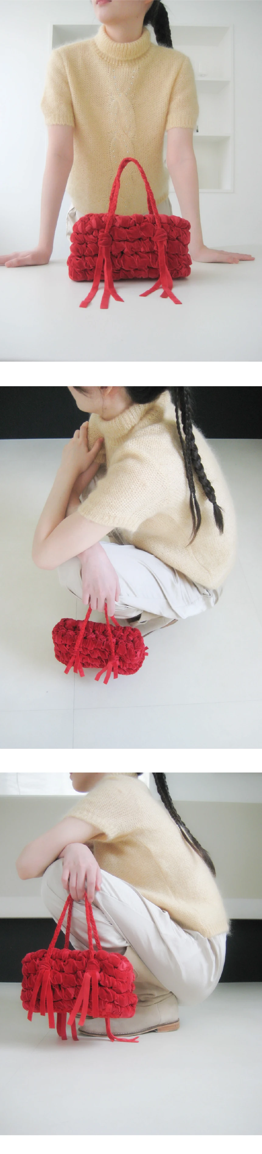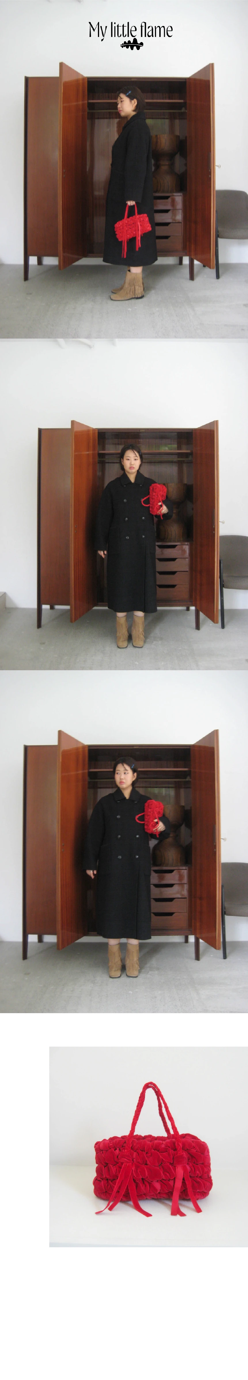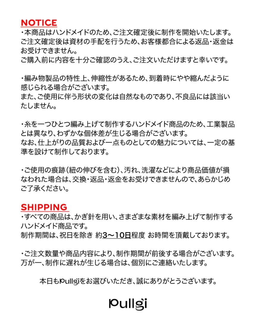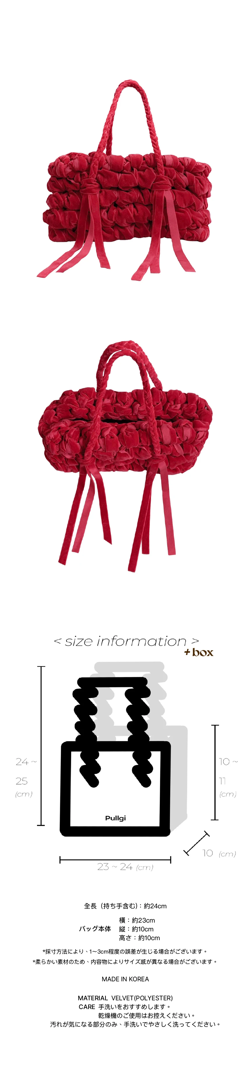 何かを収める「容れ物」からモチーフを得た • CONTAINER project • の第一弾デザインです。 家で、以前使っていた部屋の引き出しの隅から見つけた箱の中には文房具店で買った指輪や、授業中にこっそりとやり取りしていたメモなど、長い時間をかけて積み重なった思い出の品々が入っていました。 当時、誰を好きだったのか、どこへ遊びに行く予定だったのか。 そんな他愛のないやり取りがたくさん詰まっていて何年も大切にしまっていた記憶がひとつひとつ浮かび上がり、時間を忘れてあれこれ取り出して眺めていました。 この経験から、単に物を持ち運ぶためのものではなく 「過去から現在までのすべての感情や経験を収める」象徴的なフォルムとしての Box が生まれました。 ✦ HAND MADE ✦ 直方体・8面構成の立体的なシェイプ ✦ 丁寧に編み込まれたハンドルストラップ ✦ 持ち上げた際、開口部が自然に閉じるデザイン ✦ 腕に掛けた際、手首に負担のかからない長さ ✦ 軽やかな持ち心地 ✦ 1年以上の研究を経て完成した、Pullgiでのみご覧いただけるデザインです。 PULLGI IN-HOUSE CRAFTED HAND WASH ONLY DO NOT TUMBLE DRY GENTLY HAND WASH STAINED AREAS ONLY