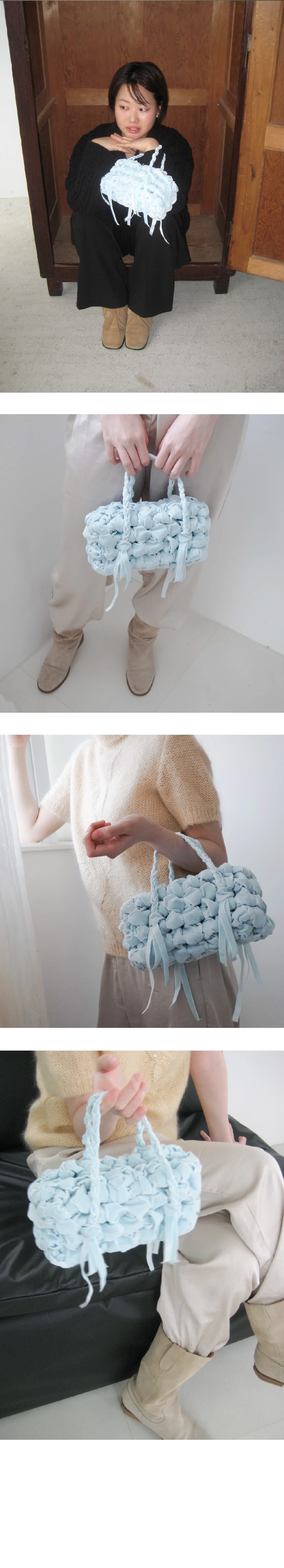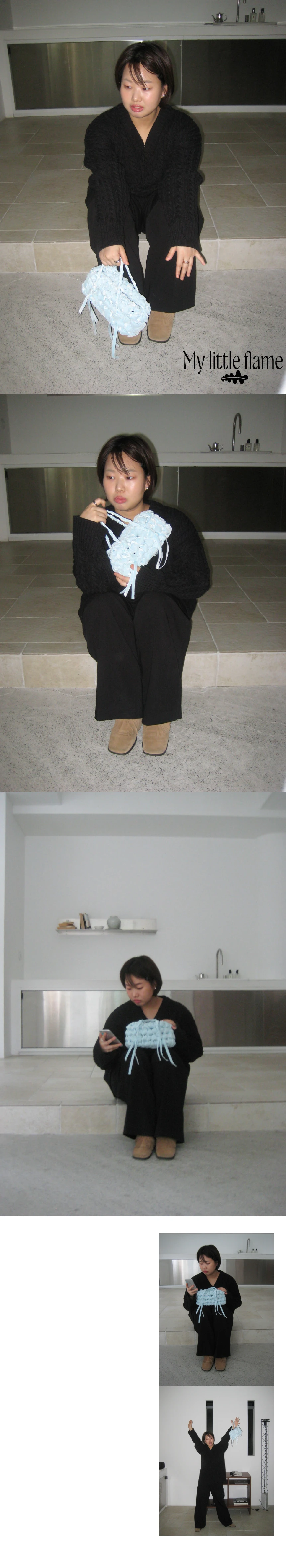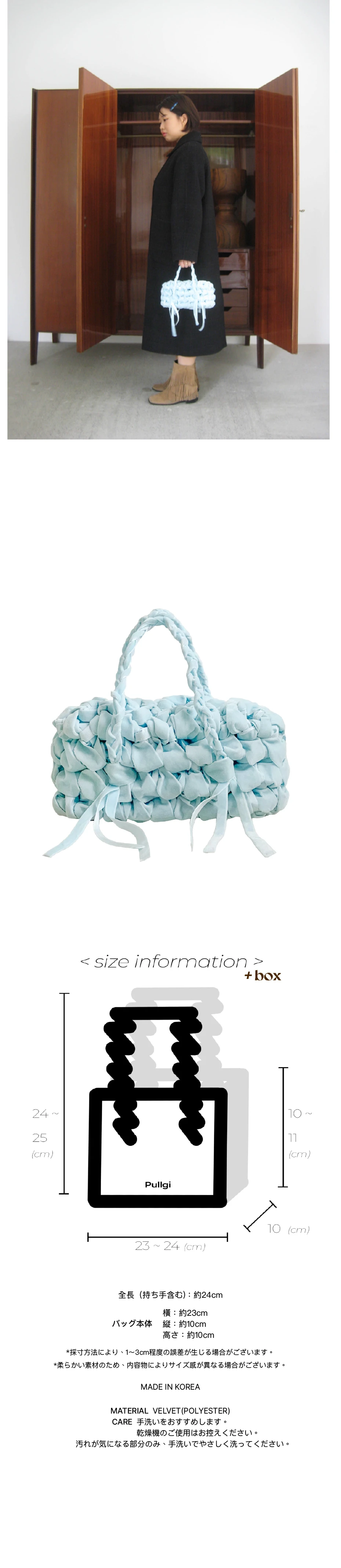 何かを収める「容れ物」からモチーフを得た • CONTAINER project • の第一弾デザインです。 家で、以前使っていた部屋の引き出しの隅から見つけた箱の中には文房具店で買った指輪や、授業中にこっそりとやり取りしていたメモなど、長い時間をかけて積み重なった思い出の品々が入っていました。 当時、誰を好きだったのか、どこへ遊びに行く予定だったのか。 そんな他愛のないやり取りがたくさん詰まっていて何年も大切にしまっていた記憶がひとつひとつ浮かび上がり、時間を忘れてあれこれ取り出して眺めていました。 この経験から、単に物を持ち運ぶためのものではなく 「過去から現在までのすべての感情や経験を収める」象徴的なフォルムとしての BOX が生まれました。 ✦ HAND MADE ✦ 直方体・8面構成の立体的なシェイプ ✦ 丁寧に編み込まれたハンドルストラップ ✦ 持ち上げた際、開口部が自然に閉じるデザイン ✦ 腕に掛けた際、手首に負担のかからない長さ ✦ 軽やかな持ち心地 ✦ 1年以上の研究を経て完成した、Pullgiならではのデザインです PULLGI IN-HOUSE CRAFTED HAND WASH ONLY DO NOT TUMBLE DRY GENTLY HAND WASH STAINED AREAS ONLY