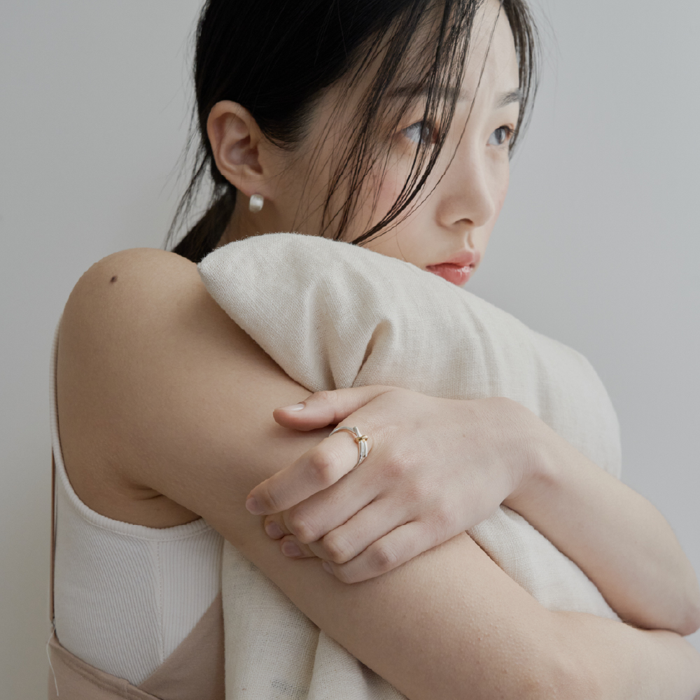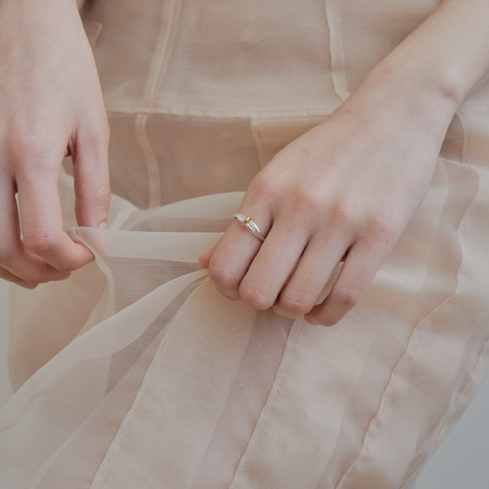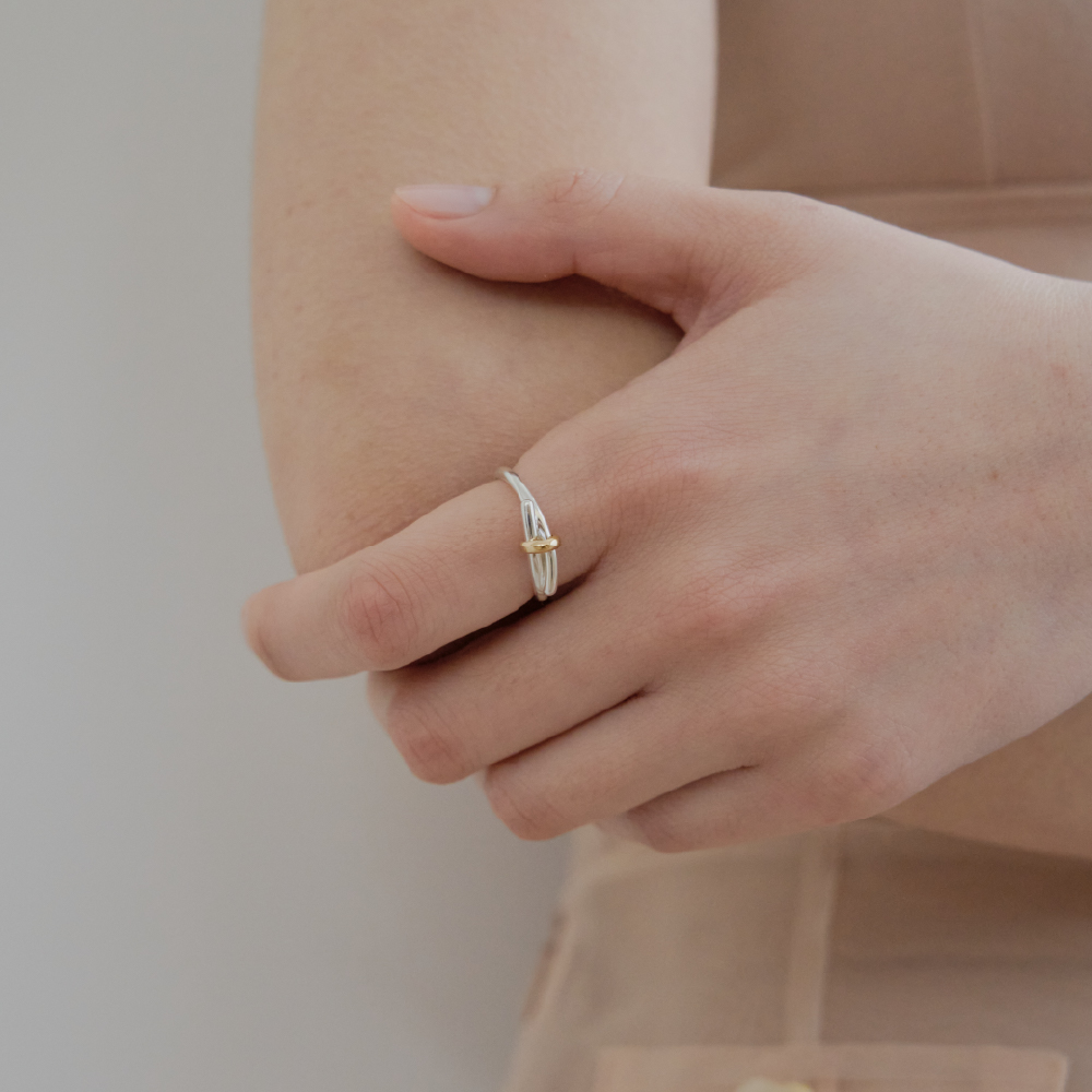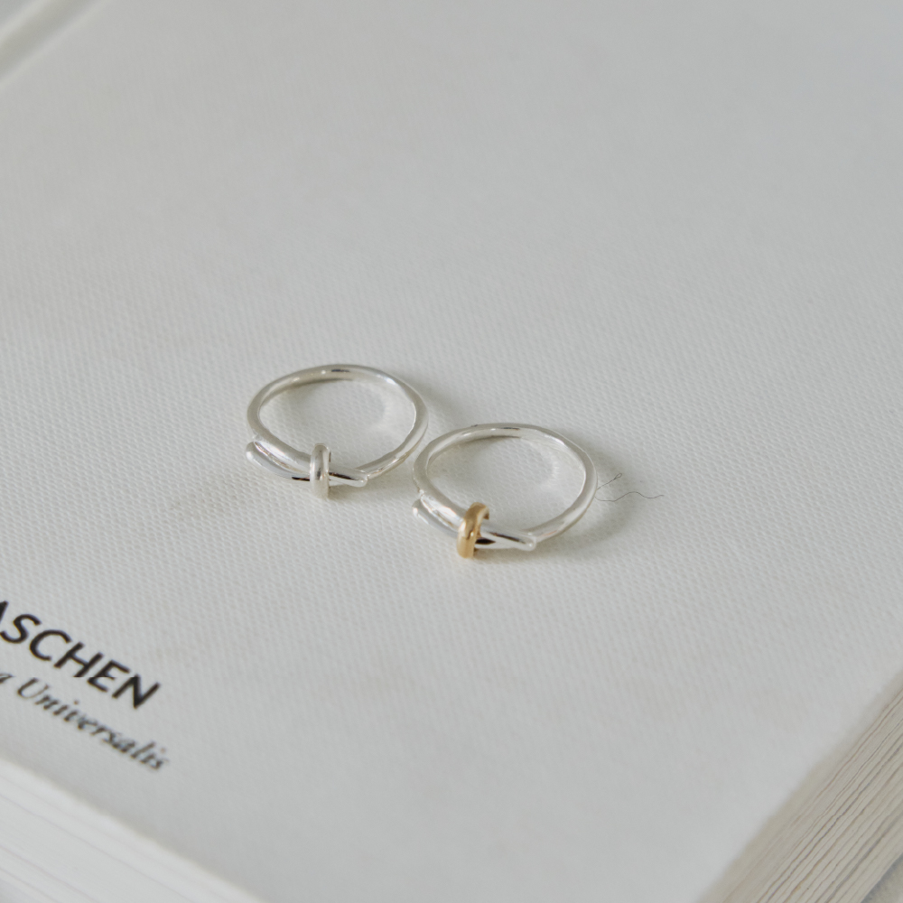 華奢な結び目をポイントにしたリング。中央に配した小さなリングが結び目を留め、さりげなく個性のあるラインを描きます。リング部分は、ゴールドまたはシルバーからお選びいただけます。 - 925 sterling silver - gold or silver - height 1.2mm