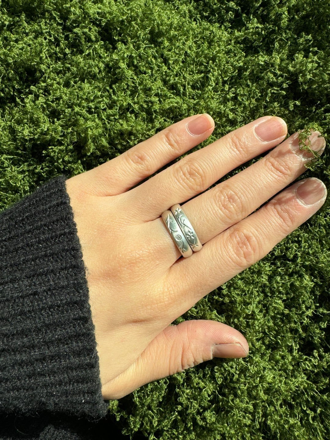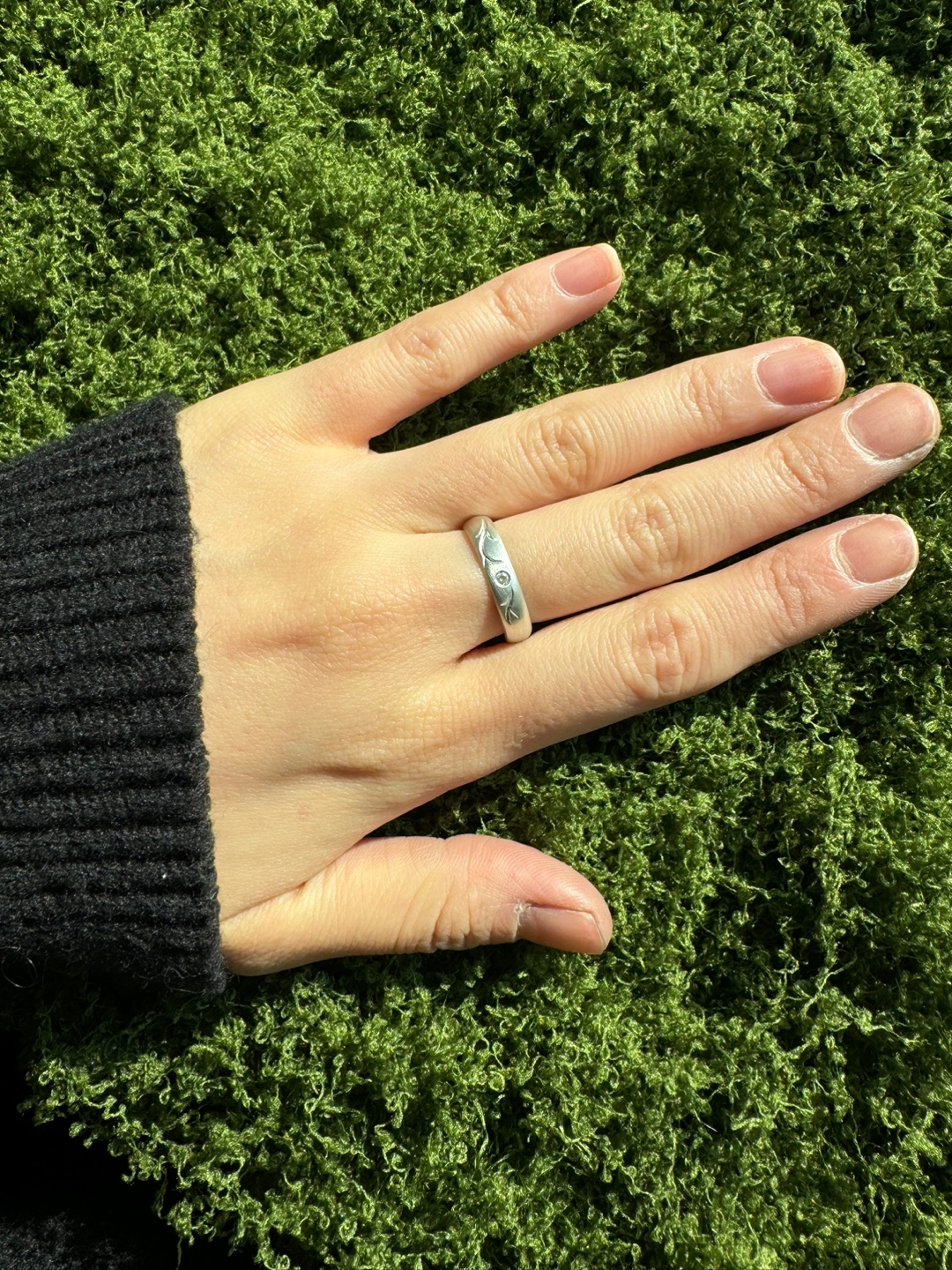 花や草葉を繊細に彫り込んだ、リーフシグネットリング。 すっきりとした細身のフォルムで、ひとつで着けても軽やかな印象に。シグネットリング1と重ねてレイヤードしたり、ペアリングとしてシェアしてお楽しみいただくのもおすすめです。 - 925 sterling silver - matt texture - height 3mm - white stone 1.5mm *一点一点手作業で彫刻を施しているため、仕上がりには個体差が生じる場合がございます。