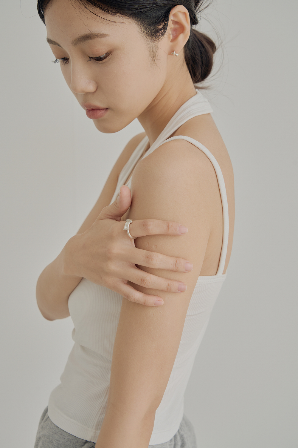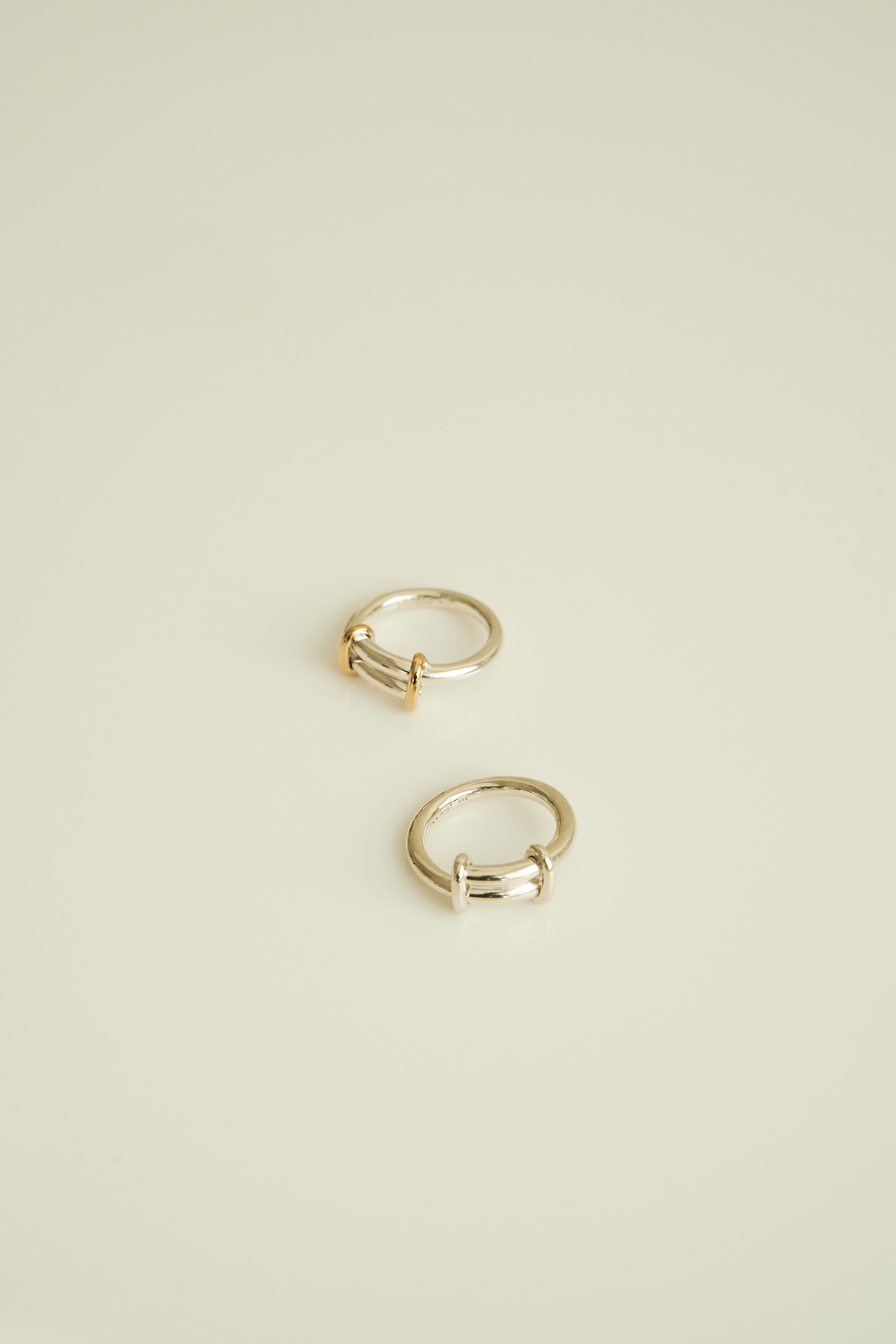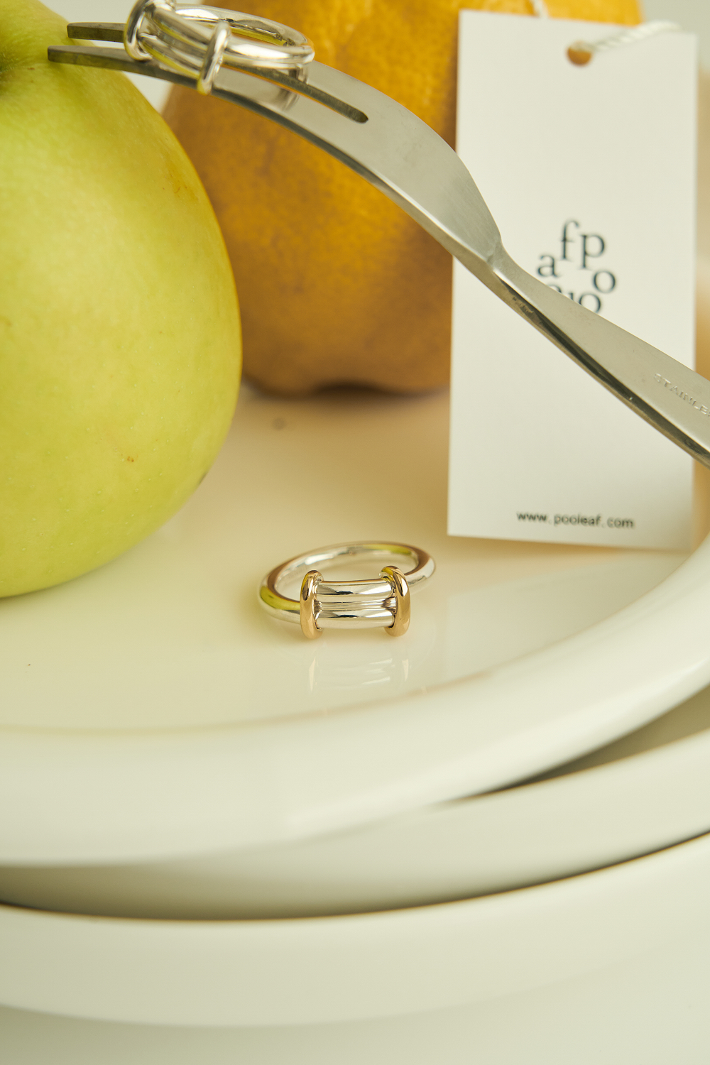 異なる二つの面が重なり合い、一つに結ばれる構造のリング。 程よい厚みのあるリングに交差する面を重ね、すでに結ばれた誓いがより強い結束へとつながる瞬間を象徴したデザインです。装飾ではなく構造そのものをポイントにし、ひとつで着けるだけでも確かな存在感を放ちます。 * 925 sterling silver * gold point or silver point * body 3mm/front 10*8mm