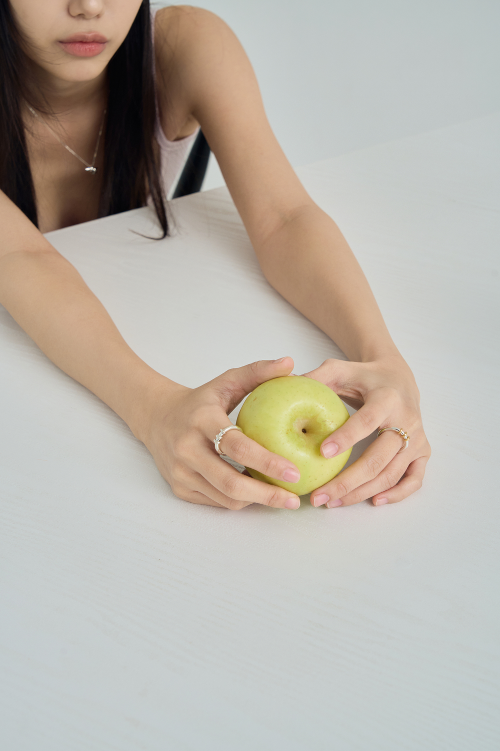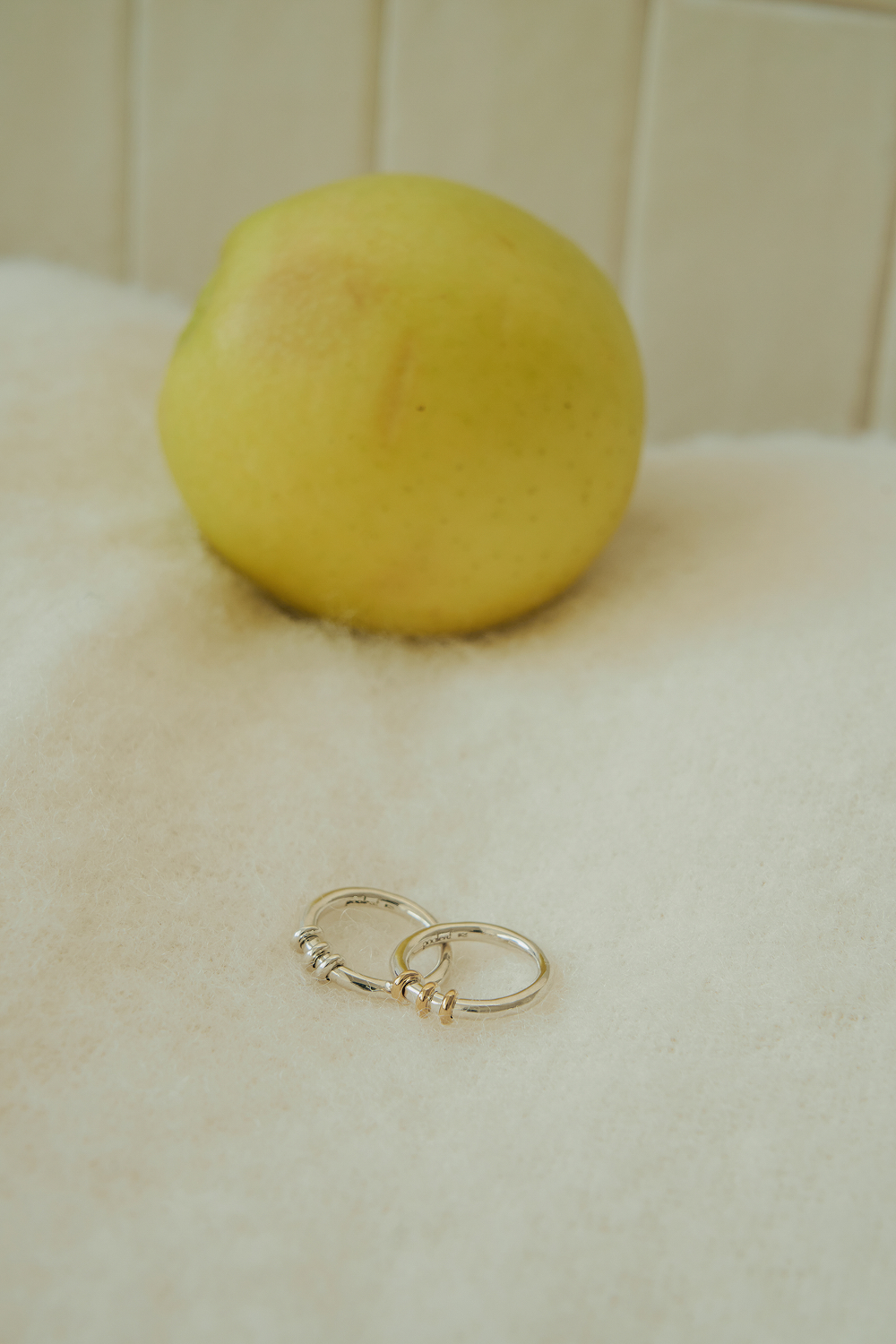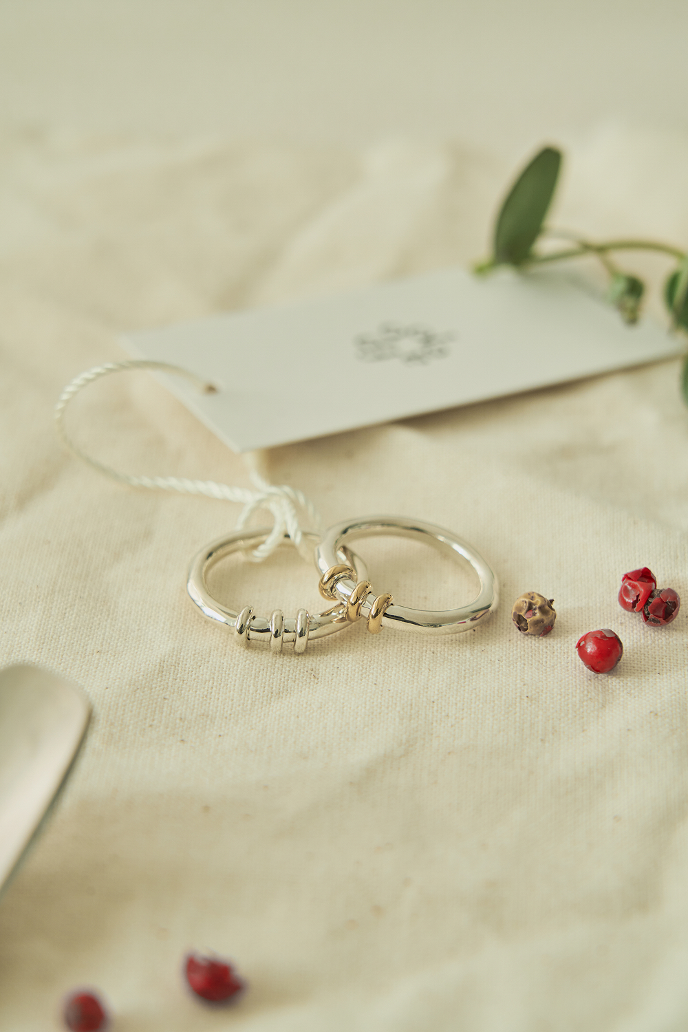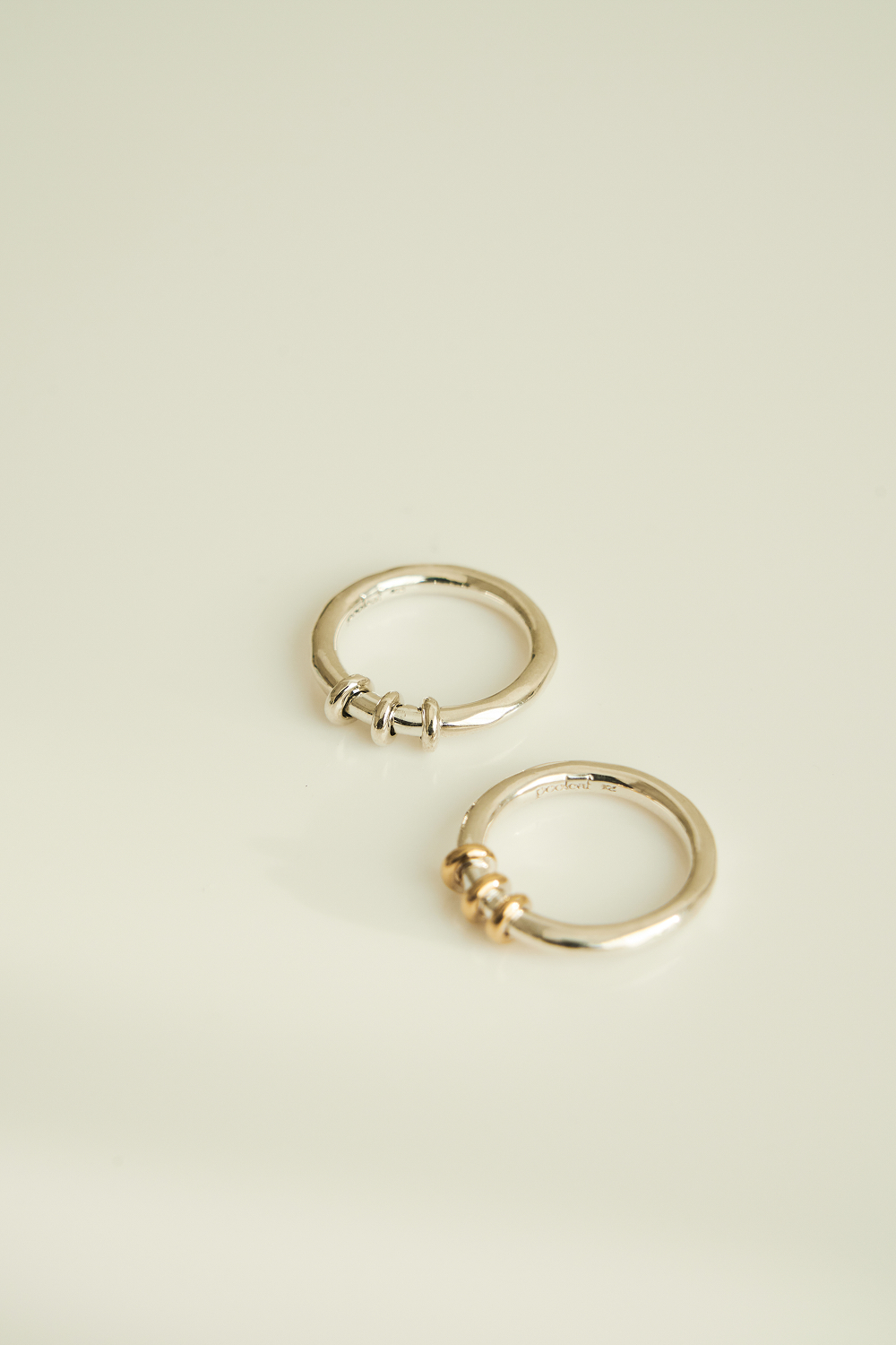 愛の誓いを結び目で表現したリング。 3mmの細いリングに、さらに3つの小さなリングを重ね、ひとつの誓いに込められた重ねる想いを形にしました。動くたびに自然に回転する小さなリングは、繰り返し思い返したくなる誓いの瞬間を思わせます。 * 925 sterling silver * 3mm