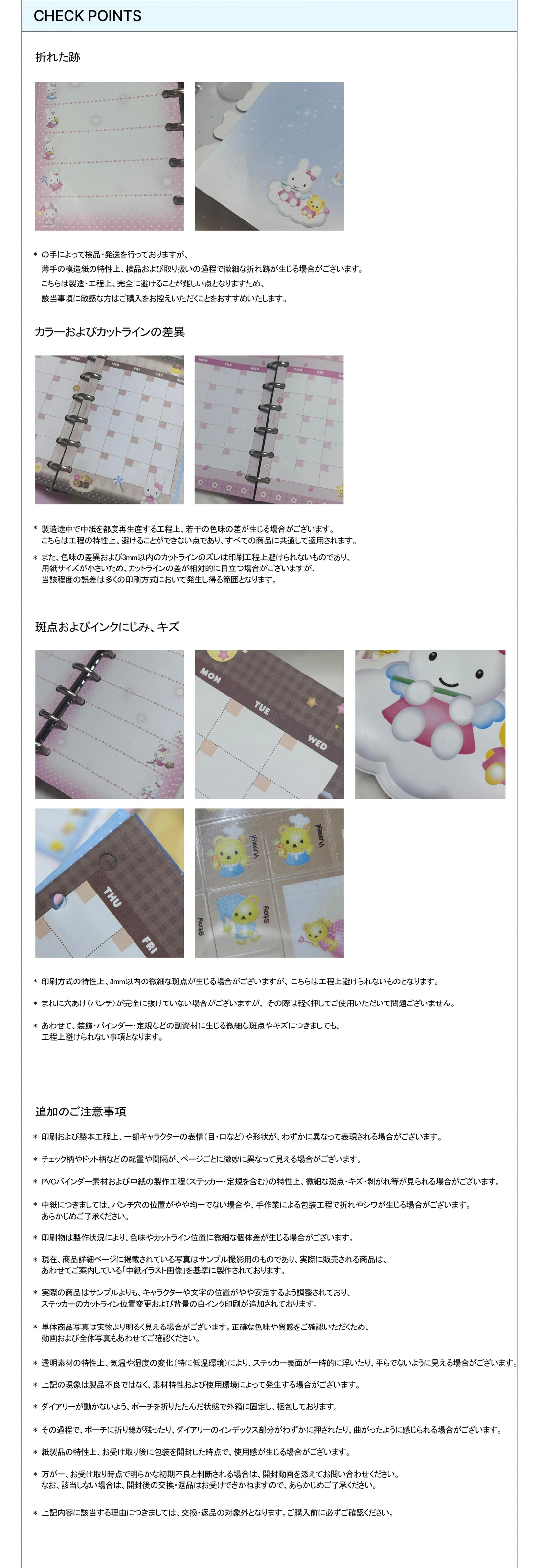 -PVCバインダー素材と中紙の製作(シール、定規を含む)工程の特性上、微細な斑点、キズ、またはインクの飛び散りが見られる場合がございます。 中紙の場合、穴あけ面が多少均一でなかったり、手作業の包装過程で微細なしわが発生することがございますので、ご了承くださいませ。 また、印刷物は制作状況により色味やカットラインの位置に微細なばらつきが生じることがございます。
