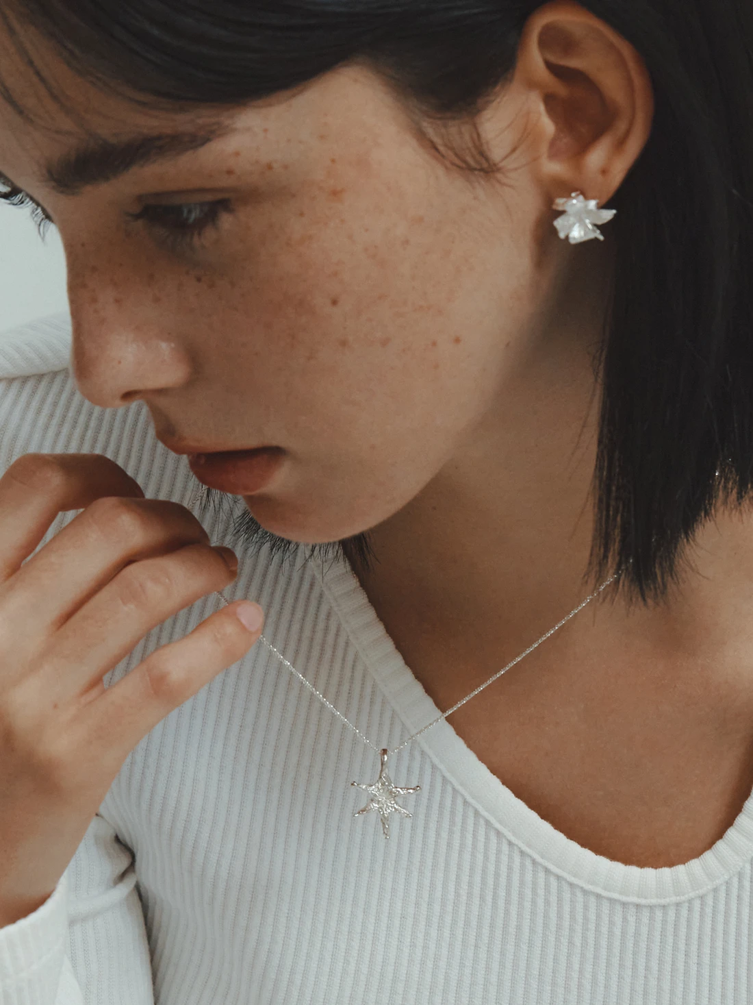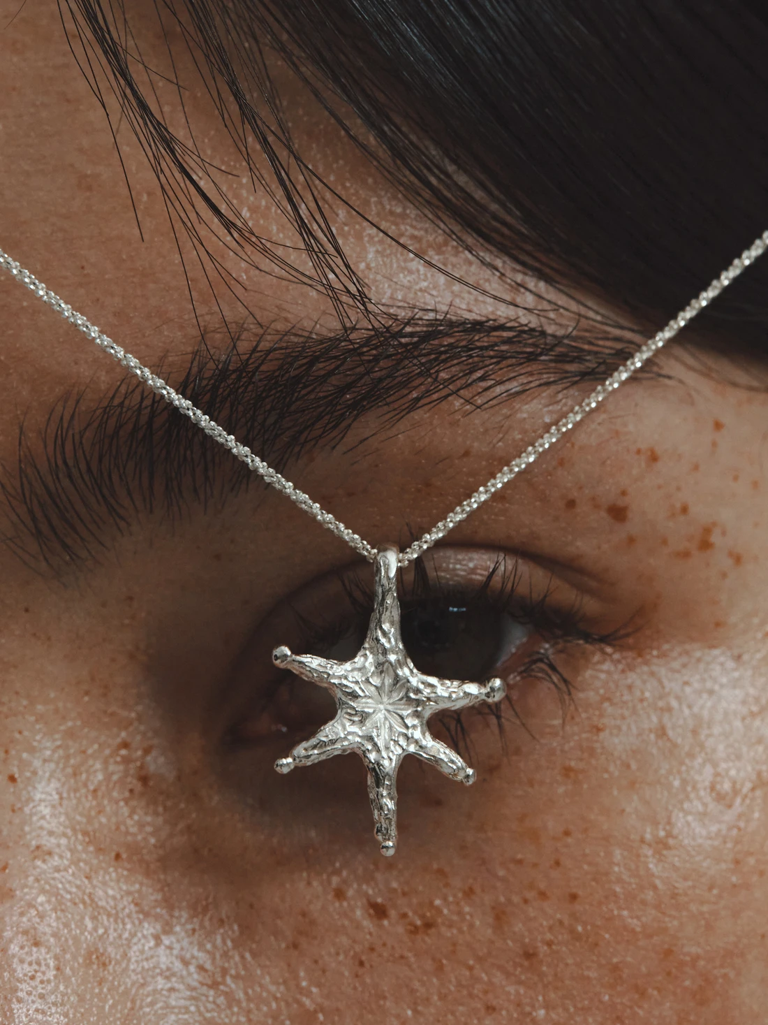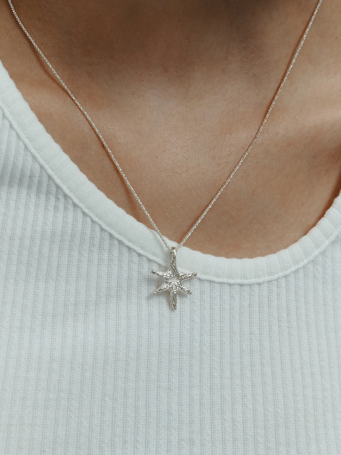 ペンダントの表面と裏面に、太陽と星のモチーフがそれぞれ刻まれたネックレスです。