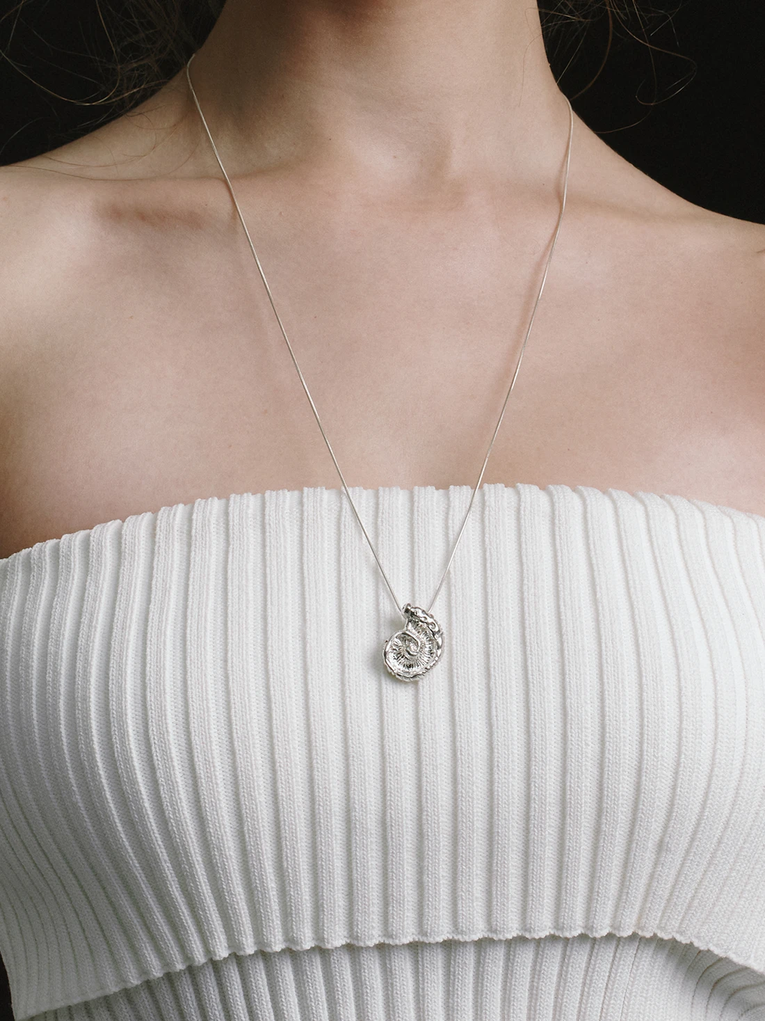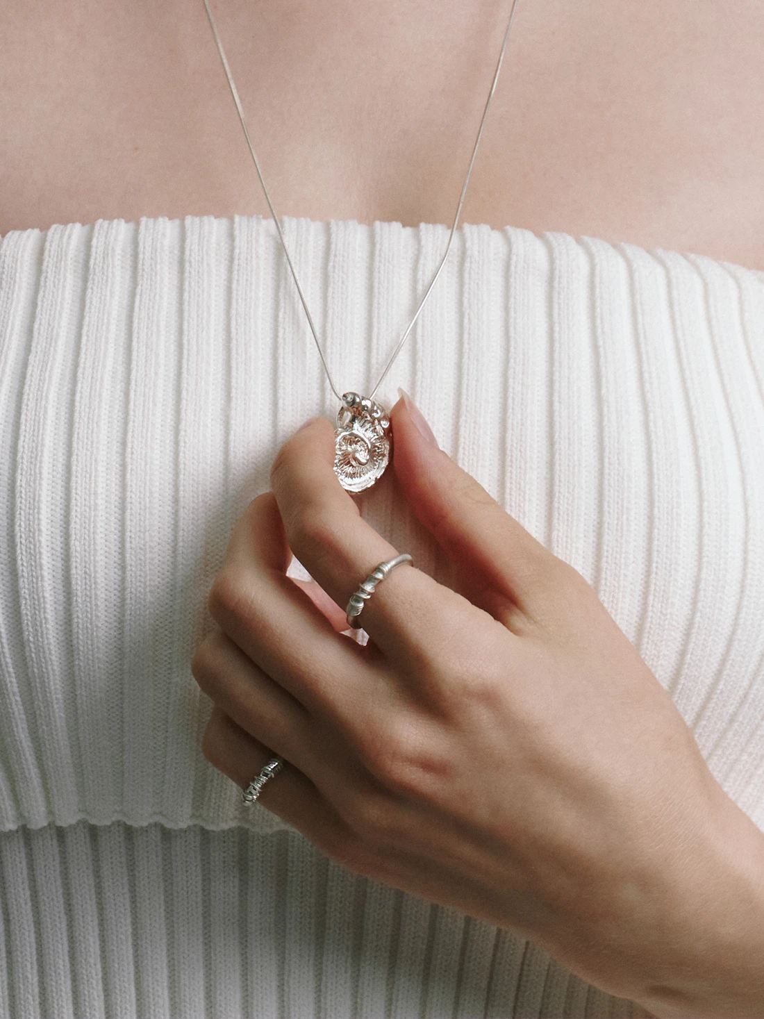 海の深い歴史と忘れられた時の記憶を宿すアンモナイトのモチーフを通して、永遠に色あせない美しさを手元でお楽しみください。