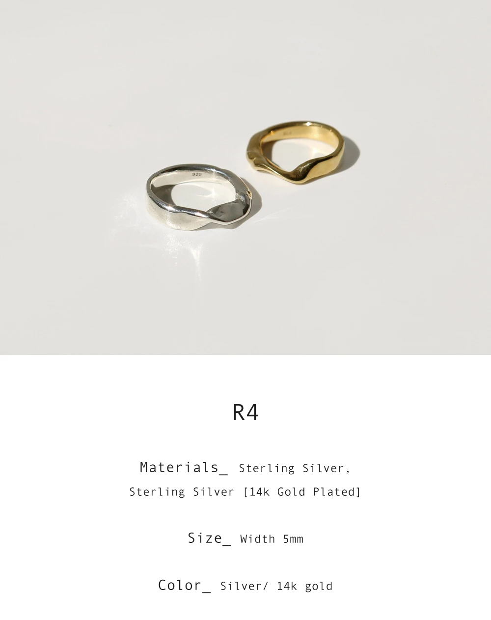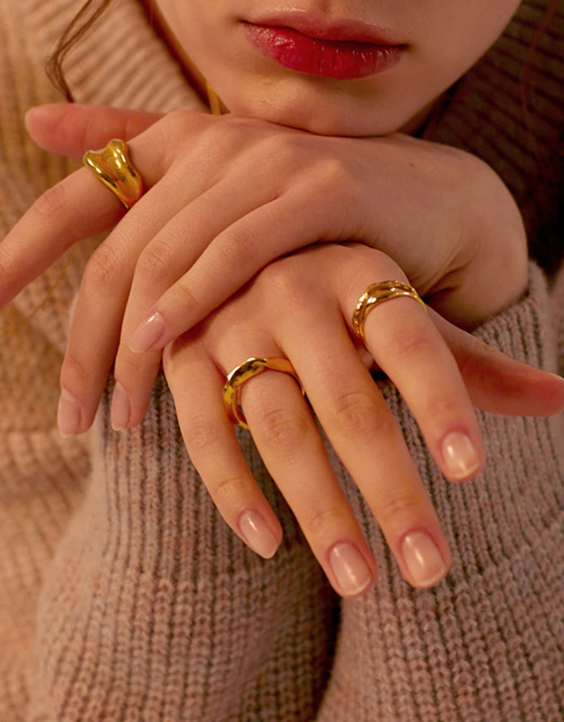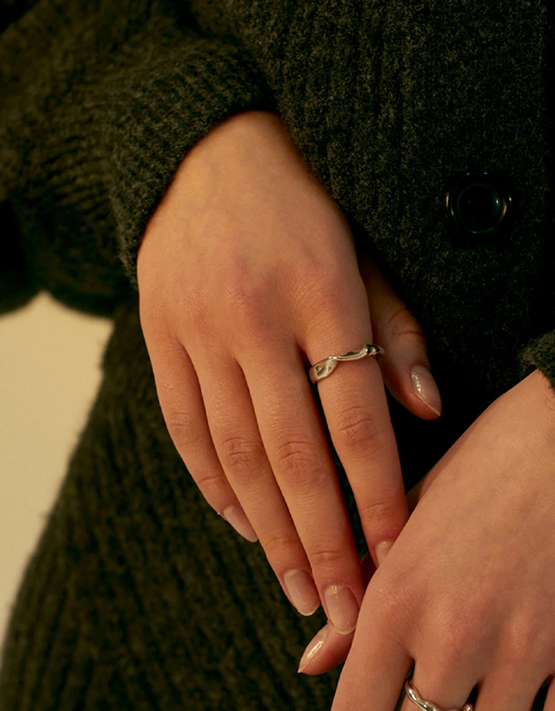 夕焼けの光の下でやわらかく揺らめく輝きをモチーフにデザインされたリング。 かすかに揺らぐようなフォルムをリングに落とし込みました。 指をやさしく包み込むなめらかな曲面で、シンプルでありながらユニークなスタイリングを演出します。