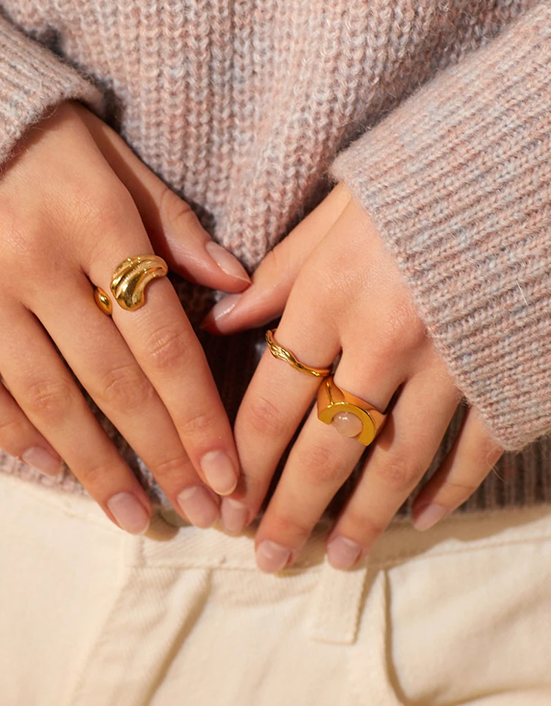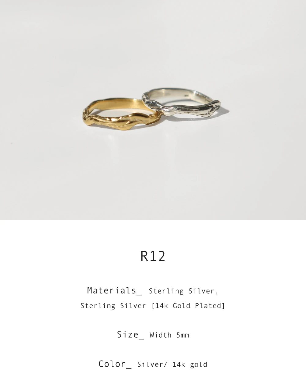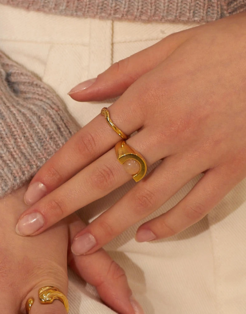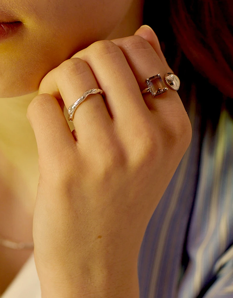 夕焼けの光の下でやわらかく揺らめく輝きをモチーフにデザインされたリング。 かすかに揺らぐようなフォルムをリングに落とし込みました。 指にやさしく沿うなめらかな曲面で、シンプルでありながらユニークなスタイリングを演出します。