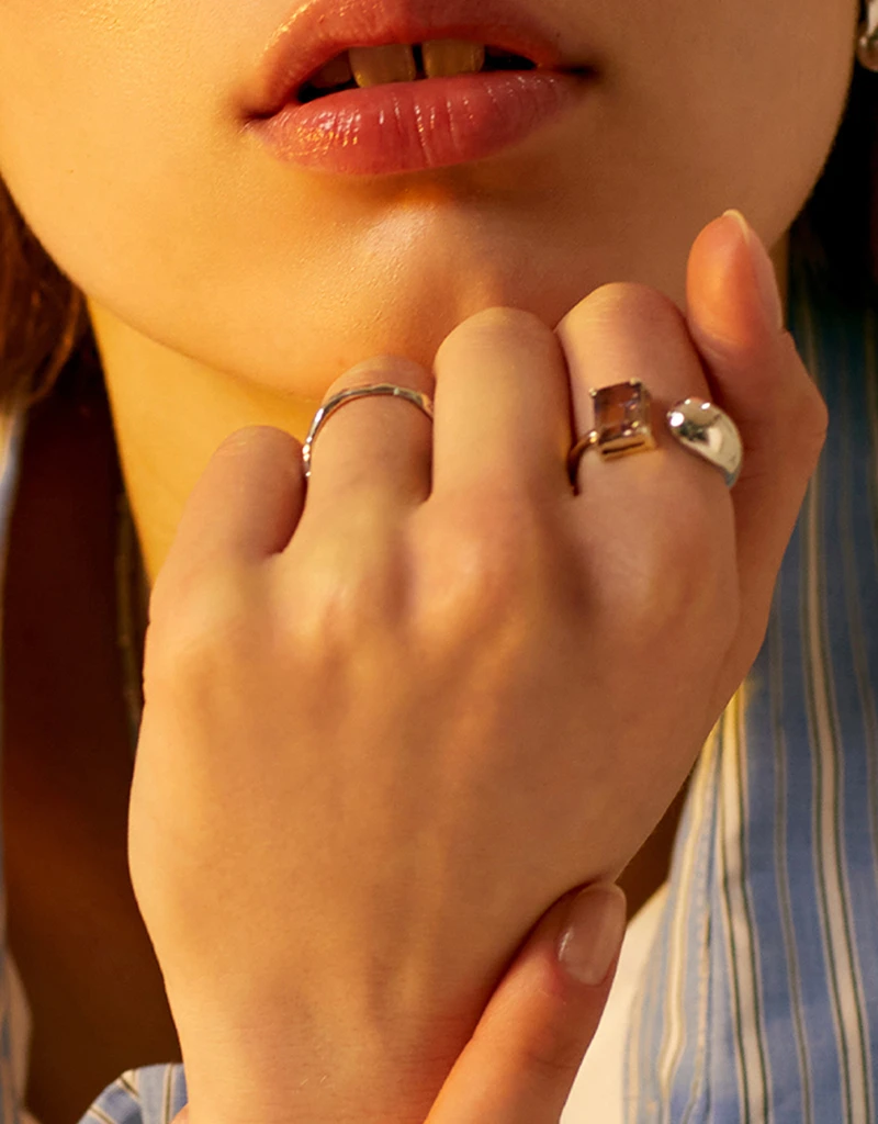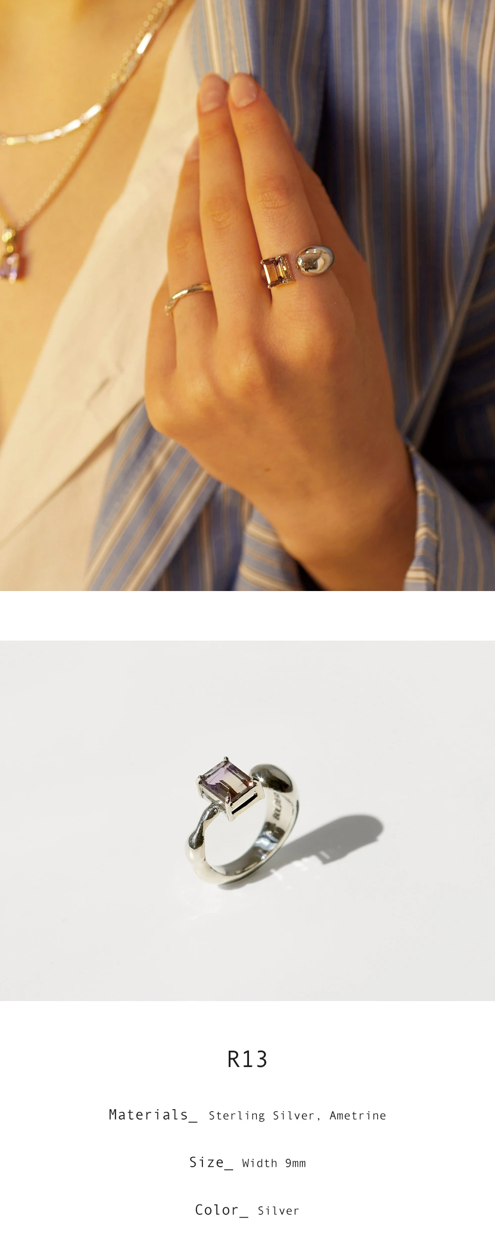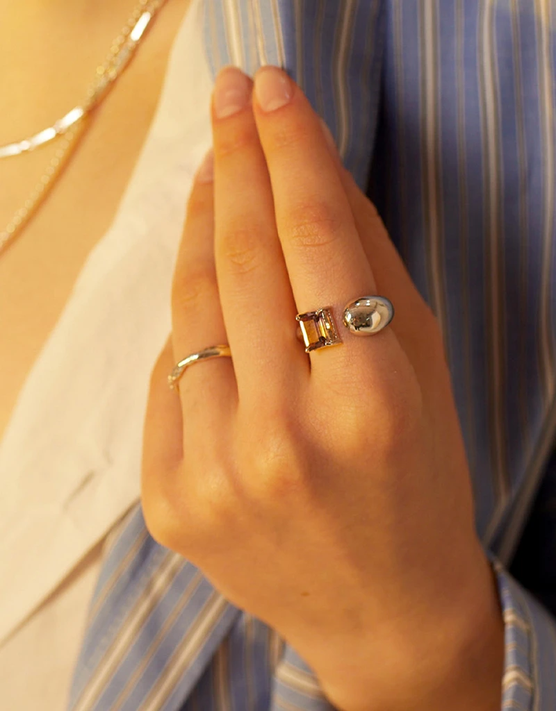 夕焼けの光を含んだような、透明感ときらめきを持つアメトリン原石をセッティングしたリング。 揺らぎを思わせる有機的なフォルムのリングに、さりげなくアメトリンをあしらいました。 シックでユニークな存在感があり、リングひとつでも特別なスタイリングを演出します。