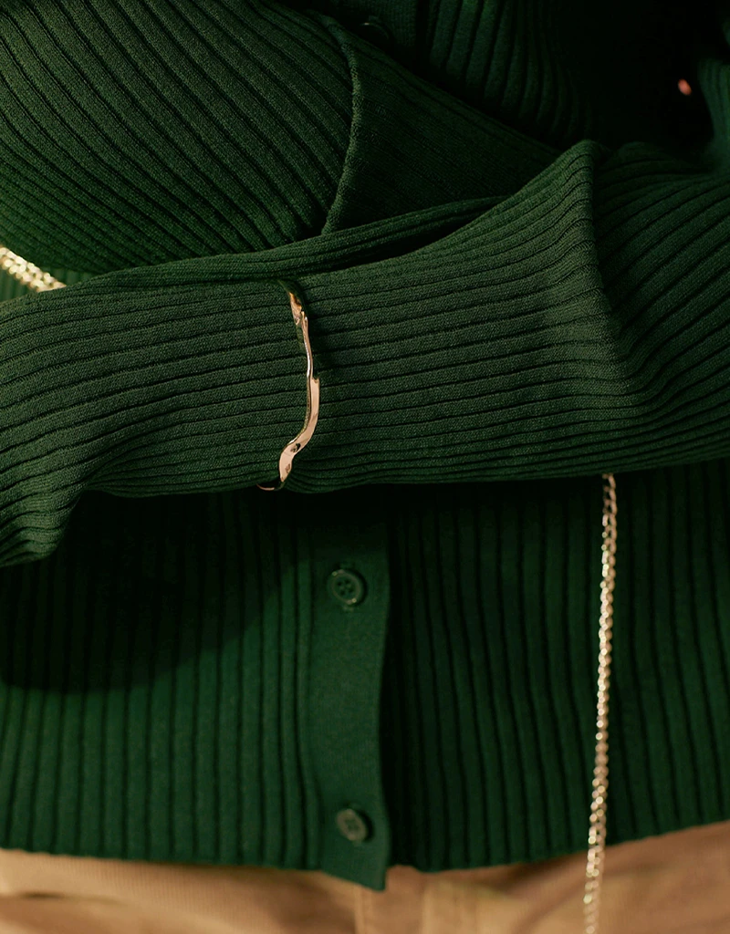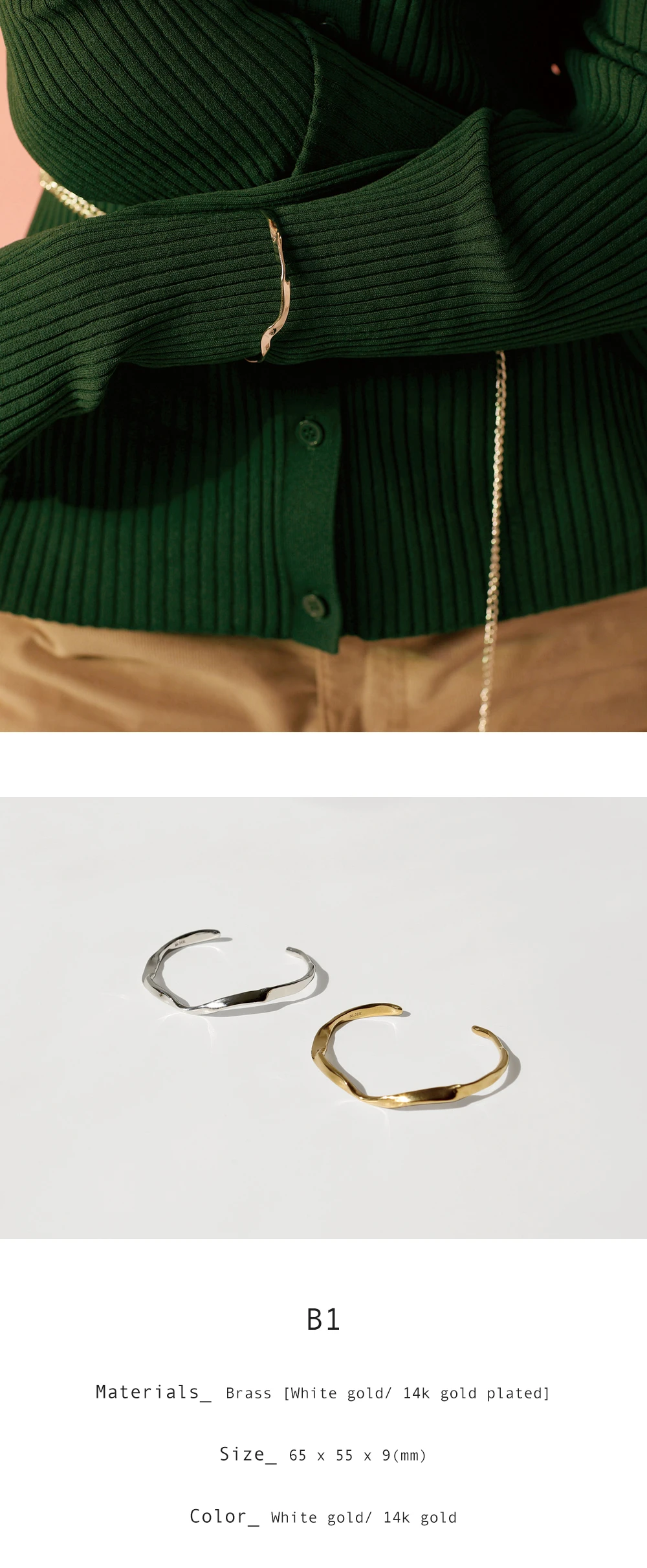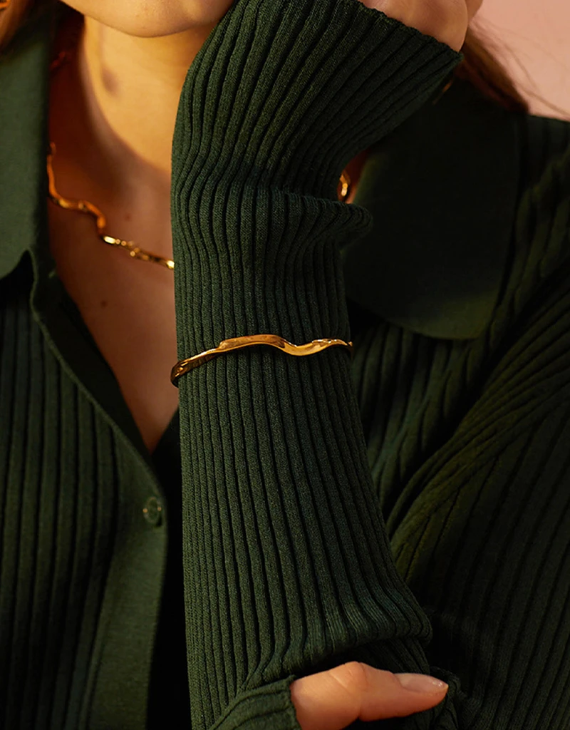 夕焼けの光がやわらかく揺らめく情景を表現したバングル。 揺らぎを思わせる曲面と、なめらかなカーブで手首を包み込むデザインが、シンプルさの中にユニークな存在感を添えます。