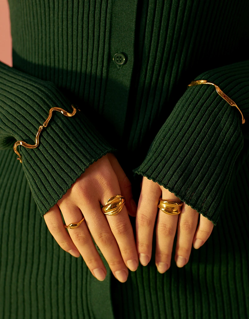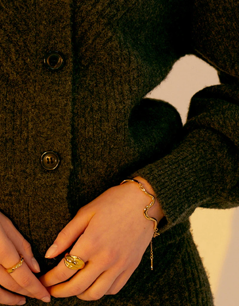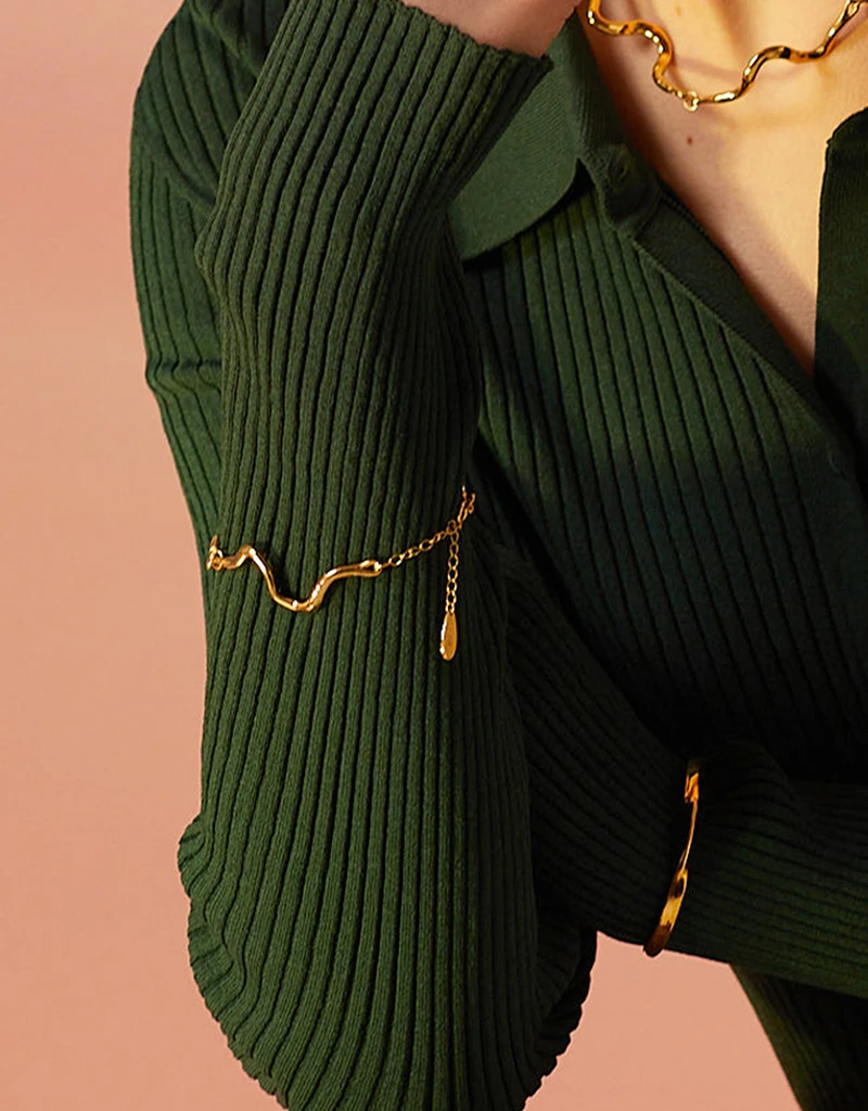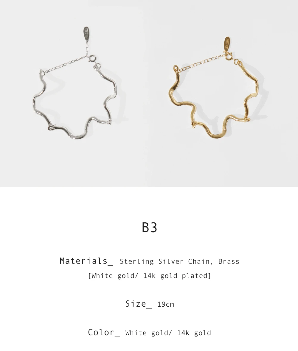 揺らめくフォルムをモチーフにデザインされたブレスレット。 有機的なシェイプのパーツが連なり、動くたびに繊細で美しい輝きを放ちます。 華奢でありながらユニークなデザインで、どんなコーディネートにもスタイリッシュなアクセントを添えます。