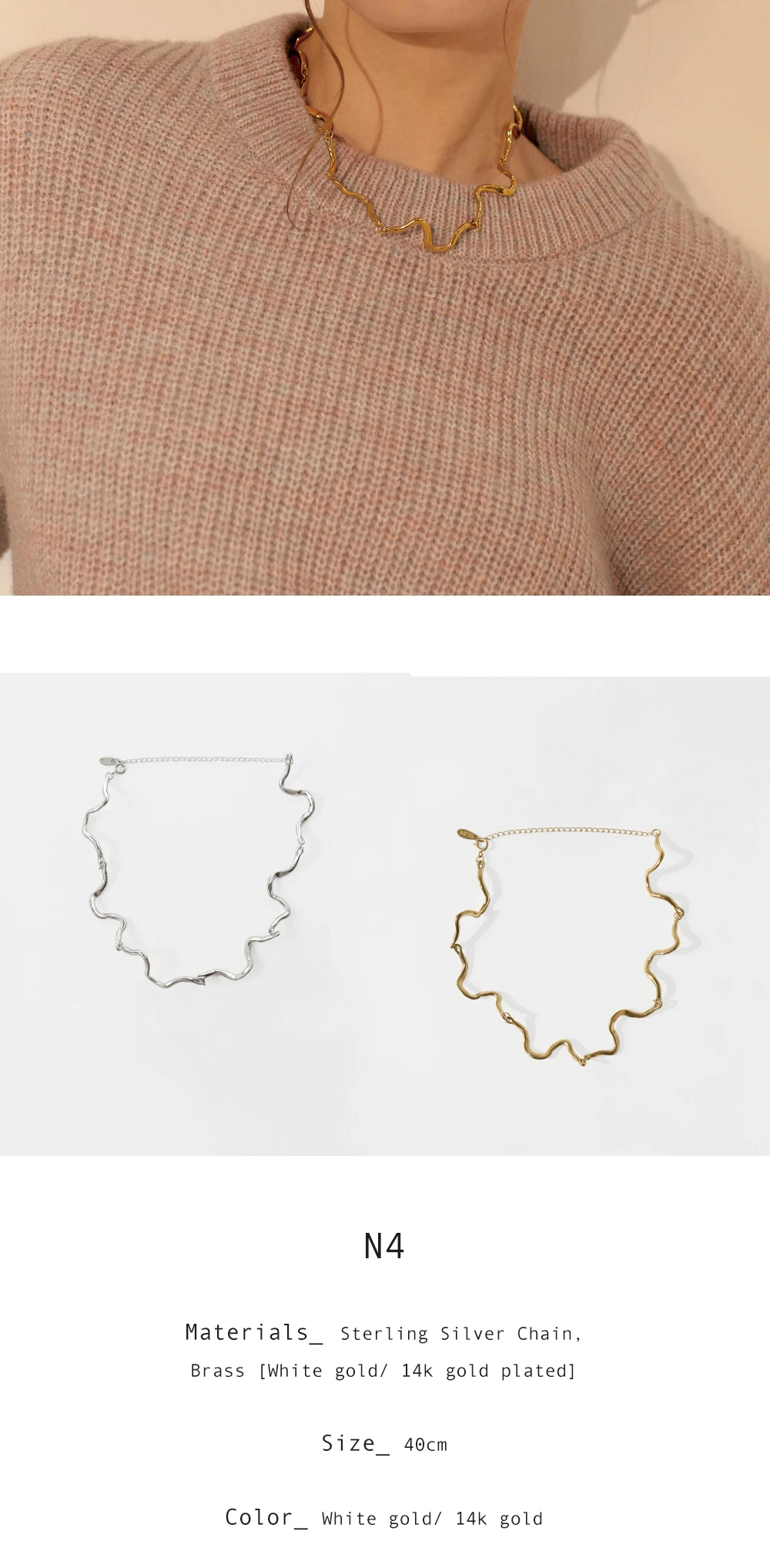 ゆらめくフォルムをモチーフにデザインされたネックレスです。 有機的なシェイプのパーツがそれぞれ連なり、首元に自然に沿うように美しく収まります。 各パーツに映る光が、やわらかく揺らめくような輝きを演出します。 チェーンで長さを調節でき、着用する長さに合わせてさまざまなスタイリングをお楽しみいただけます。