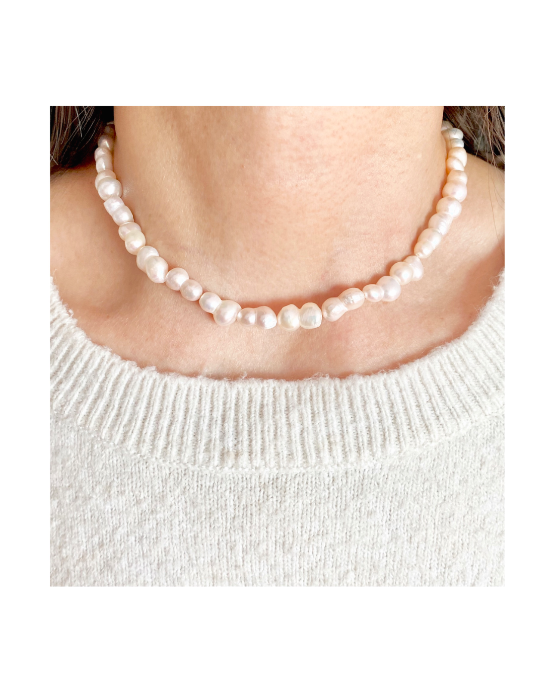 本商品は、一般的なイミテーションパールではなく、自然な艶と奥行きを持つ淡水パールを使用したネックレスです。
