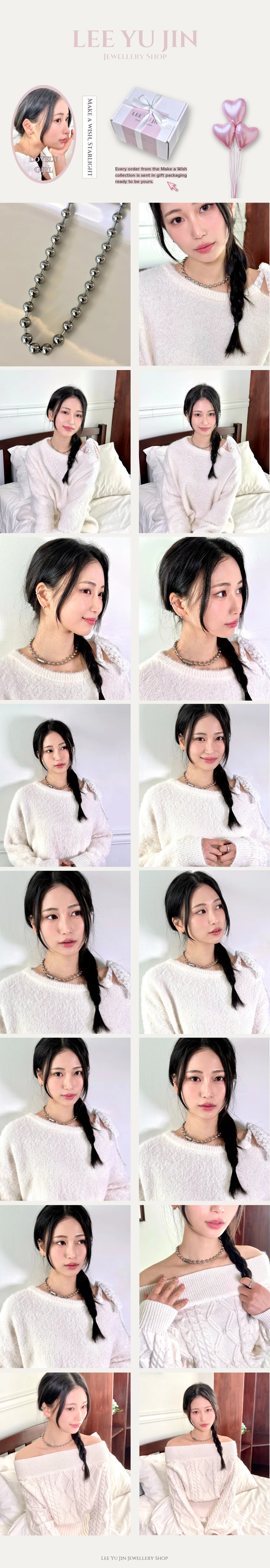 color: silver material: surgical steel 長さ:38cm+余裕チェーン5cm Comment: 厚みのあるボールチェーンで、一つだけ着けても ヒップなムードを完成させるクロップドディトチョーカーネックレスです。 無駄のないデザインとすっきりとしたクロージングで シンプルなコーディネートにもクールなポイントを加えてくれます。 サージカルスチール素材で変色の心配が少なく、 デイリー使いで気軽に楽しめるアイテムです。