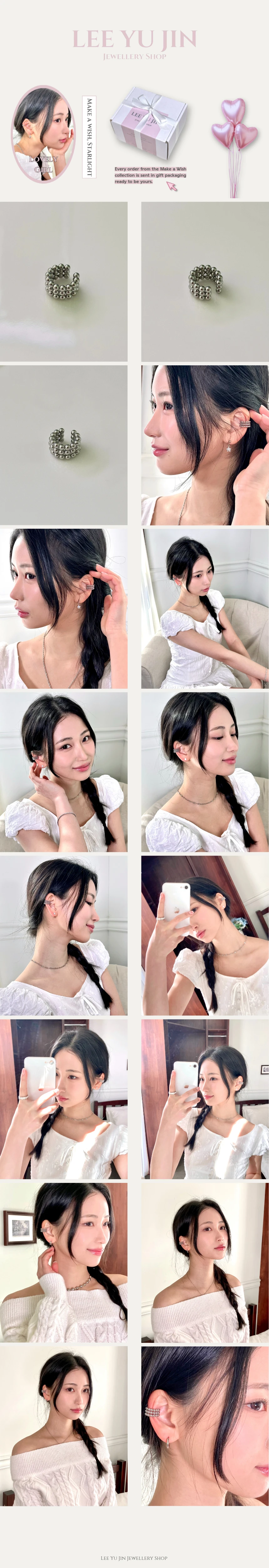 color: silver material: surgical steel Comment: 雲のように丸くつながったシルバーボール、 Cloud Ball Ear Cuffは 気軽にデイリーで楽しめるアイテムです。 丁度いいボリューム感で シンプルなコーディネートにも自然にポイントを加え、 どんなコーデにも柔らかく調和します。 軽く一つだけ着用しても完成し、 他のイヤーカフと一緒にレイヤードすると 自分だけのスタイルをつくることができます。 ■イヤーカフ着用ポイント イヤーカフは耳の縁に軽くかけて着用する 方法のノンピアスアクセサリーです。 耳介の薄い部分にかけて先に装着した後 ご希望の位置に移動させると簡単に付けることができます。 上記の方法での着用が難しい場合は、製品を少し広げて ご着用いただくと製品の着用が可能です。 もし着用時にややゆるい感じがする場合は、 製品を少し折り曲げていただくと、安定感のある着用が可能です。