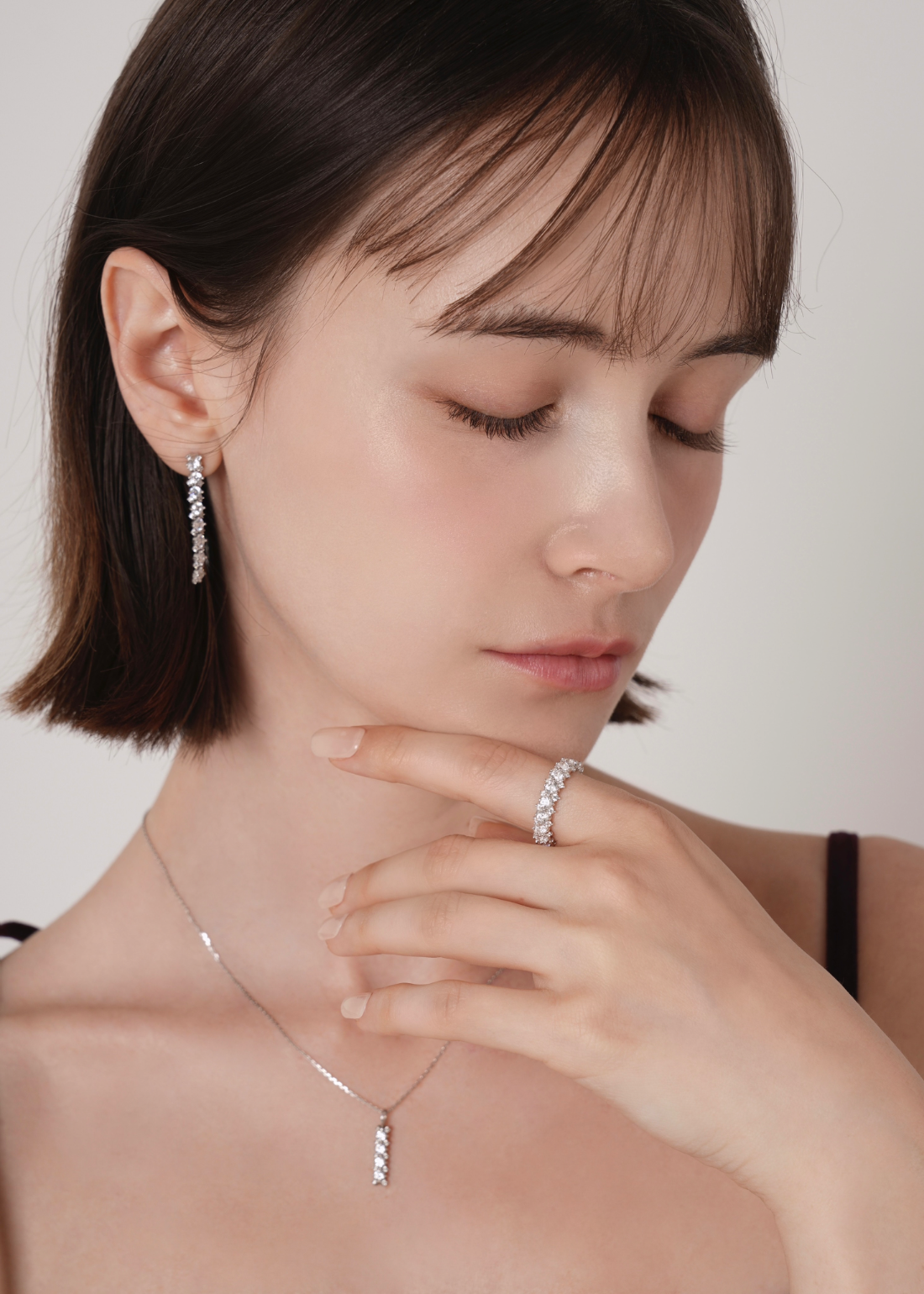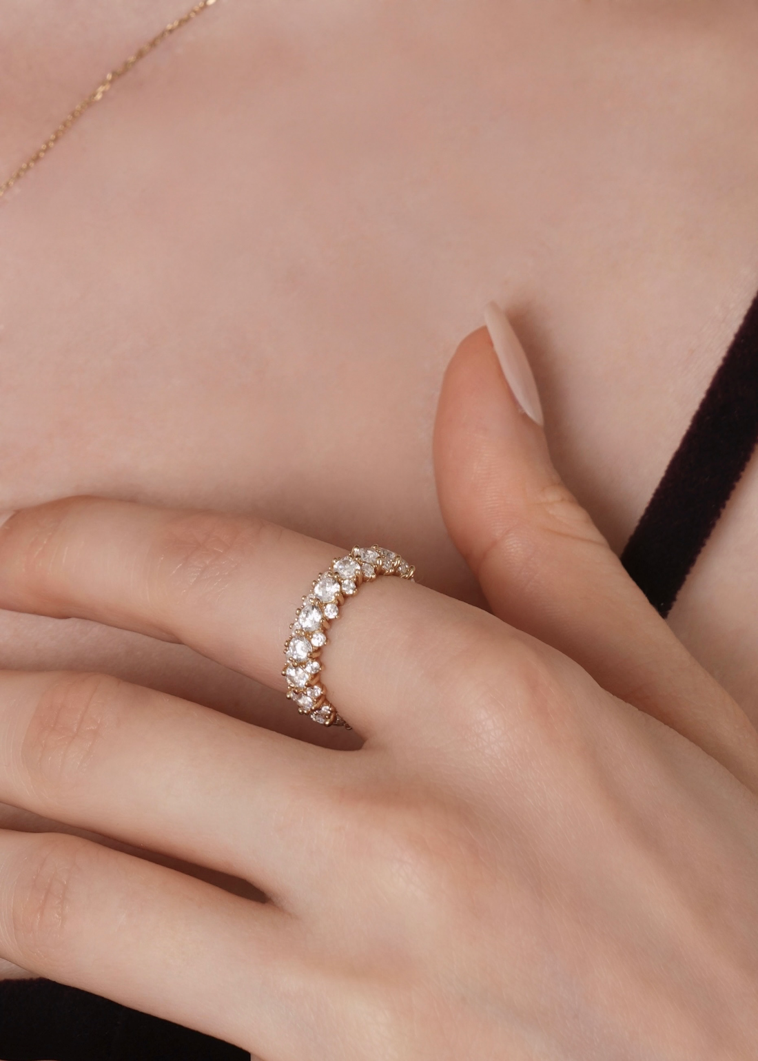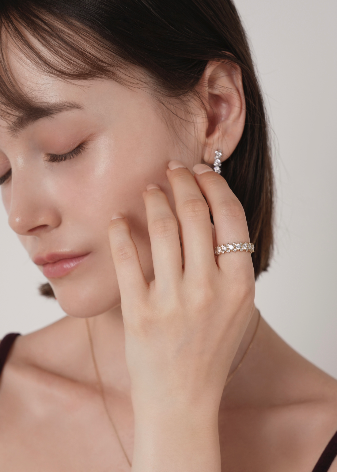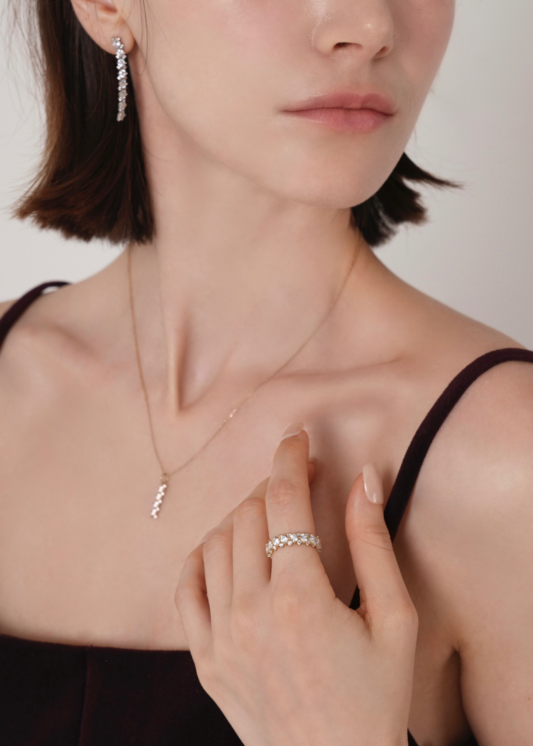 存在感のあるメインキュービックを中心に、両サイドには小さなキュービックを繊細に配置。どの角度から見ても自然に光が宿るよう設計されており、過度にならず、濃密な輝きを演出します。