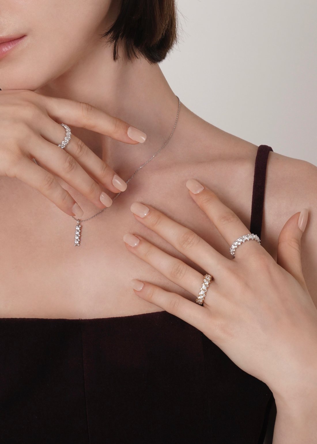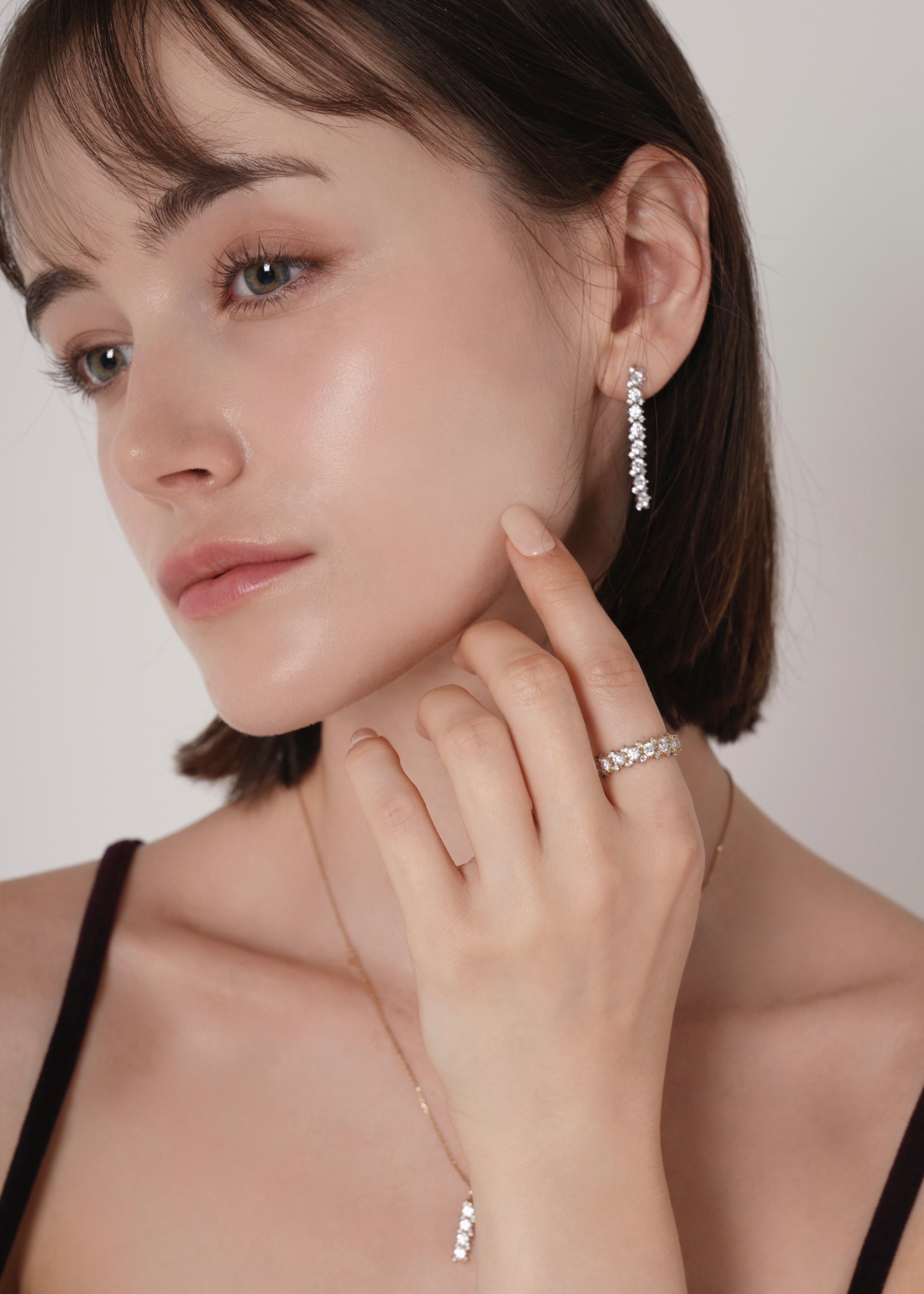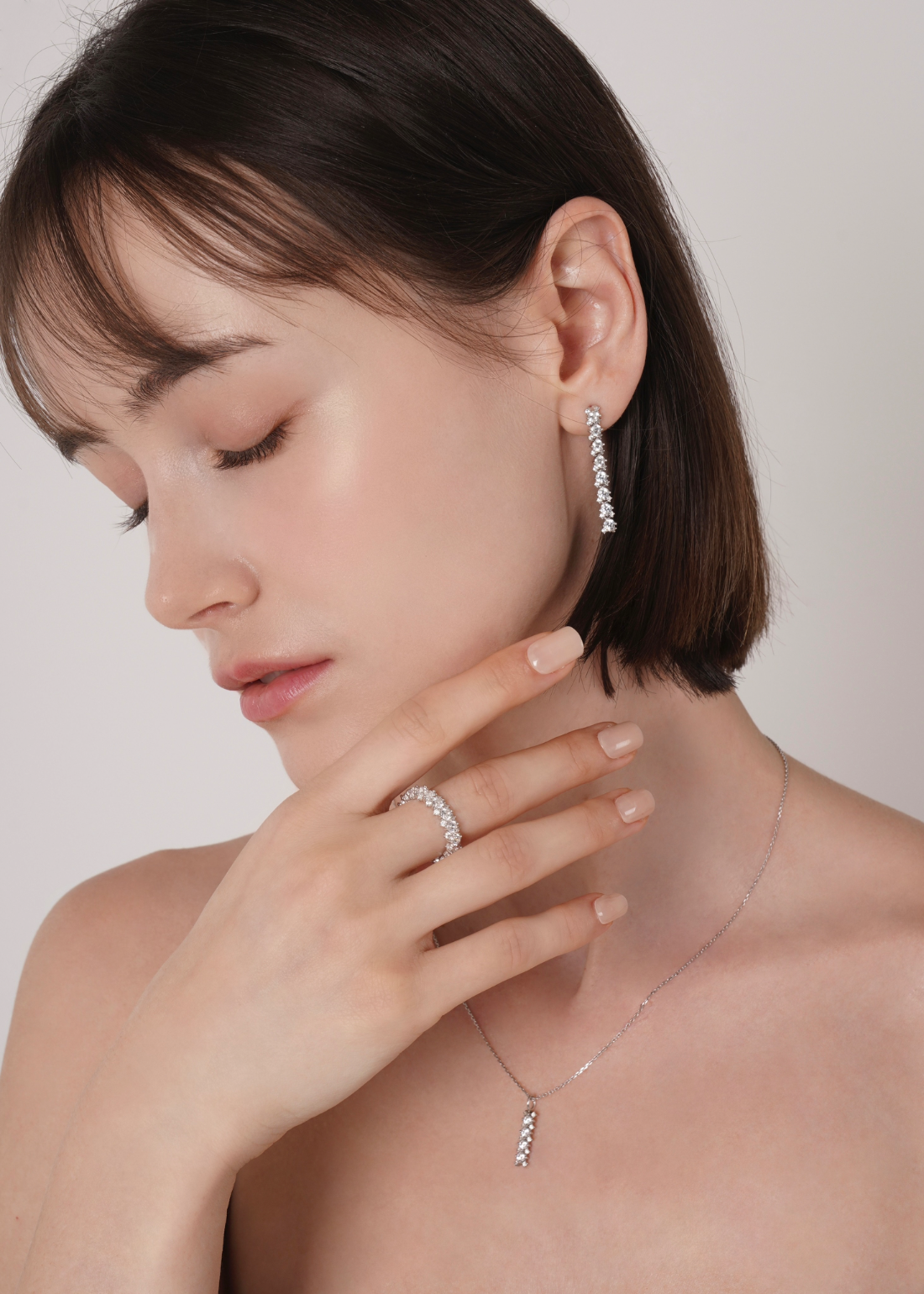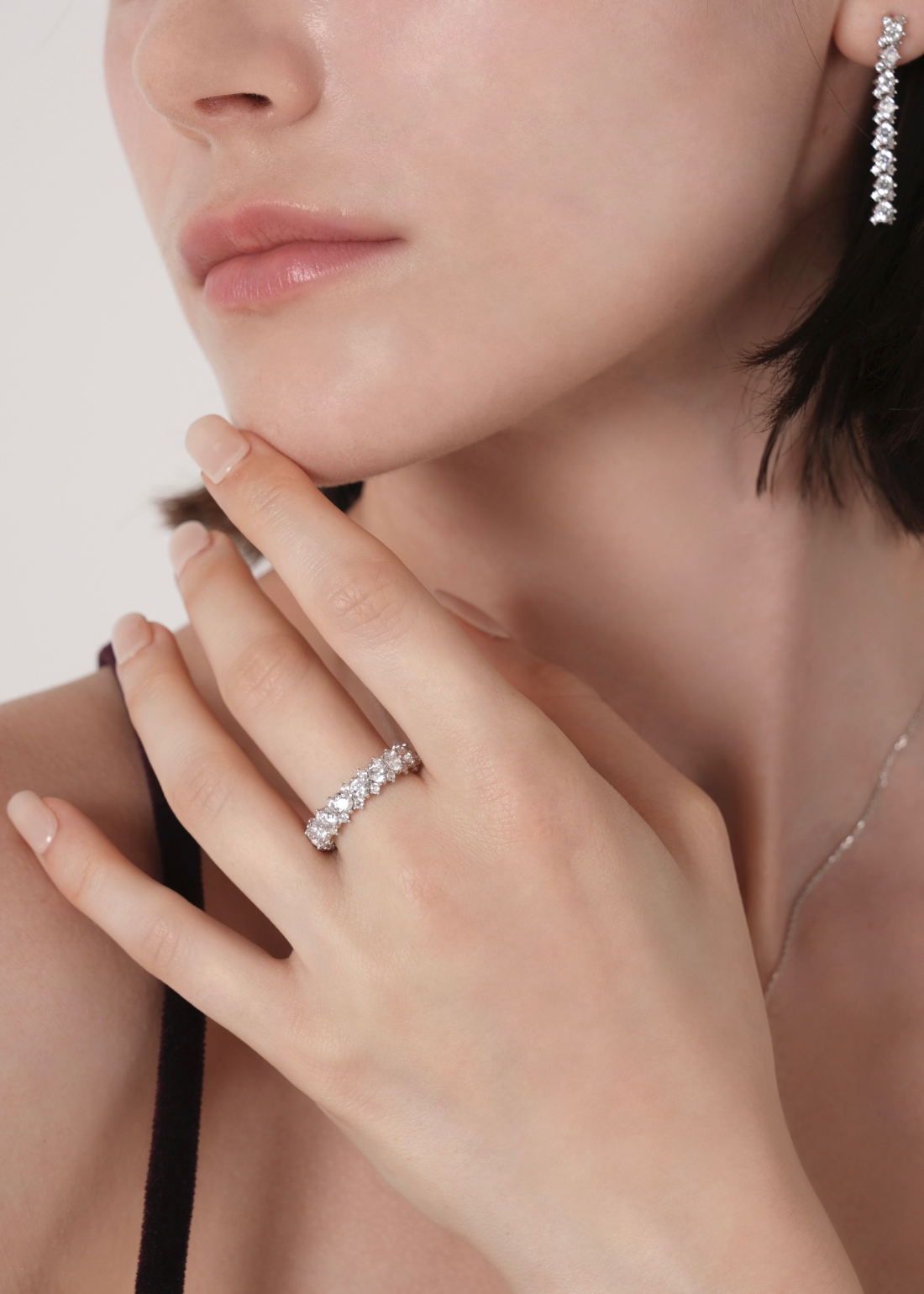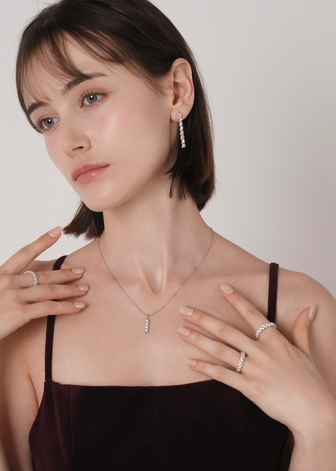 存在感のあるメインキュービックを中心に、両サイドには小さなキュービックを繊細に配置。どの角度から見ても自然に光が宿るよう設計されており、過度にならず、濃密な輝きを演出します。