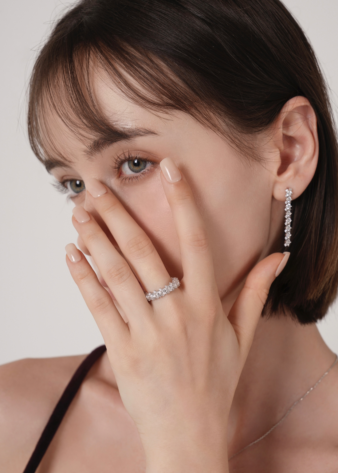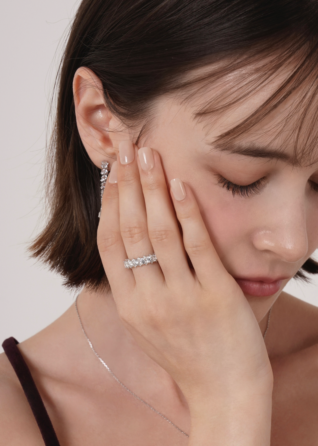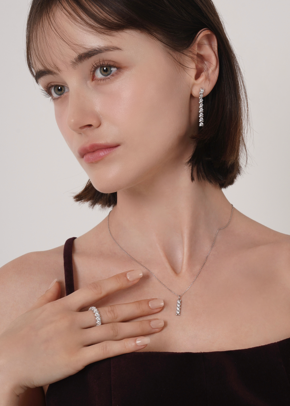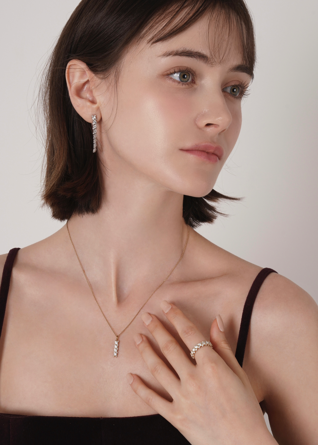 存在感のあるメインキュービックを中心に、両サイドには小さなキュービックを繊細に配置。どの角度から見ても自然に光が宿るよう設計されており、過度にならず、濃密な輝きを演出します。