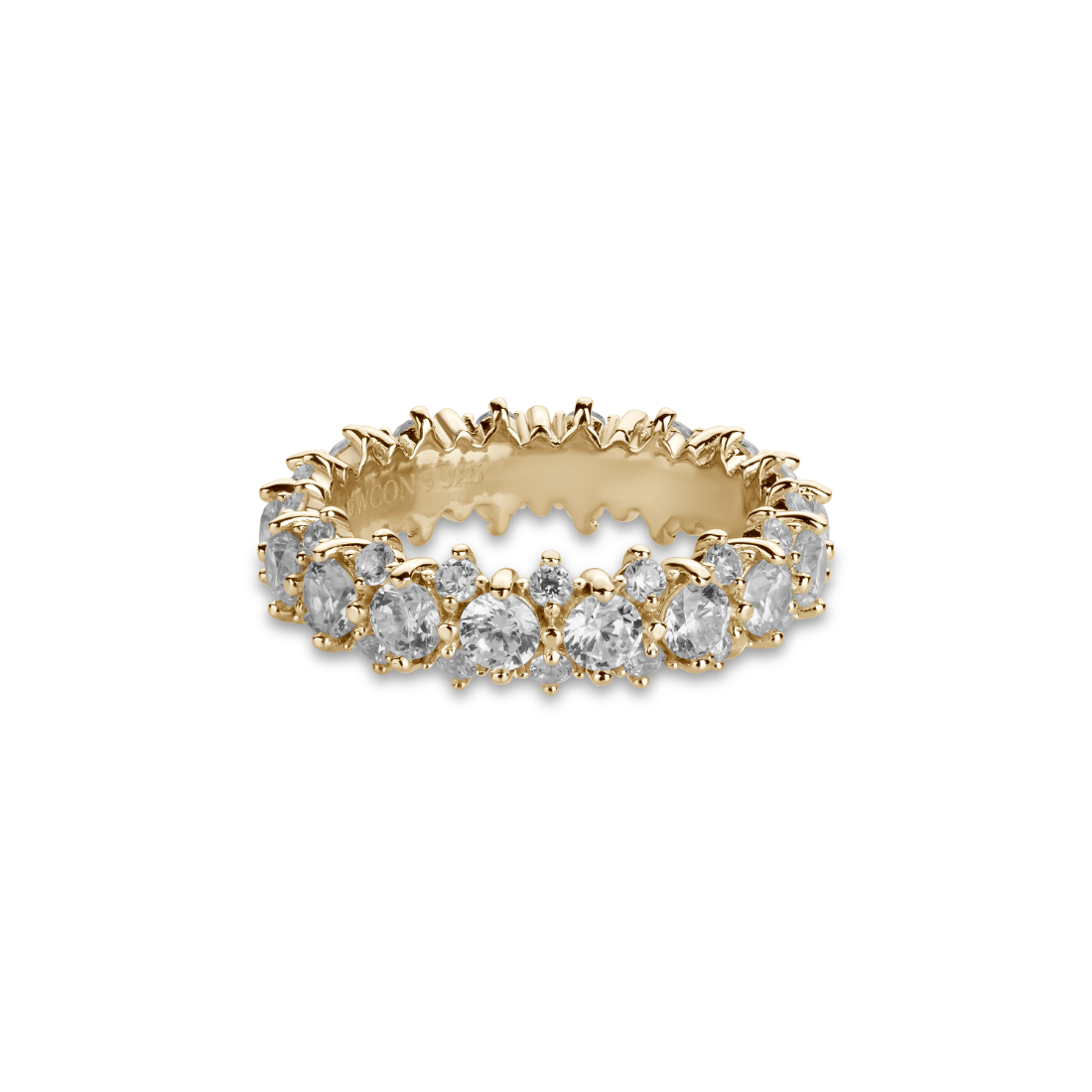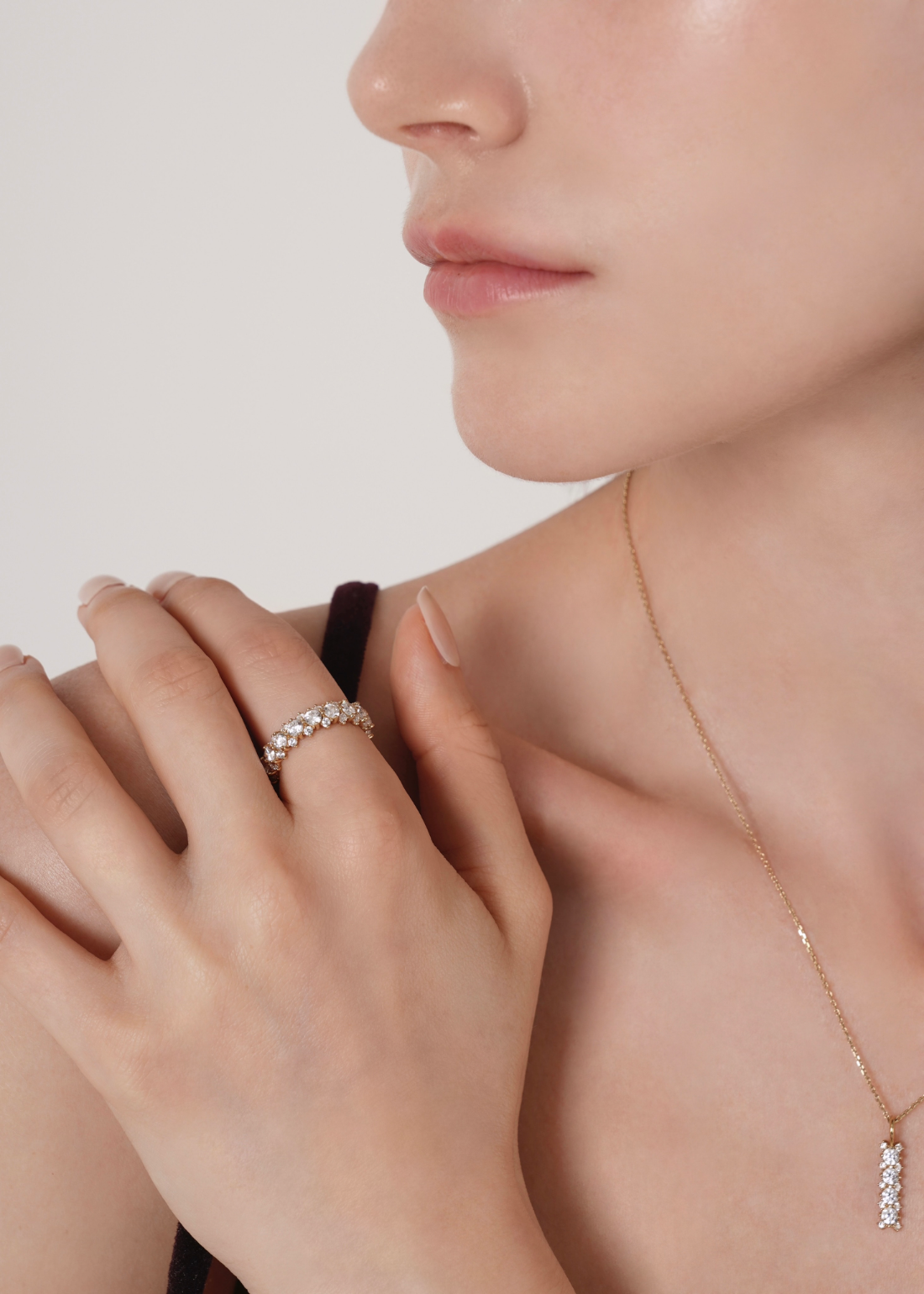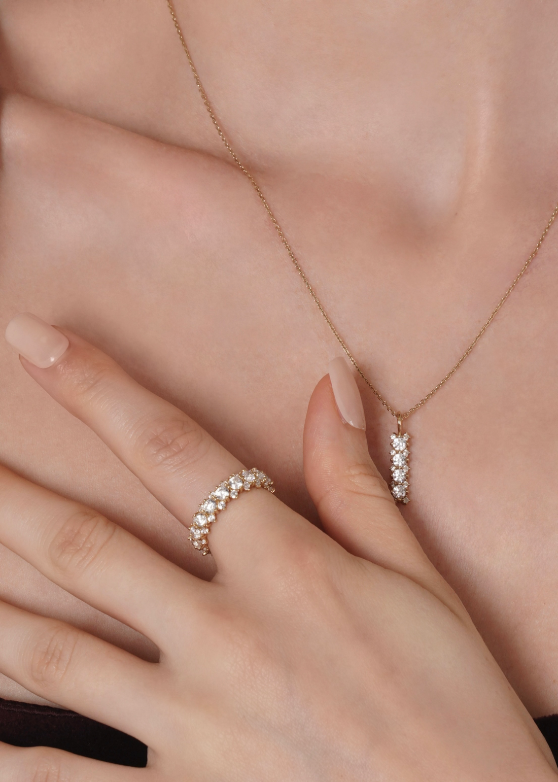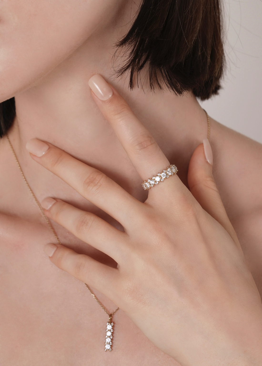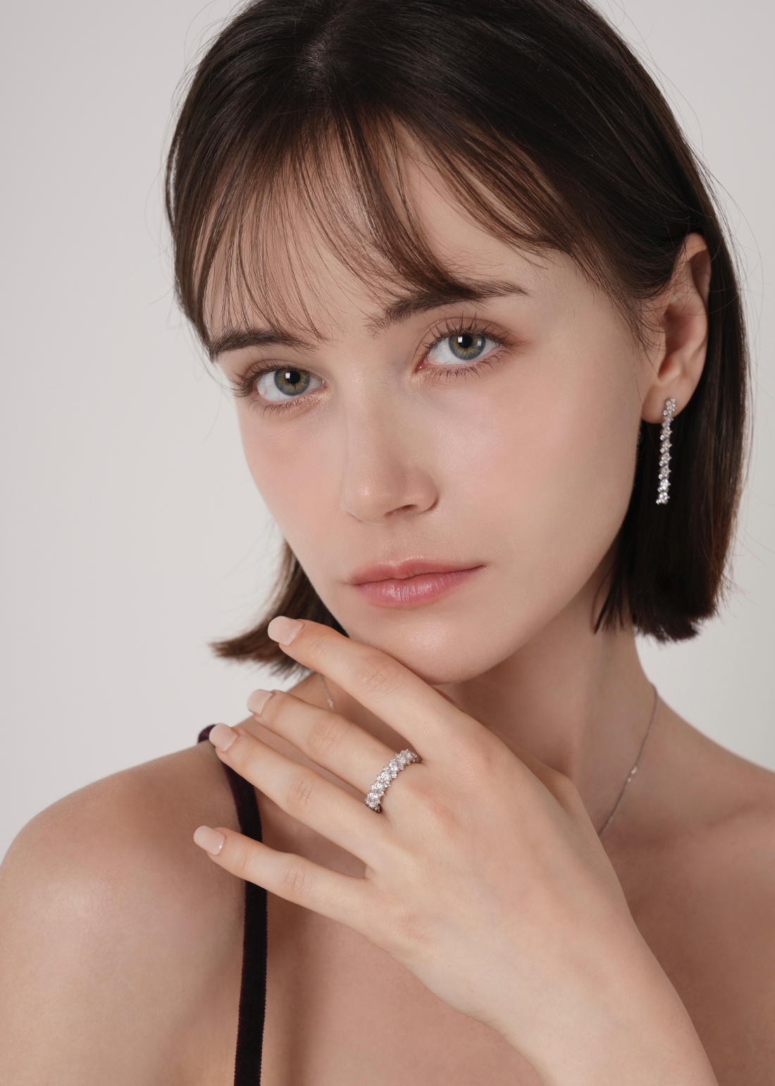 存在感のあるメインキュービックを中心に、両サイドには小さなキュービックを繊細に配置。どの角度から見ても自然に光が宿るよう設計されており、過度にならず、濃密な輝きを演出します。