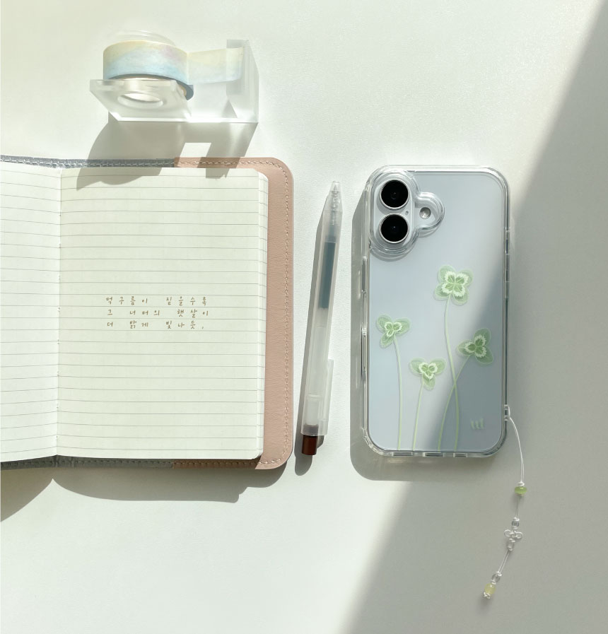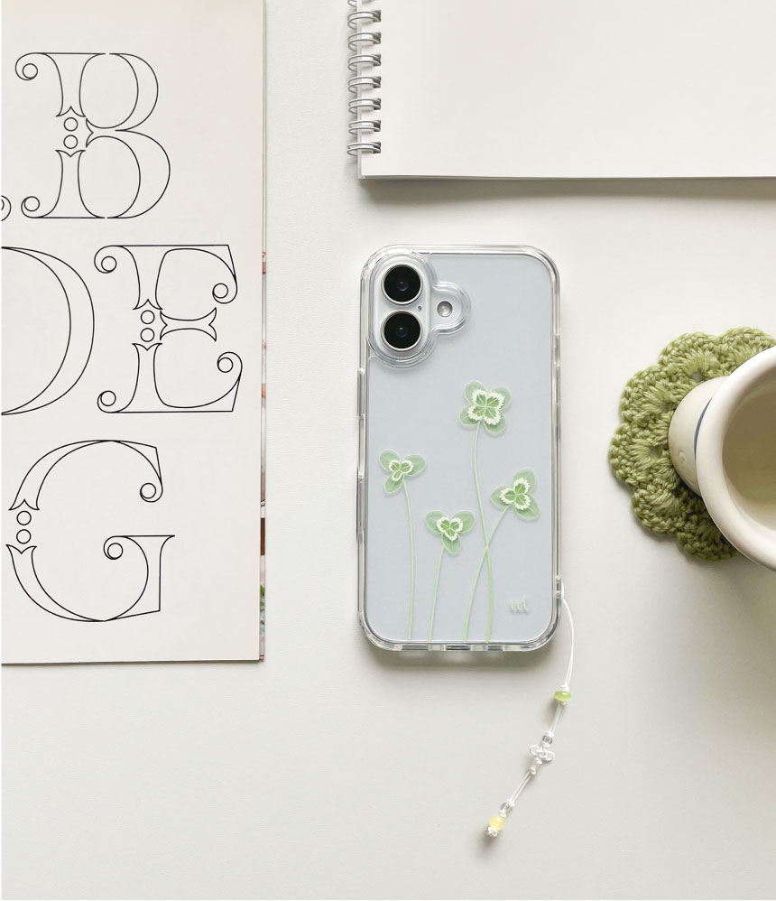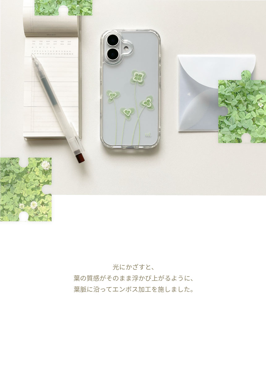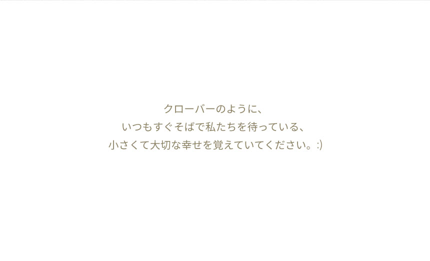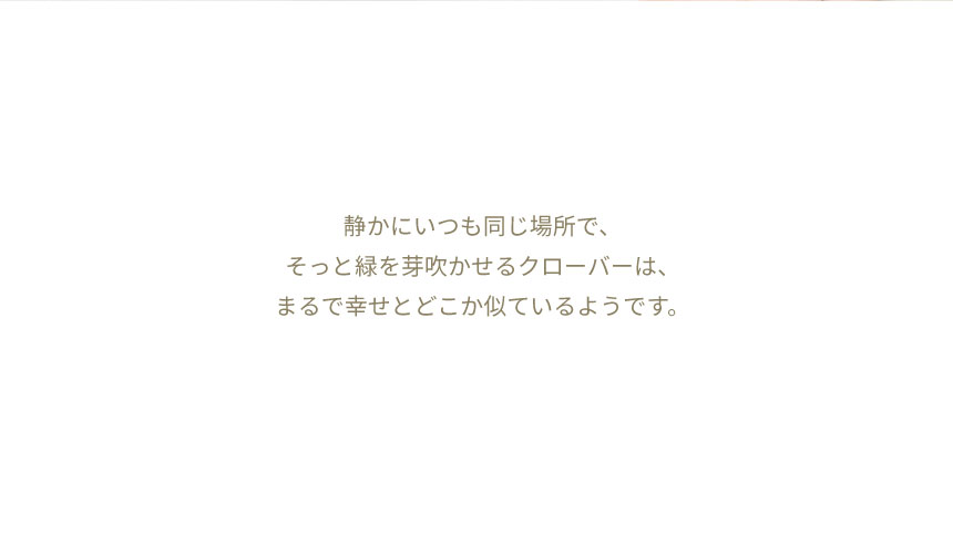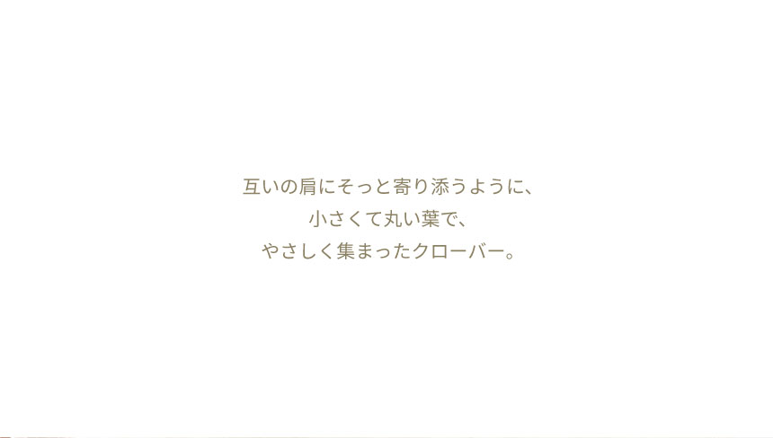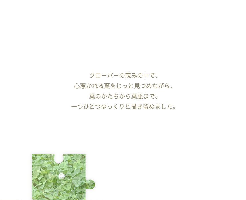 静かにいつも同じ場所で芽吹く緑のクローバーは、まるで幸せとよく似ているようです。心惹かれるクローバーの一つひとつを見つめながら、ゆっくりと丁寧に描き留めました。