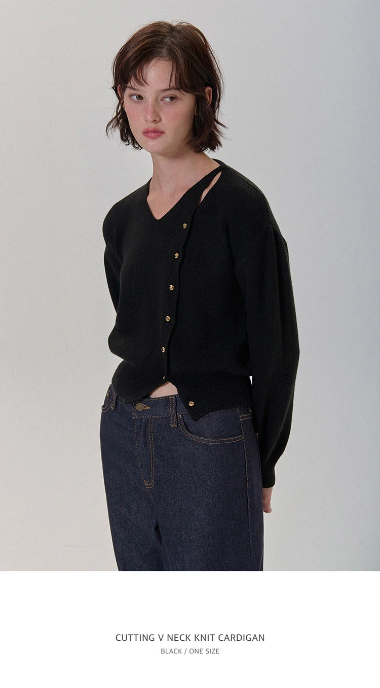 CUTTING V NECK KNIT CARDIGAN BLACK